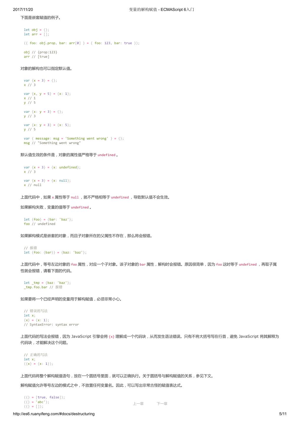 25 .2017/11/20 变量的解构赋值 - ECMAScript 6入门 下面是嵌套赋值的例子。 let obj = {}; let arr = []; ({ foo: obj.prop, bar: arr[0] } = { foo: 123, bar: true }); obj // {prop:123} arr // [true] 对象的解构也可以指定默认值。 var {x = 3} = {}; x // 3 var {x, y = 5} = {x: 1}; x // 1 y // 5 var {x: y = 3} = {}; y // 3 var {x: y = 3} = {x: 5}; y // 5 var { message: msg = 'Something went wrong' } = {}; msg // "Something went wrong" 默认值生效的条件是,对象的属性值严格等于 undefined 。 var {x = 3} = {x: undefined}; x // 3 var {x = 3} = {x: null}; x // null 上面代码中,如果 x 属性等于 null ,就不严格相等于 undefined ,导致默认值不会生效。 如果解构失败,变量的值等于 undefined 。 let {foo} = {bar: 'baz'}; foo // undefined 如果解构模式是嵌套的对象,而且子对象所在的父属性不存在,那么将会报错。 // 报错 let {foo: {bar}} = {baz: 'baz'}; 上面代码中,等号左边对象的 foo 属性,对应一个子对象。该子对象的 bar 属性,解构时会报错。原因很简单,因为 foo 这时等于 undefined ,再取子属 性就会报错,请看下面的代码。 let _tmp = {baz: 'baz'}; _tmp.foo.bar // 报错 如果要将一个已经声明的变量用于解构赋值,必须非常小心。 // 错误的写法 let x; {x} = {x: 1}; // SyntaxError: syntax error 上面代码的写法会报错,因为 JavaScript 引擎会将 {x} 理解成一个代码块,从而发生语法错误。只有不将大括号写在行首,避免 JavaScript 将其解释为 代码块,才能解决这个问题。 // 正确的写法 let x; ({x} = {x: 1}); 上面代码将整个解构赋值语句,放在一个圆括号里面,就可以正确执行。关于圆括号与解构赋值的关系,参见下文。 解构赋值允许等号左边的模式之中,不放置任何变量名。因此,可以写出非常古怪的赋值表达式。 ({} = [true, false]); ({} = 'abc'); 上一章 下一章 ({} = []); http://es6.ruanyifeng.com/#docs/destructuring 5/11
