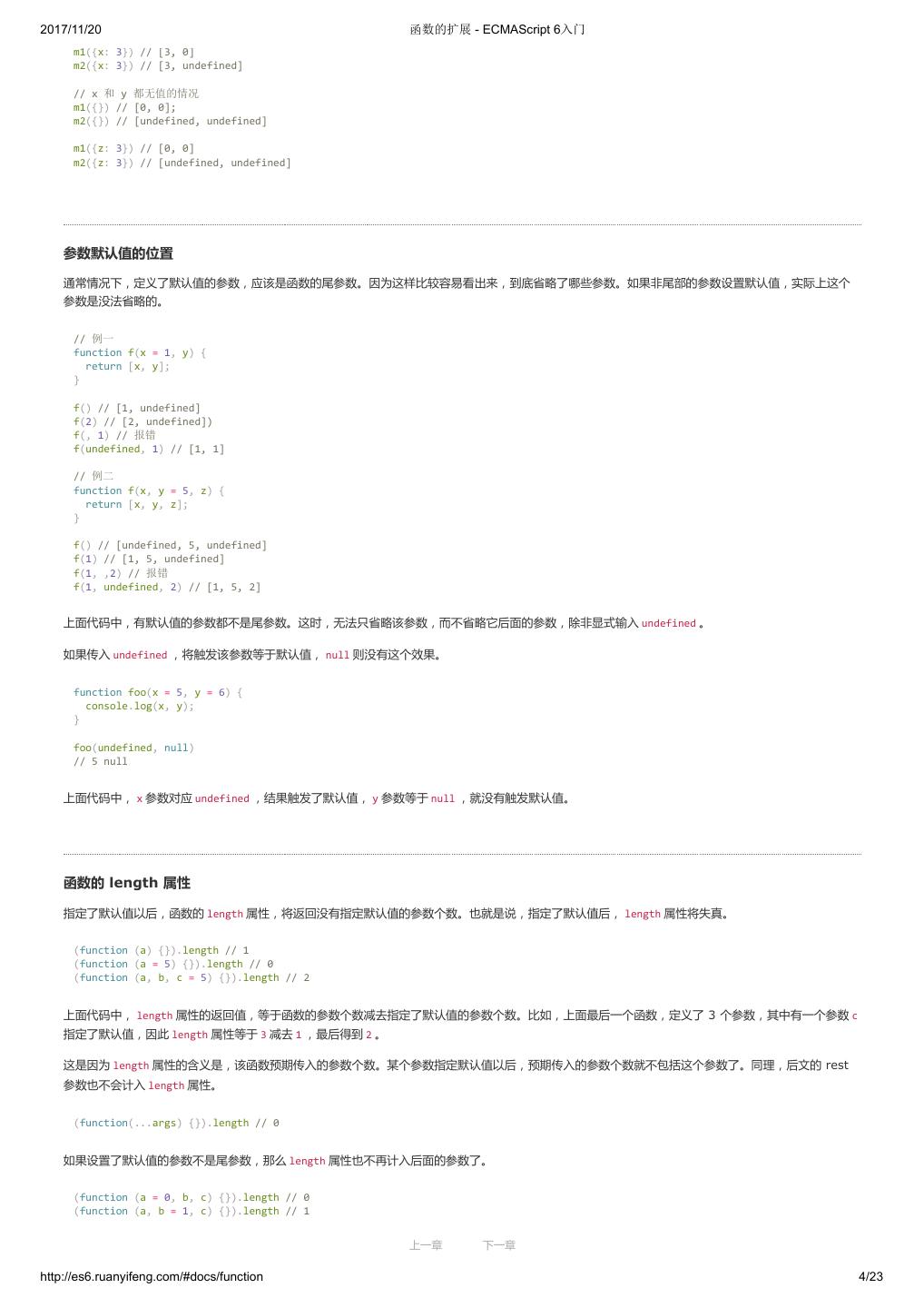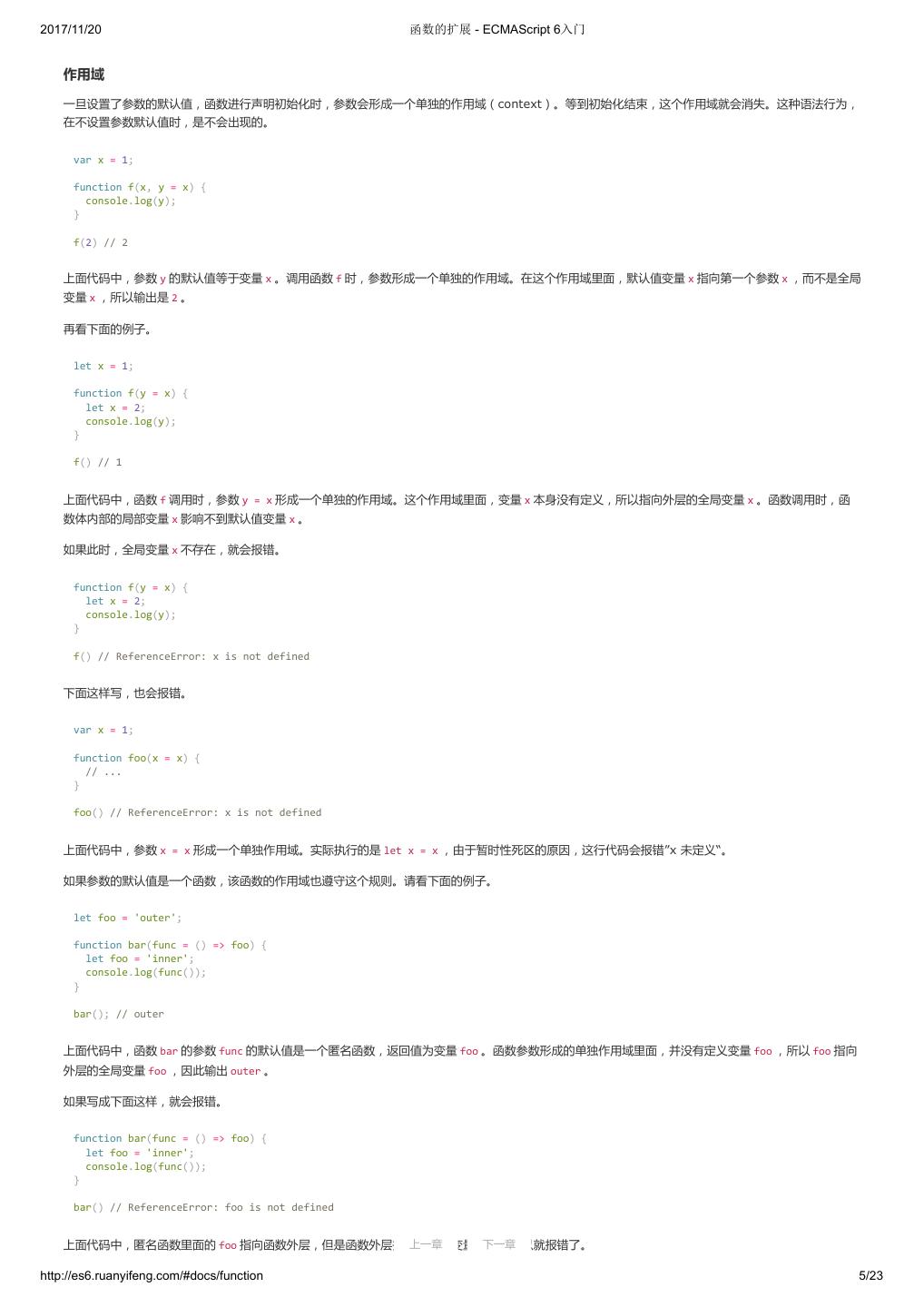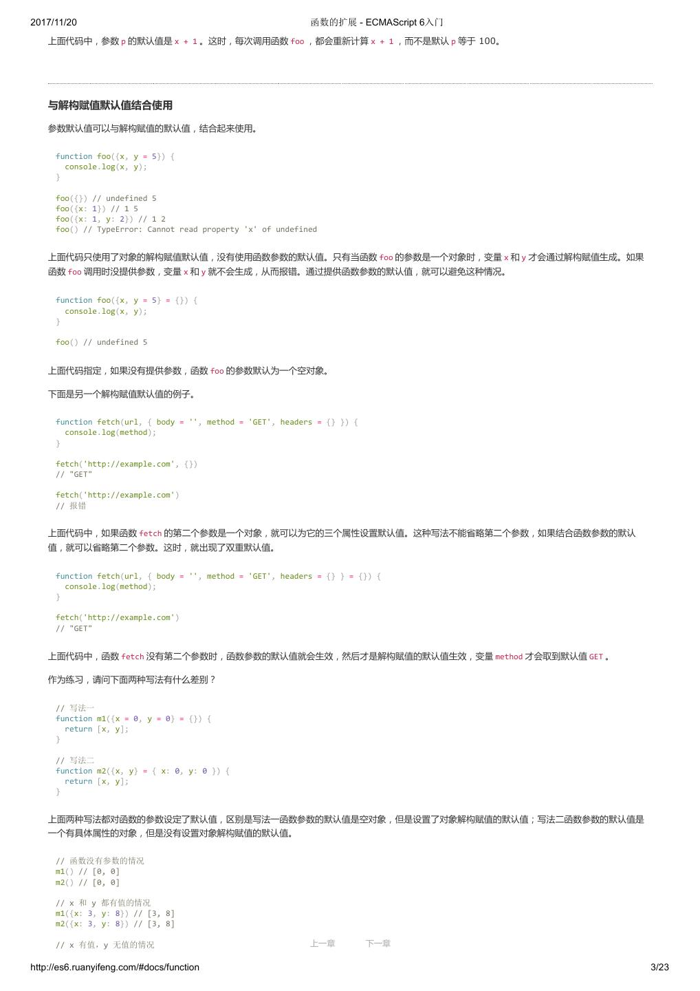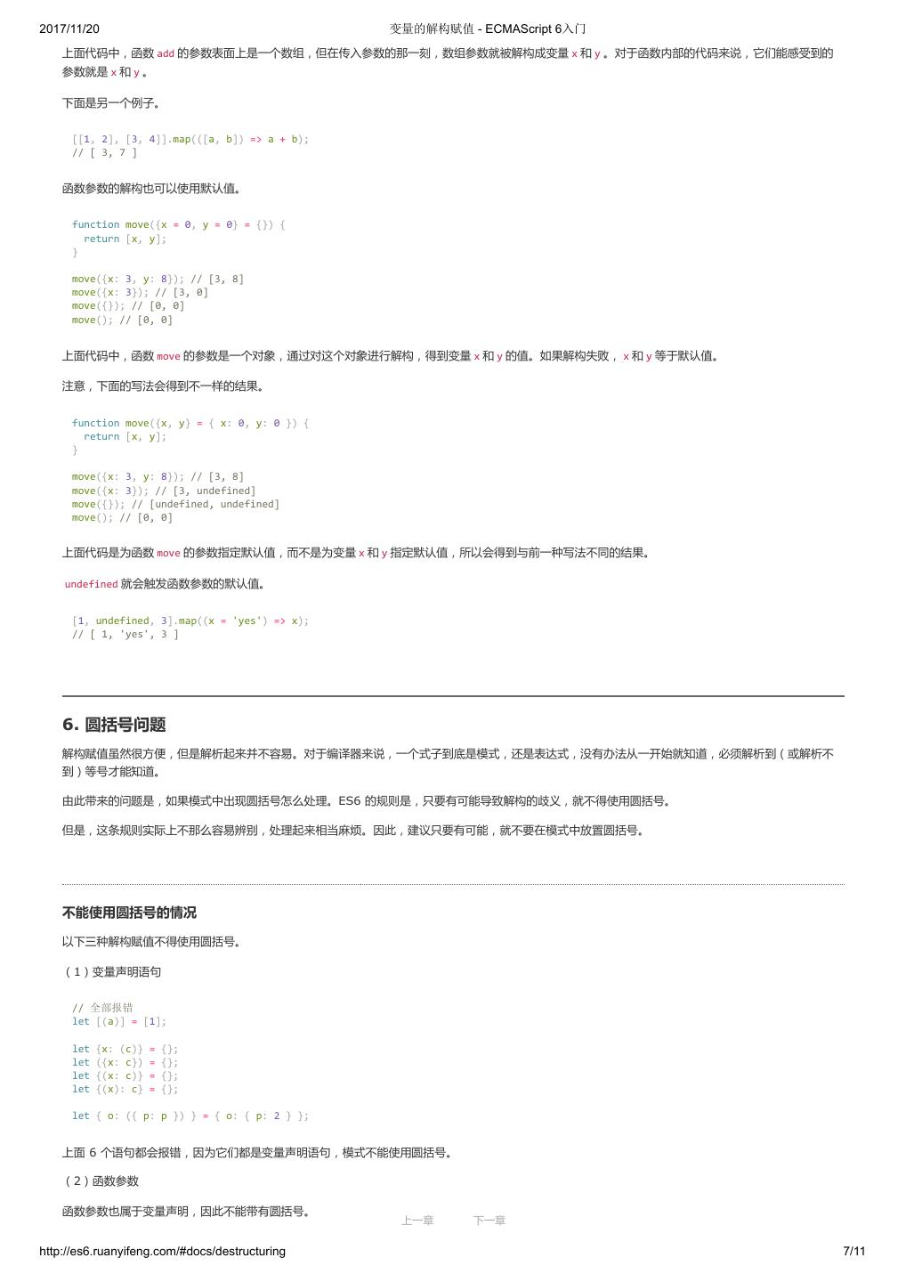 27 .2017/11/20 变量的解构赋值 - ECMAScript 6入门 上面代码中,函数 add 的参数表面上是一个数组,但在传入参数的那一刻,数组参数就被解构成变量 x 和 y 。对于函数内部的代码来说,它们能感受到的 参数就是 x 和 y 。 下面是另一个例子。 [[1, 2], [3, 4]].map(([a, b]) => a + b); // [ 3, 7 ] 函数参数的解构也可以使用默认值。 function move({x = 0, y = 0} = {}) { return [x, y]; } move({x: 3, y: 8}); // [3, 8] move({x: 3}); // [3, 0] move({}); // [0, 0] move(); // [0, 0] 上面代码中,函数 move 的参数是一个对象,通过对这个对象进行解构,得到变量 x 和 y 的值。如果解构失败, x 和 y 等于默认值。 注意,下面的写法会得到不一样的结果。 function move({x, y} = { x: 0, y: 0 }) { return [x, y]; } move({x: 3, y: 8}); // [3, 8] move({x: 3}); // [3, undefined] move({}); // [undefined, undefined] move(); // [0, 0] 上面代码是为函数 move 的参数指定默认值,而不是为变量 x 和 y 指定默认值,所以会得到与前一种写法不同的结果。 undefined 就会触发函数参数的默认值。 [1, undefined, 3].map((x = 'yes') => x); // [ 1, 'yes', 3 ] 6. 圆括号问题 解构赋值虽然很方便,但是解析起来并不容易。对于编译器来说,一个式子到底是模式,还是表达式,没有办法从一开始就知道,必须解析到(或解析不 到)等号才能知道。 由此带来的问题是,如果模式中出现圆括号怎么处理。ES6 的规则是,只要有可能导致解构的歧义,就不得使用圆括号。 但是,这条规则实际上不那么容易辨别,处理起来相当麻烦。因此,建议只要有可能,就不要在模式中放置圆括号。 不能使用圆括号的情况 以下三种解构赋值不得使用圆括号。 (1)变量声明语句 // 全部报错 let [(a)] = [1]; let {x: (c)} = {}; let ({x: c}) = {}; let {(x: c)} = {}; let {(x): c} = {}; let { o: ({ p: p }) } = { o: { p: 2 } }; 上面 6 个语句都会报错,因为它们都是变量声明语句,模式不能使用圆括号。 (2)函数参数 函数参数也属于变量声明,因此不能带有圆括号。 上一章 下一章 http://es6.ruanyifeng.com/#docs/destructuring 7/11