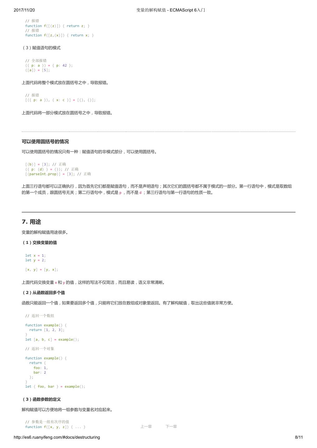 28 .2017/11/20 变量的解构赋值 - ECMAScript 6入门 // 报错 function f([(z)]) { return z; } // 报错 function f([z,(x)]) { return x; } (3)赋值语句的模式 // 全部报错 ({ p: a }) = { p: 42 }; ([a]) = [5]; 上面代码将整个模式放在圆括号之中,导致报错。 // 报错 [({ p: a }), { x: c }] = [{}, {}]; 上面代码将一部分模式放在圆括号之中,导致报错。 可以使用圆括号的情况 可以使用圆括号的情况只有一种:赋值语句的非模式部分,可以使用圆括号。 [(b)] = [3]; // 正确 ({ p: (d) } = {}); // 正确 [(parseInt.prop)] = [3]; // 正确 上面三行语句都可以正确执行,因为首先它们都是赋值语句,而不是声明语句;其次它们的圆括号都不属于模式的一部分。第一行语句中,模式是取数组 的第一个成员,跟圆括号无关;第二行语句中,模式是 p ,而不是 d ;第三行语句与第一行语句的性质一致。 7. 用途 变量的解构赋值用途很多。 (1)交换变量的值 let x = 1; let y = 2; [x, y] = [y, x]; 上面代码交换变量 x 和 y 的值,这样的写法不仅简洁,而且易读,语义非常清晰。 (2)从函数返回多个值 函数只能返回一个值,如果要返回多个值,只能将它们放在数组或对象里返回。有了解构赋值,取出这些值就非常方便。 // 返回一个数组 function example() { return [1, 2, 3]; } let [a, b, c] = example(); // 返回一个对象 function example() { return { foo: 1, bar: 2 }; } let { foo, bar } = example(); (3)函数参数的定义 解构赋值可以方便地将一组参数与变量名对应起来。 // 参数是一组有次序的值 function f([x, y, z]) { ... } 上一章 下一章 http://es6.ruanyifeng.com/#docs/destructuring 8/11