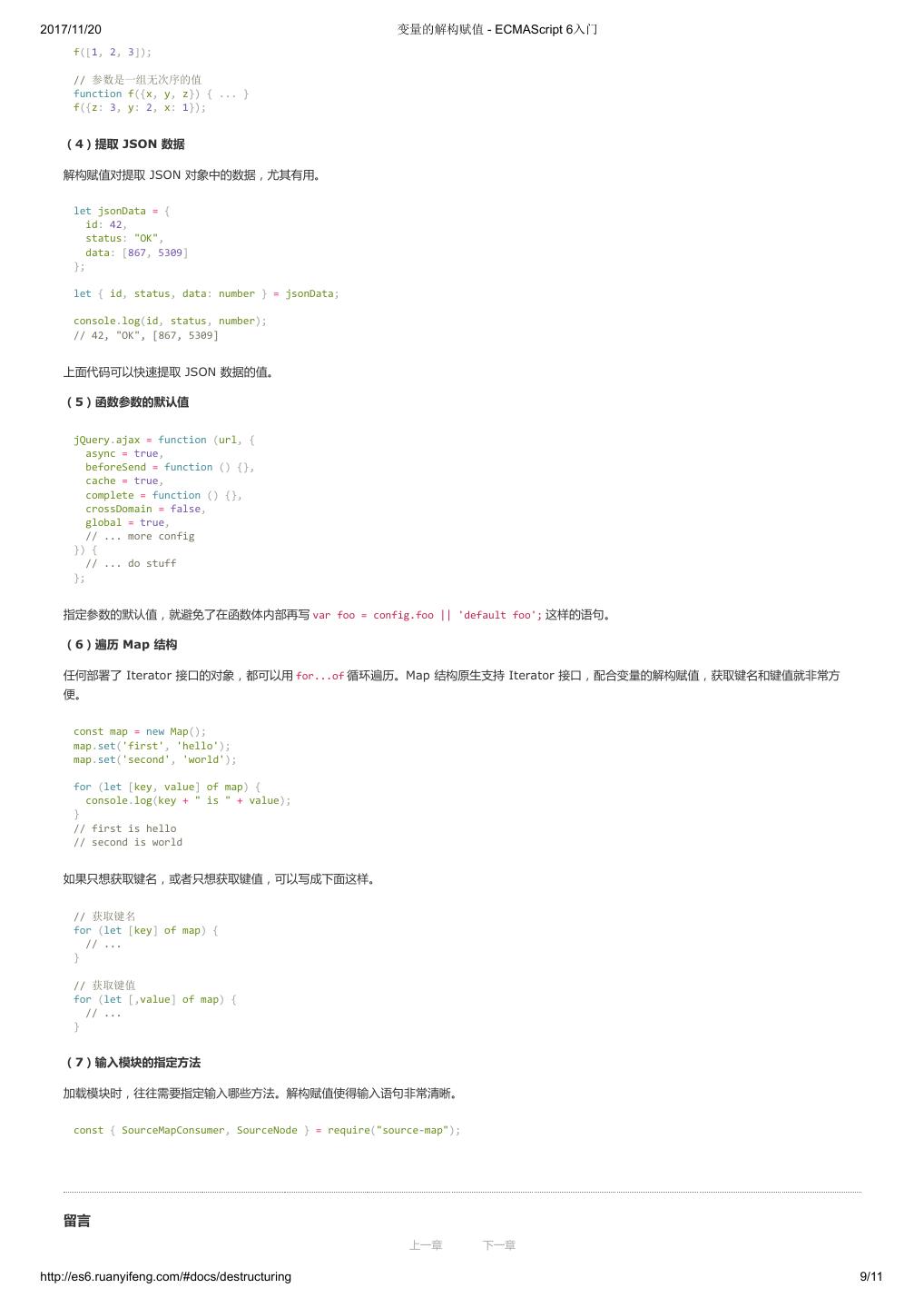 29 .2017/11/20 变量的解构赋值 - ECMAScript 6入门 f([1, 2, 3]); // 参数是一组无次序的值 function f({x, y, z}) { ... } f({z: 3, y: 2, x: 1}); (4)提取 JSON 数据 解构赋值对提取 JSON 对象中的数据,尤其有用。 let jsonData = { id: 42, status: "OK", data: [867, 5309] }; let { id, status, data: number } = jsonData; console.log(id, status, number); // 42, "OK", [867, 5309] 上面代码可以快速提取 JSON 数据的值。 (5)函数参数的默认值 jQuery.ajax = function (url, { async = true, beforeSend = function () {}, cache = true, complete = function () {}, crossDomain = false, global = true, // ... more config }) { // ... do stuff }; 指定参数的默认值,就避免了在函数体内部再写 var foo = config.foo || 'default foo'; 这样的语句。 (6)遍历 Map 结构 任何部署了 Iterator 接口的对象,都可以用 for...of 循环遍历。Map 结构原生支持 Iterator 接口,配合变量的解构赋值,获取键名和键值就非常方 便。 const map = new Map(); map.set('first', 'hello'); map.set('second', 'world'); for (let [key, value] of map) { console.log(key + " is " + value); } // first is hello // second is world 如果只想获取键名,或者只想获取键值,可以写成下面这样。 // 获取键名 for (let [key] of map) { // ... } // 获取键值 for (let [,value] of map) { // ... } (7)输入模块的指定方法 加载模块时,往往需要指定输入哪些方法。解构赋值使得输入语句非常清晰。 const { SourceMapConsumer, SourceNode } = require("source-map"); 留言 上一章 下一章 http://es6.ruanyifeng.com/#docs/destructuring 9/11