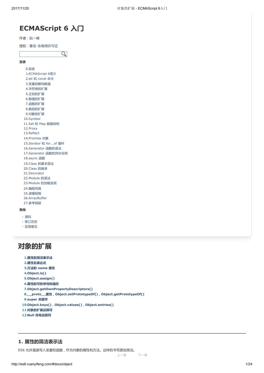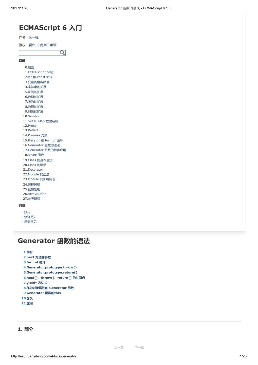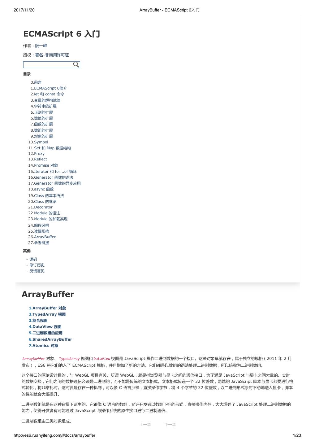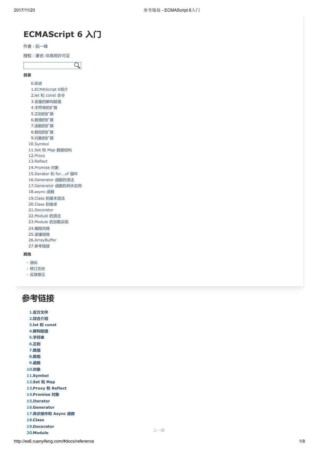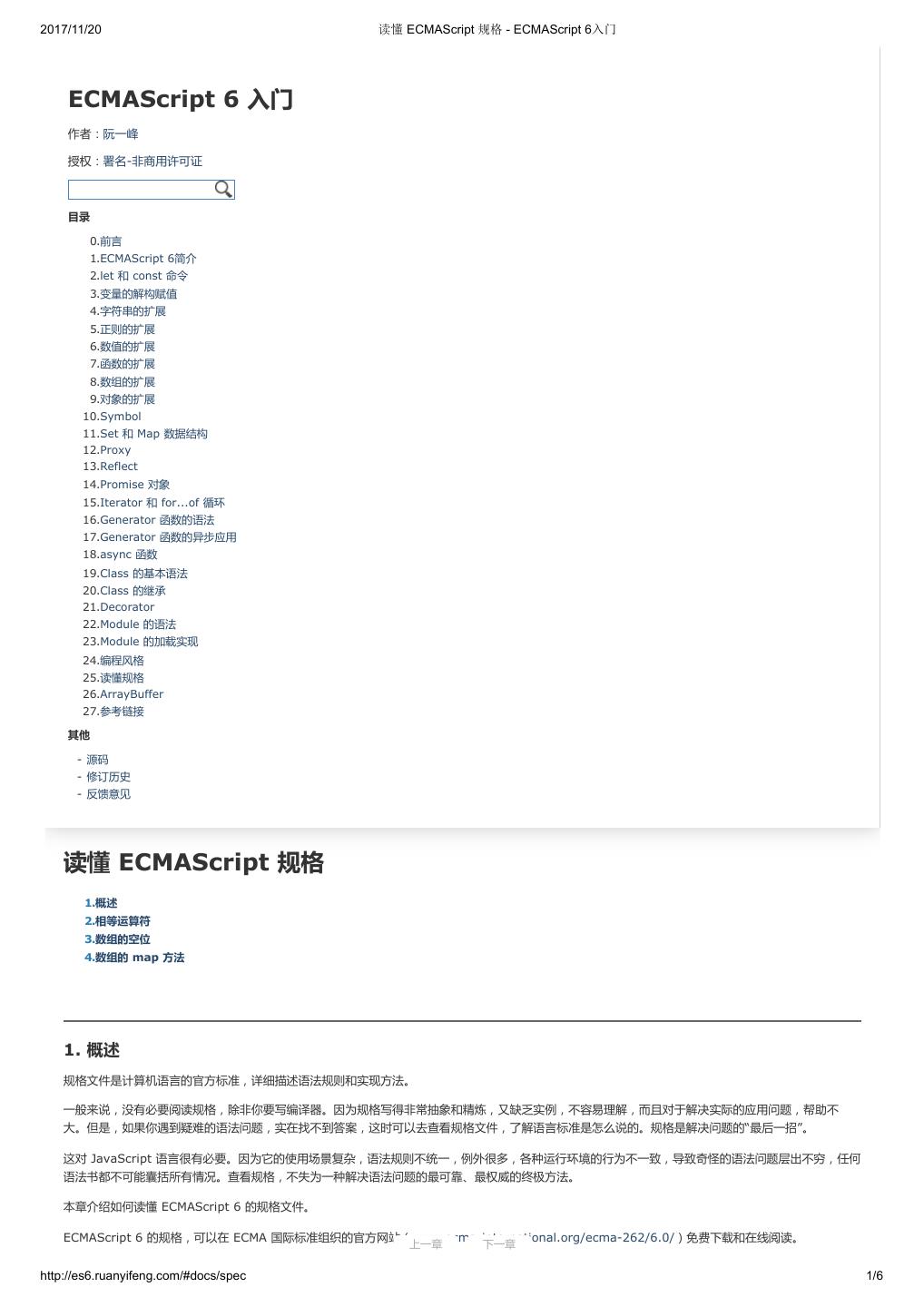 1 .2017/11/20 ECMAScript 6 入门 - ECMAScript 6入门 本书覆盖 ES6 与上一个版本 ES5 的所有不同之处,对涉及的语法知识给予详细介绍,并给出大量简洁易懂的示例代码。 本书为中级难度,适合已经掌握 ES5 的读者,用来了解这门语言的最新发展;也可当作参考手册,查寻新增的语法点。 全书已由电子工业出版社出版,2017年9月推出了第三版,书名为《ES6 标准入门》。纸版是基于网站内容排版印刷的。 感谢张春雨编辑支持我将全书开源的做法。如果您认可这本书,建议购买纸版。这样可以使出版社不因出版开源书籍而亏钱,进而鼓励更多的作者开源自 己的书籍。下面是第三版的购买地址。 - 淘宝 - 京东 - 当当 - 亚马逊 - China-pub 版权许可 本书采用“保持署名—非商用”创意共享4.0许可证。 只要保持原作者署名和非商用,您可以自由地阅读、分享、修改本书。 详细的法律条文请参见创意共享网站。 留言 下一章 http://es6.ruanyifeng.com/#undefined 2/2