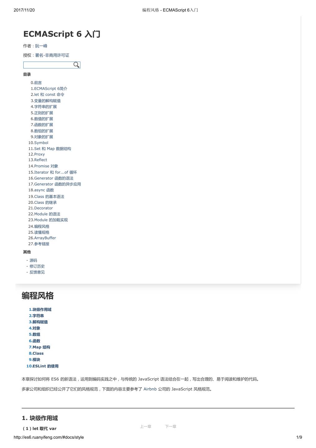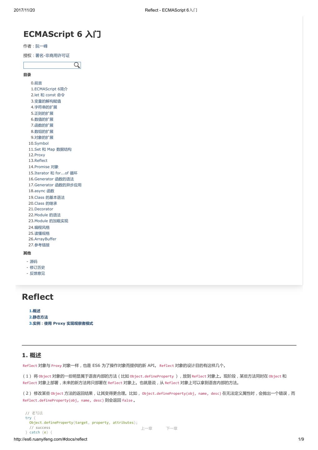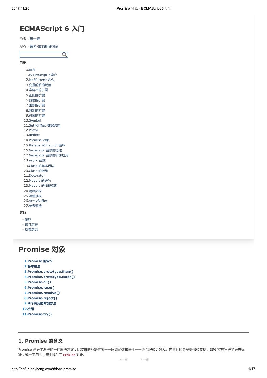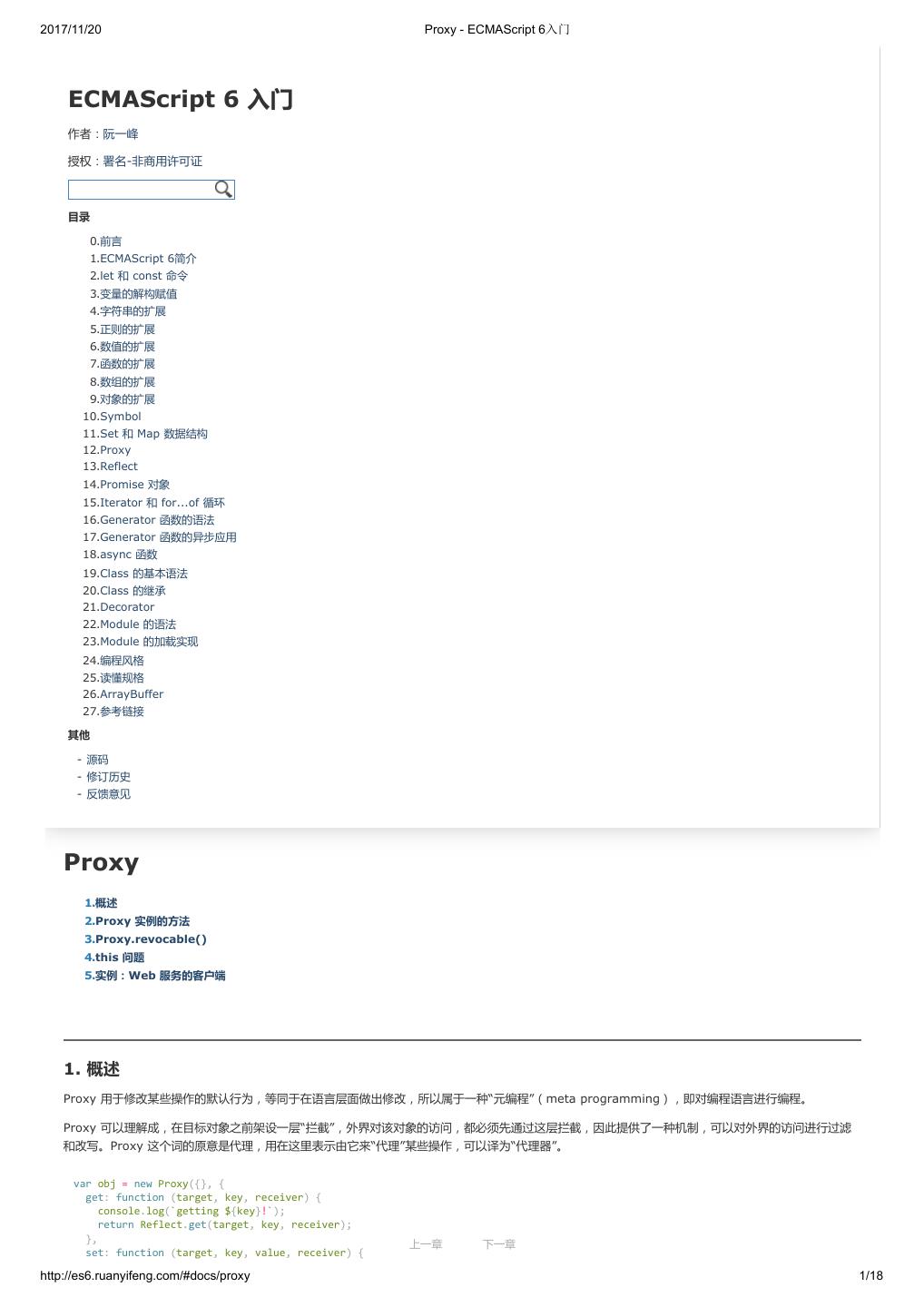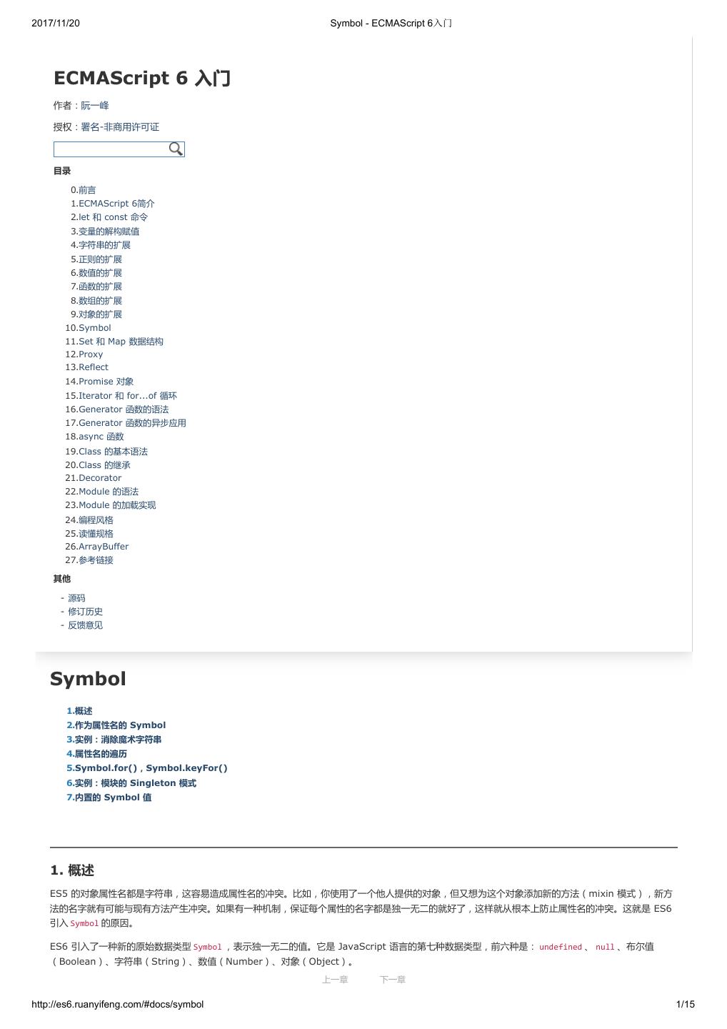 1 .2017/11/20 ECMAScript 6 入门 - ECMAScript 6入门 本书覆盖 ES6 与上一个版本 ES5 的所有不同之处,对涉及的语法知识给予详细介绍,并给出大量简洁易懂的示例代码。 本书为中级难度,适合已经掌握 ES5 的读者,用来了解这门语言的最新发展;也可当作参考手册,查寻新增的语法点。 全书已由电子工业出版社出版,2017年9月推出了第三版,书名为《ES6 标准入门》。纸版是基于网站内容排版印刷的。 感谢张春雨编辑支持我将全书开源的做法。如果您认可这本书,建议购买纸版。这样可以使出版社不因出版开源书籍而亏钱,进而鼓励更多的作者开源自 己的书籍。下面是第三版的购买地址。 - 淘宝 - 京东 - 当当 - 亚马逊 - China-pub 版权许可 本书采用“保持署名—非商用”创意共享4.0许可证。 只要保持原作者署名和非商用,您可以自由地阅读、分享、修改本书。 详细的法律条文请参见创意共享网站。 留言 下一章 http://es6.ruanyifeng.com/#undefined 2/2