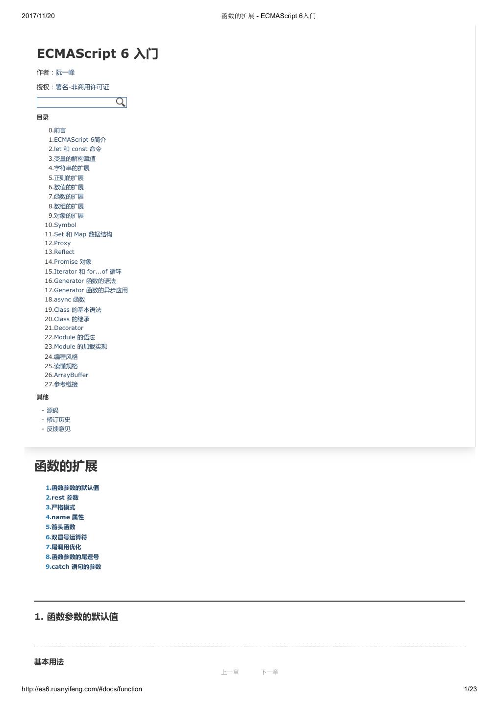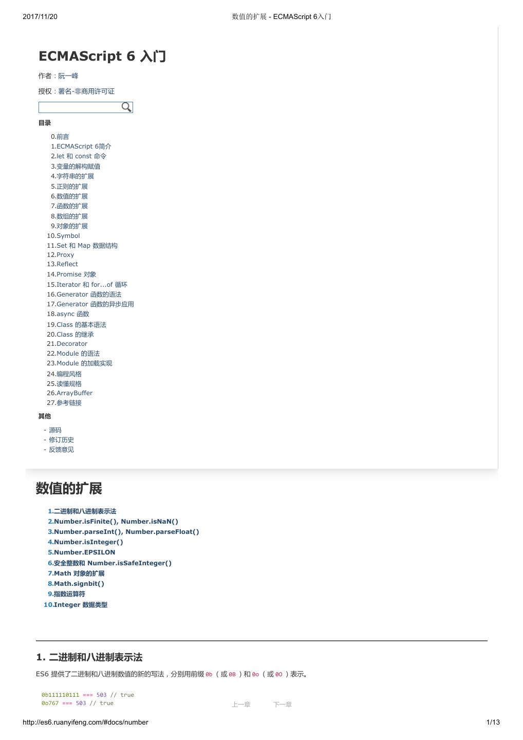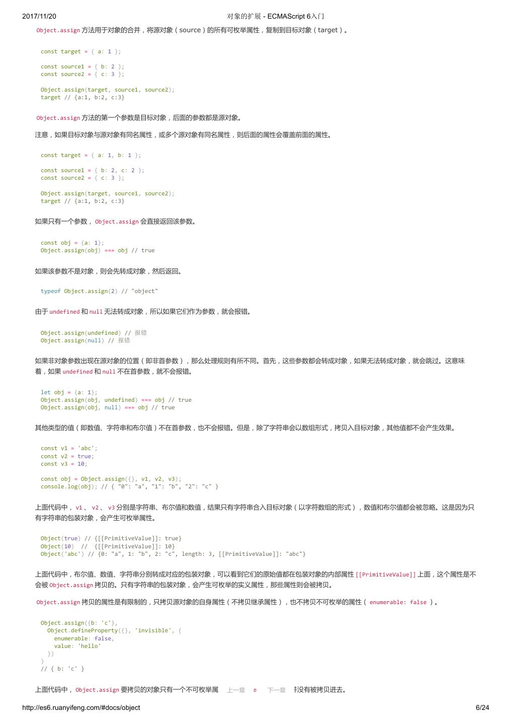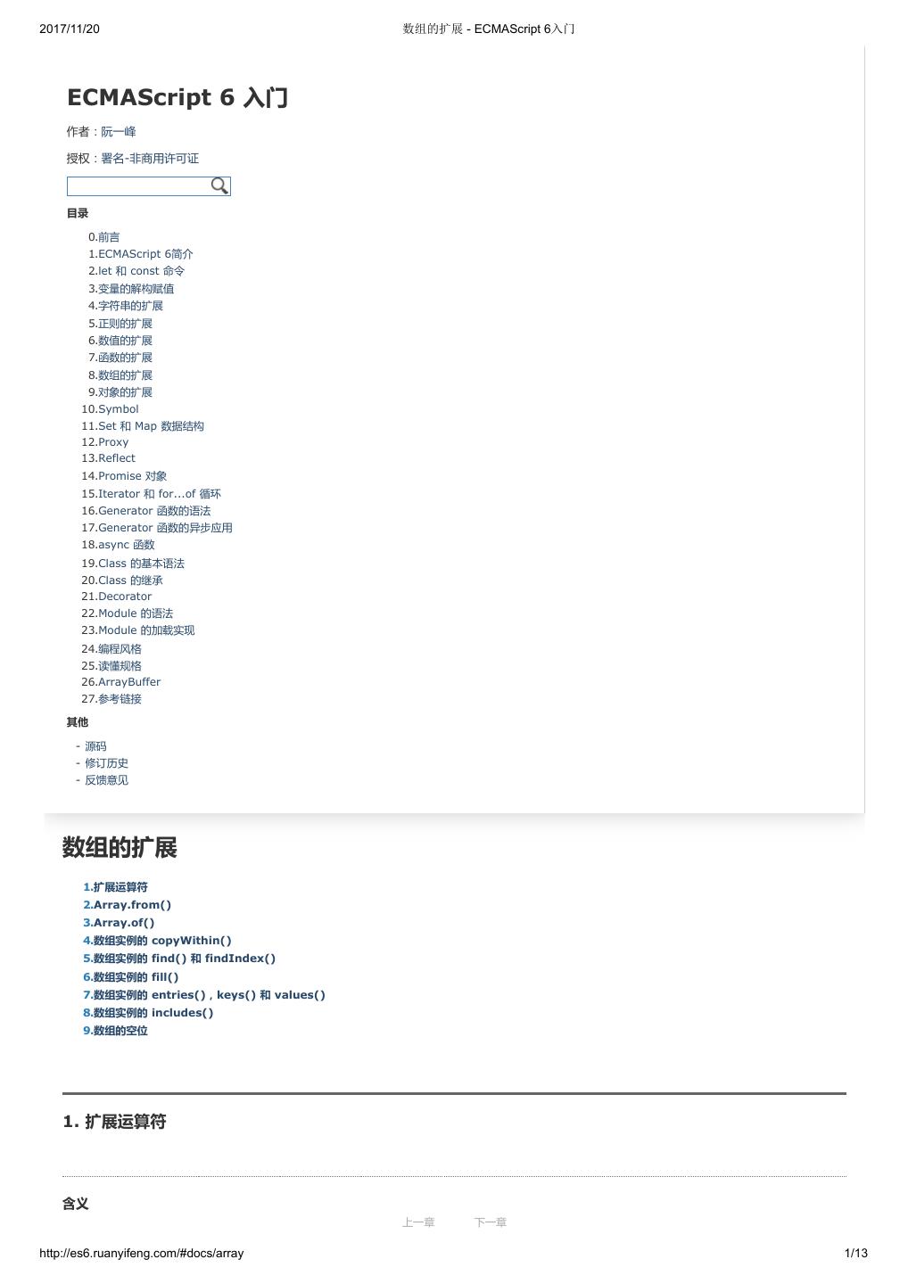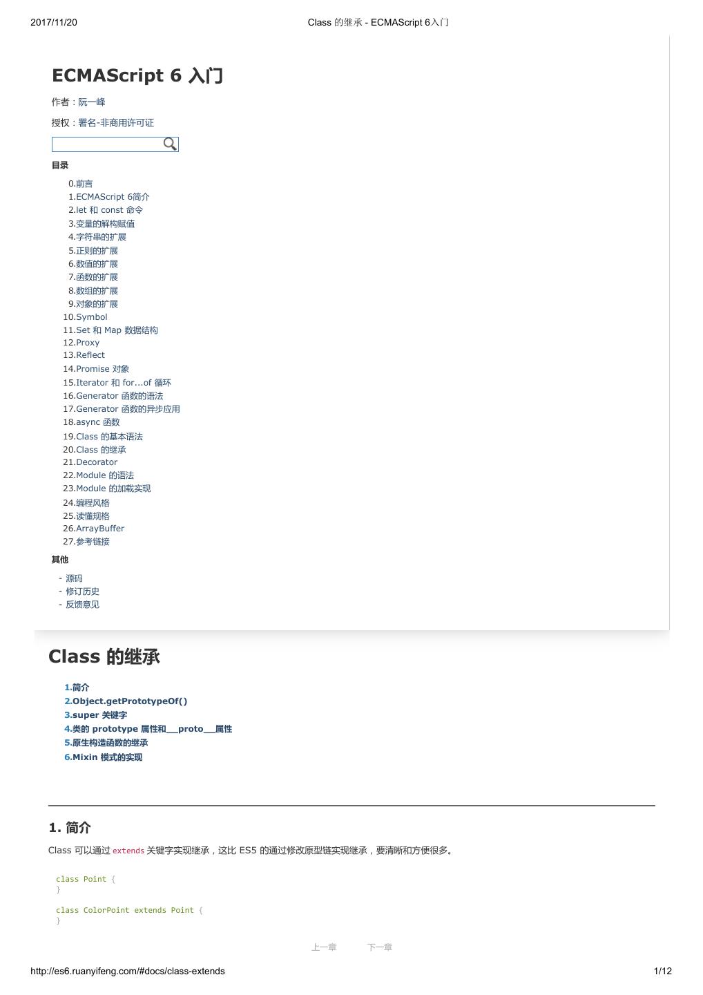 1 .2017/11/20 ECMAScript 6 入门 - ECMAScript 6入门 本书覆盖 ES6 与上一个版本 ES5 的所有不同之处,对涉及的语法知识给予详细介绍,并给出大量简洁易懂的示例代码。 本书为中级难度,适合已经掌握 ES5 的读者,用来了解这门语言的最新发展;也可当作参考手册,查寻新增的语法点。 全书已由电子工业出版社出版,2017年9月推出了第三版,书名为《ES6 标准入门》。纸版是基于网站内容排版印刷的。 感谢张春雨编辑支持我将全书开源的做法。如果您认可这本书,建议购买纸版。这样可以使出版社不因出版开源书籍而亏钱,进而鼓励更多的作者开源自 己的书籍。下面是第三版的购买地址。 - 淘宝 - 京东 - 当当 - 亚马逊 - China-pub 版权许可 本书采用“保持署名—非商用”创意共享4.0许可证。 只要保持原作者署名和非商用,您可以自由地阅读、分享、修改本书。 详细的法律条文请参见创意共享网站。 留言 下一章 http://es6.ruanyifeng.com/#undefined 2/2