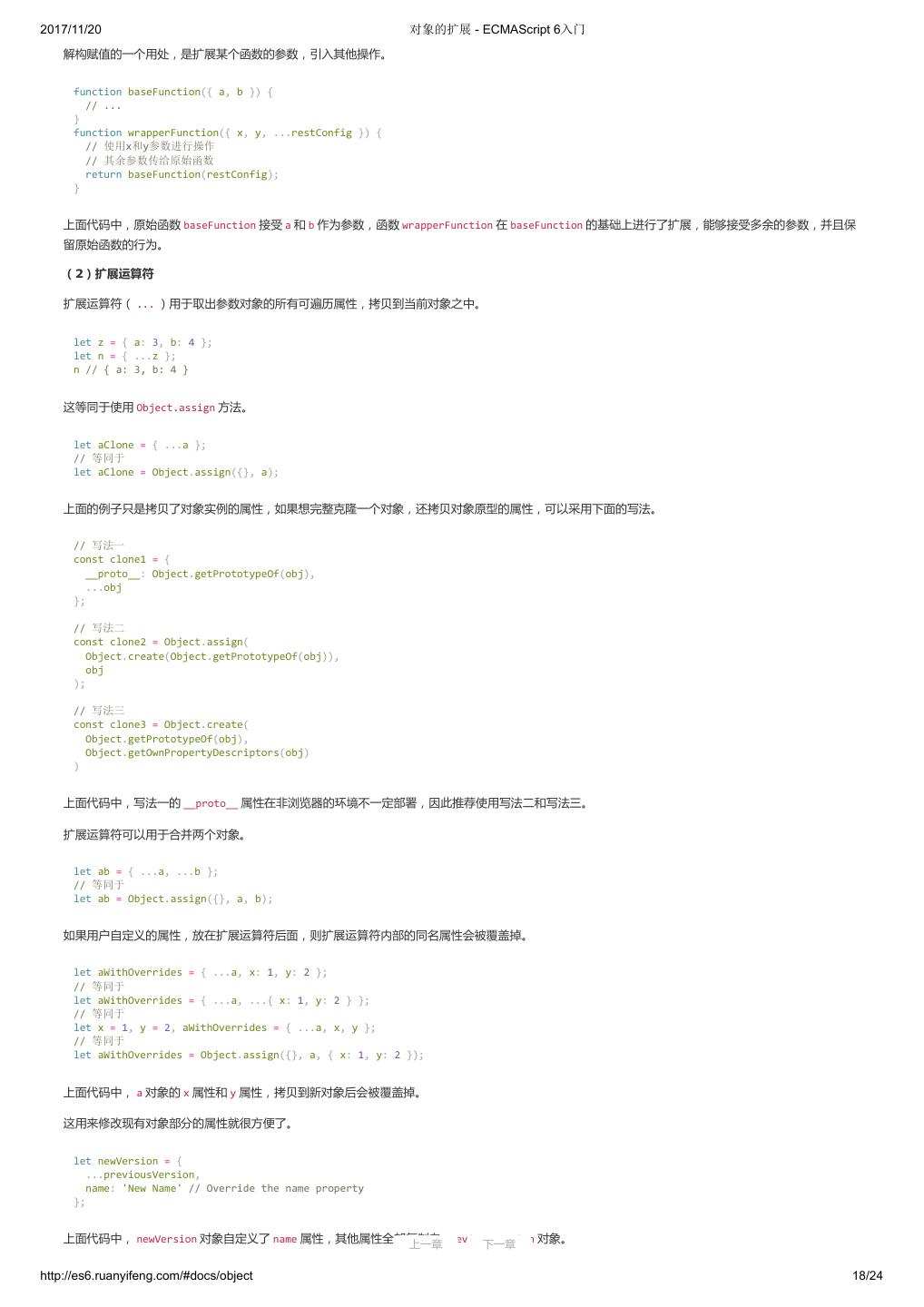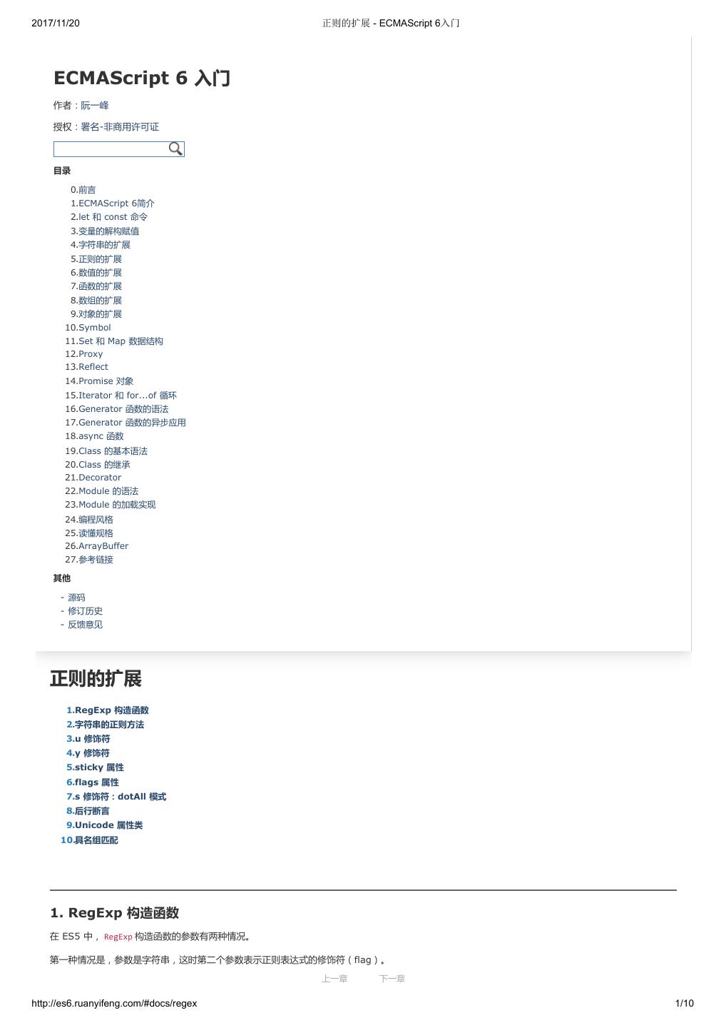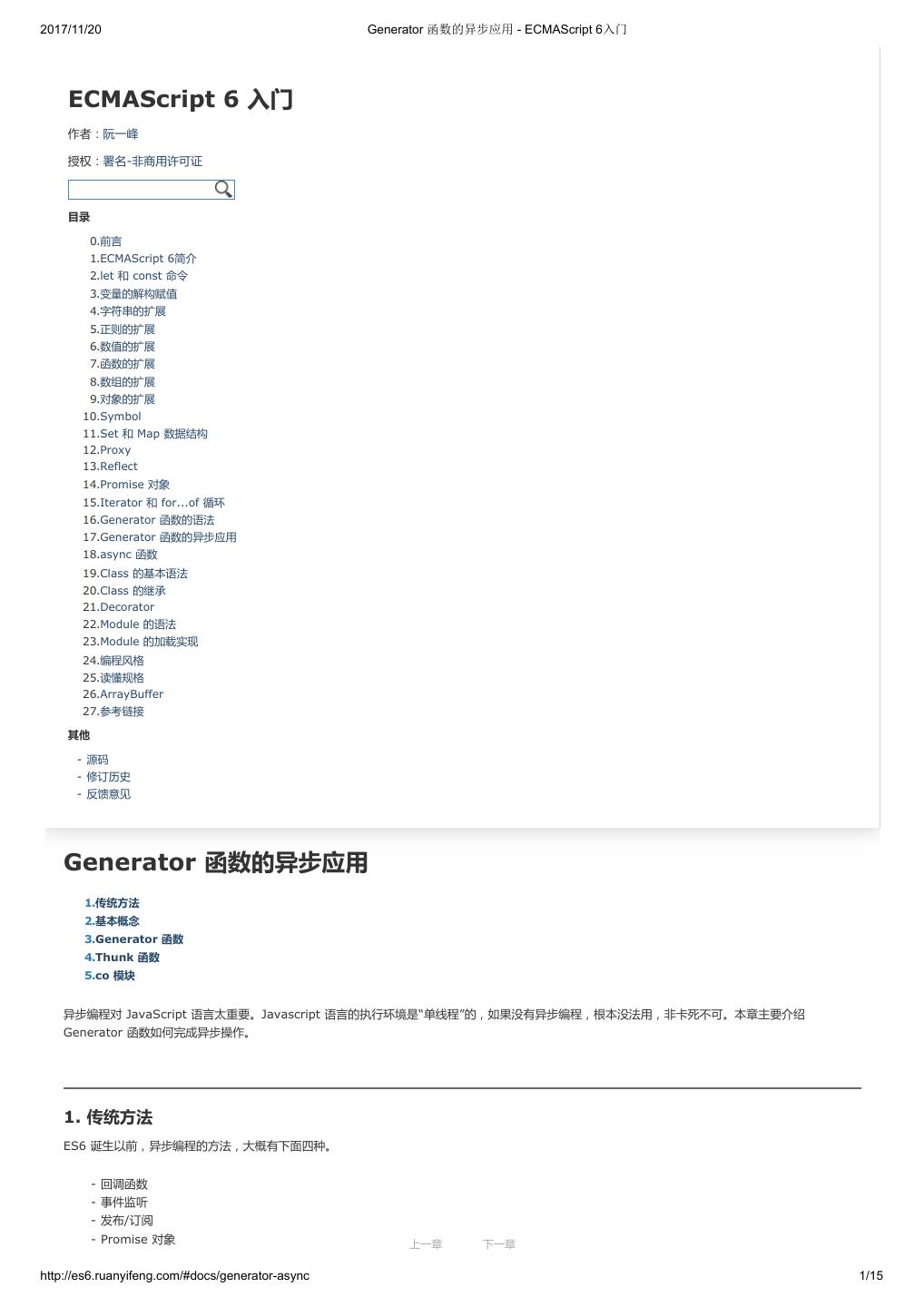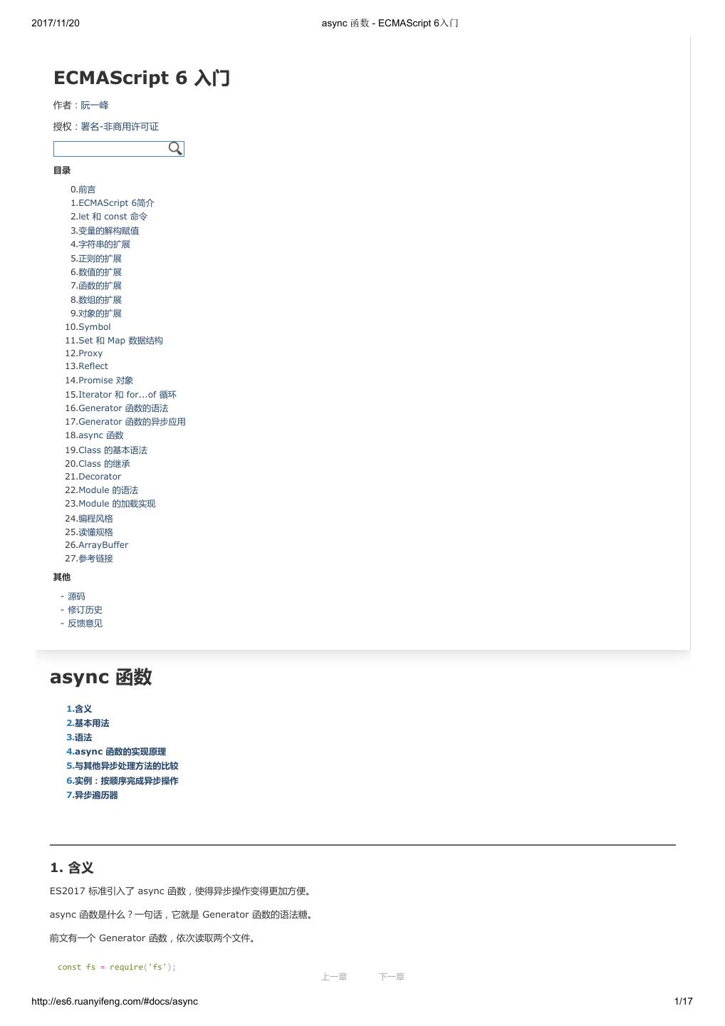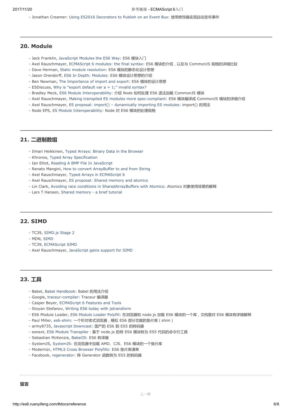 1 .2017/11/20 ECMAScript 6 入门 - ECMAScript 6入门 本书覆盖 ES6 与上一个版本 ES5 的所有不同之处,对涉及的语法知识给予详细介绍,并给出大量简洁易懂的示例代码。 本书为中级难度,适合已经掌握 ES5 的读者,用来了解这门语言的最新发展;也可当作参考手册,查寻新增的语法点。 全书已由电子工业出版社出版,2017年9月推出了第三版,书名为《ES6 标准入门》。纸版是基于网站内容排版印刷的。 感谢张春雨编辑支持我将全书开源的做法。如果您认可这本书,建议购买纸版。这样可以使出版社不因出版开源书籍而亏钱,进而鼓励更多的作者开源自 己的书籍。下面是第三版的购买地址。 - 淘宝 - 京东 - 当当 - 亚马逊 - China-pub 版权许可 本书采用“保持署名—非商用”创意共享4.0许可证。 只要保持原作者署名和非商用,您可以自由地阅读、分享、修改本书。 详细的法律条文请参见创意共享网站。 留言 下一章 http://es6.ruanyifeng.com/#undefined 2/2