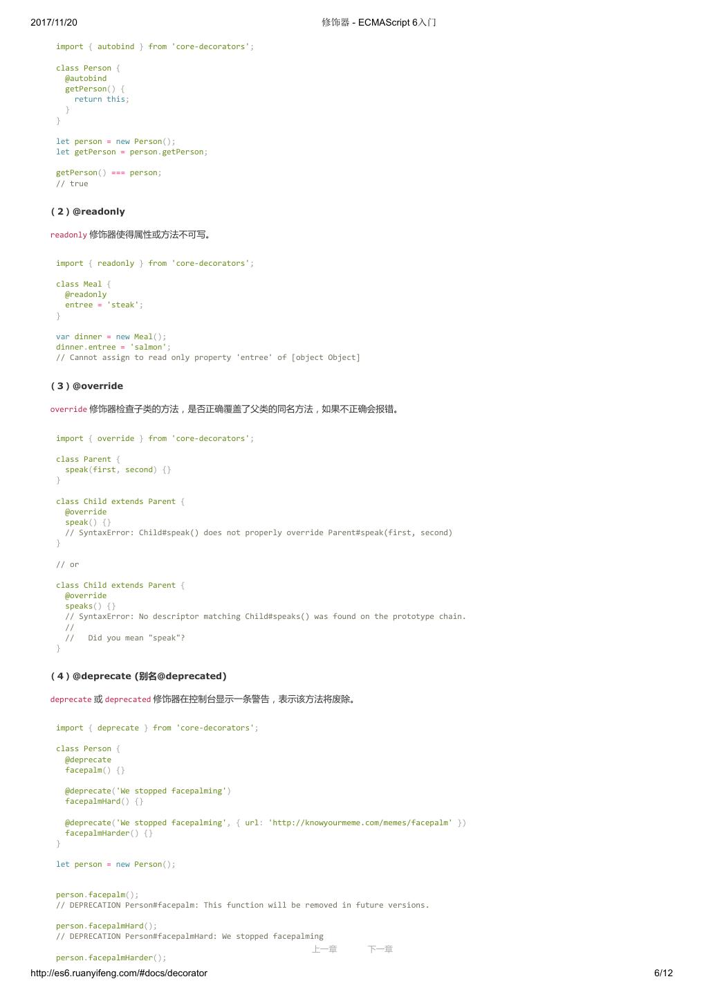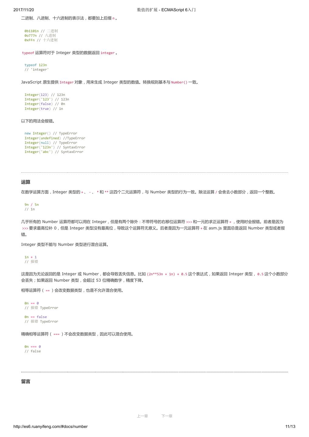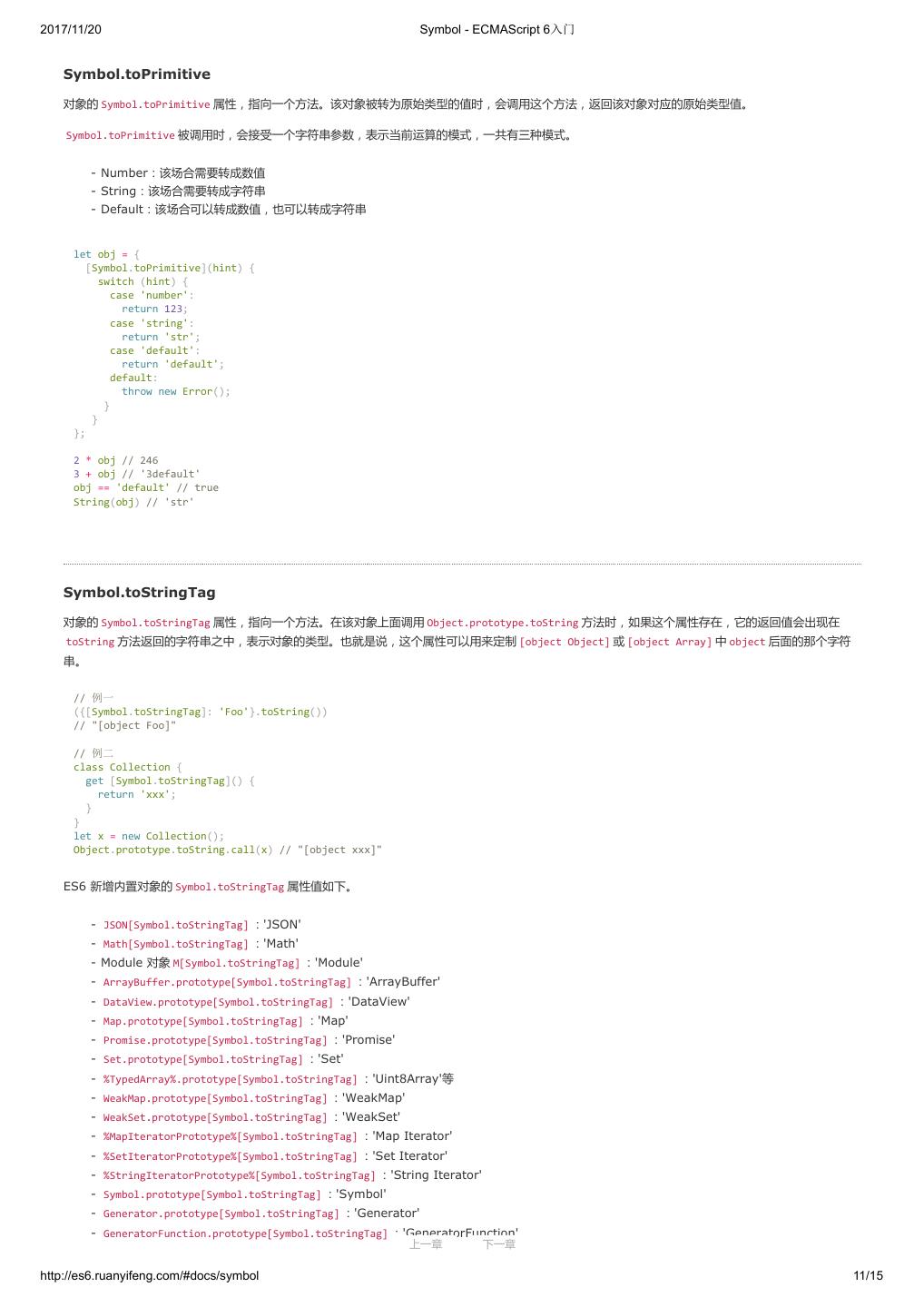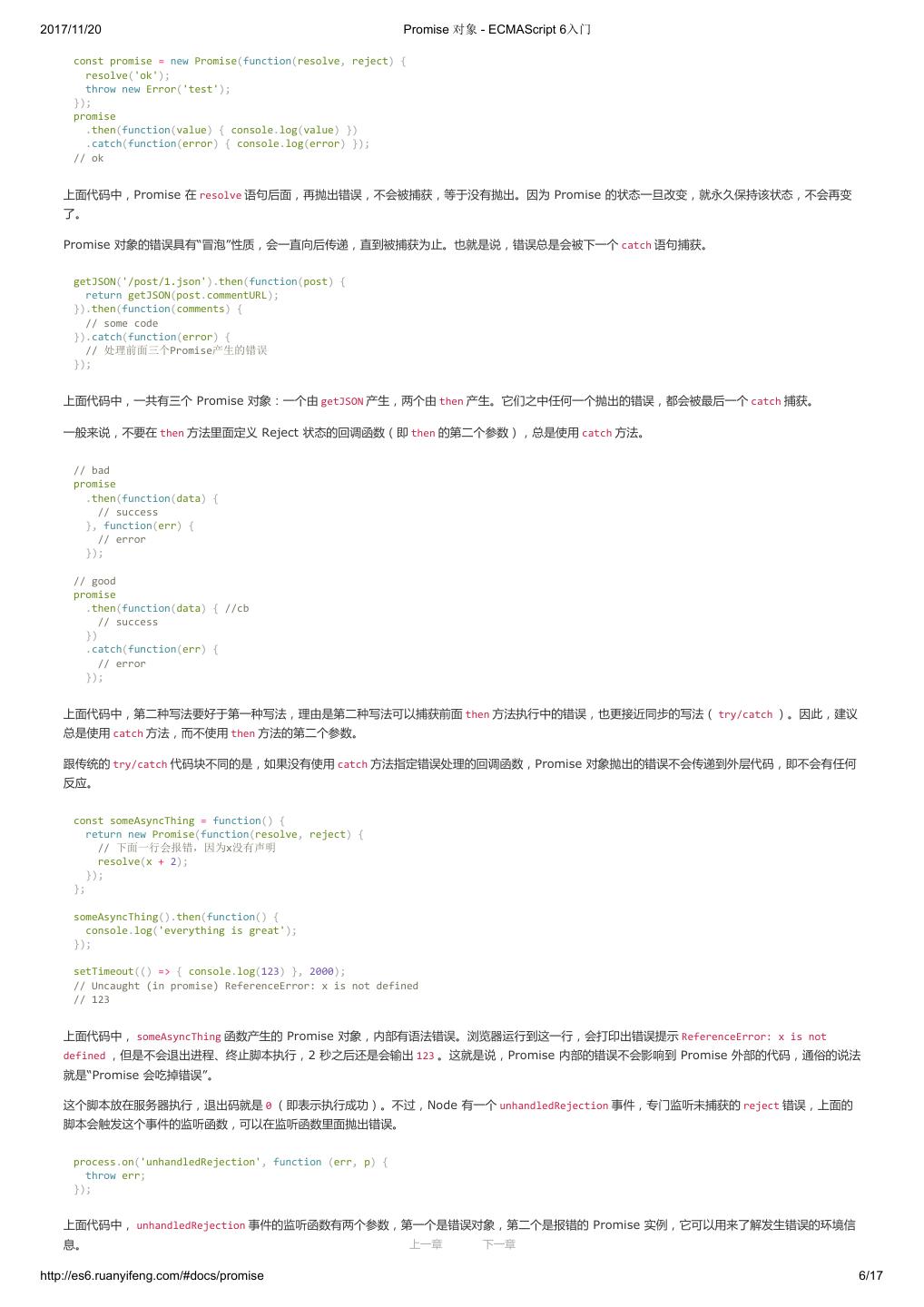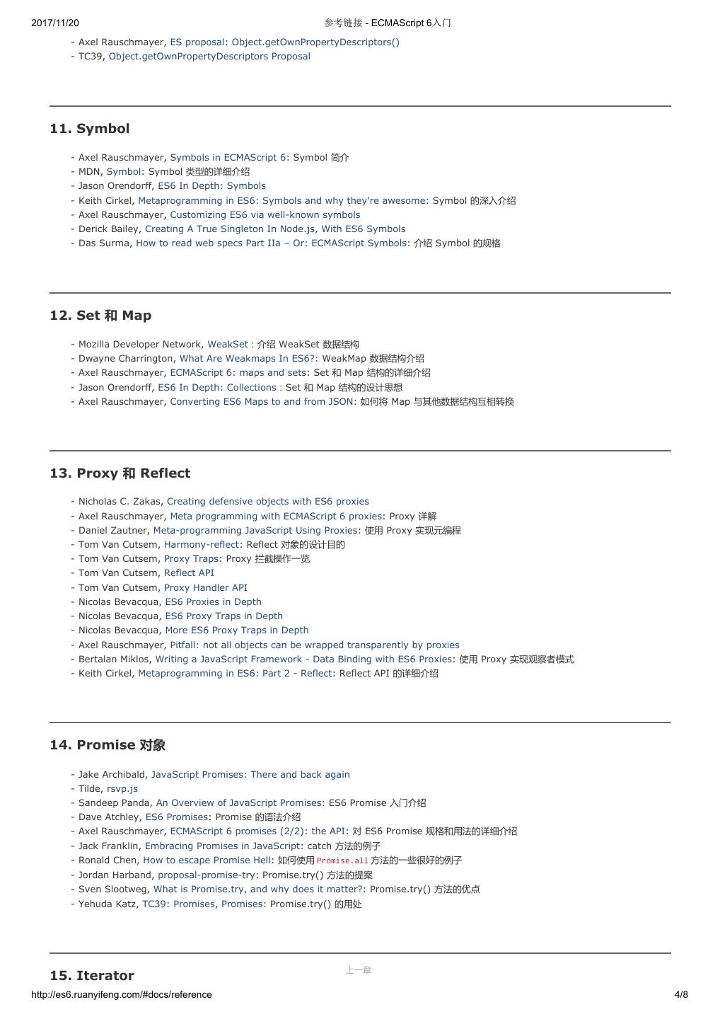1 .2017/11/20 ECMAScript 6 入门 - ECMAScript 6入门 本书覆盖 ES6 与上一个版本 ES5 的所有不同之处,对涉及的语法知识给予详细介绍,并给出大量简洁易懂的示例代码。 本书为中级难度,适合已经掌握 ES5 的读者,用来了解这门语言的最新发展;也可当作参考手册,查寻新增的语法点。 全书已由电子工业出版社出版,2017年9月推出了第三版,书名为《ES6 标准入门》。纸版是基于网站内容排版印刷的。 感谢张春雨编辑支持我将全书开源的做法。如果您认可这本书,建议购买纸版。这样可以使出版社不因出版开源书籍而亏钱,进而鼓励更多的作者开源自 己的书籍。下面是第三版的购买地址。 - 淘宝 - 京东 - 当当 - 亚马逊 - China-pub 版权许可 本书采用“保持署名—非商用”创意共享4.0许可证。 只要保持原作者署名和非商用,您可以自由地阅读、分享、修改本书。 详细的法律条文请参见创意共享网站。 留言 下一章 http://es6.ruanyifeng.com/#undefined 2/2