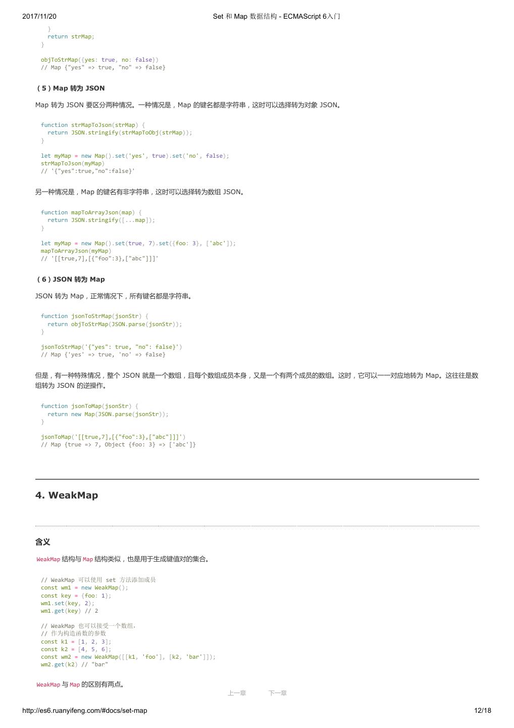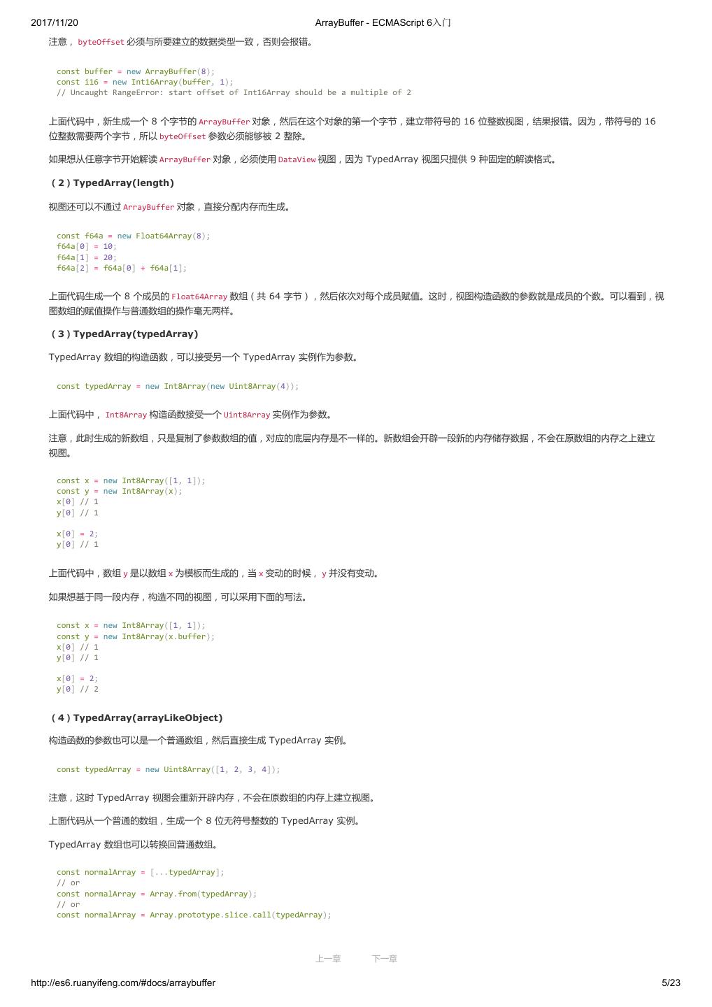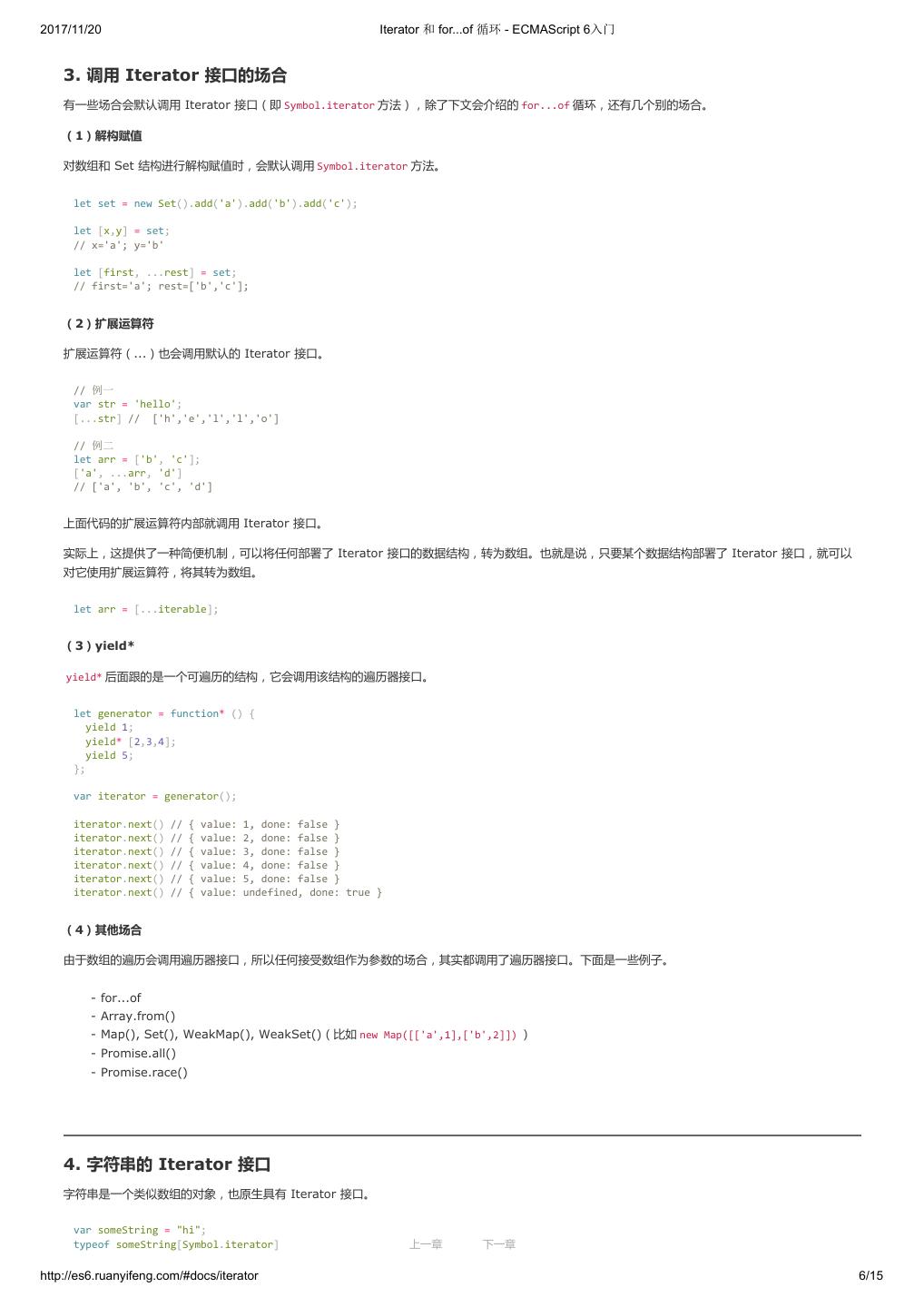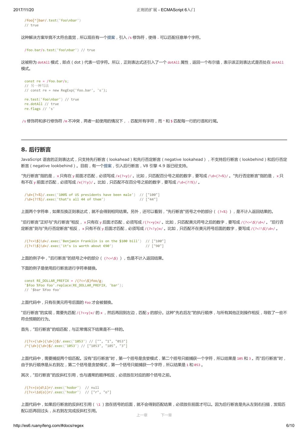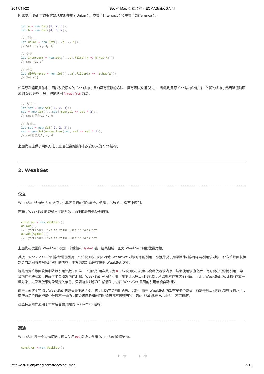 1 .2017/11/20 ECMAScript 6 入门 - ECMAScript 6入门 本书覆盖 ES6 与上一个版本 ES5 的所有不同之处,对涉及的语法知识给予详细介绍,并给出大量简洁易懂的示例代码。 本书为中级难度,适合已经掌握 ES5 的读者,用来了解这门语言的最新发展;也可当作参考手册,查寻新增的语法点。 全书已由电子工业出版社出版,2017年9月推出了第三版,书名为《ES6 标准入门》。纸版是基于网站内容排版印刷的。 感谢张春雨编辑支持我将全书开源的做法。如果您认可这本书,建议购买纸版。这样可以使出版社不因出版开源书籍而亏钱,进而鼓励更多的作者开源自 己的书籍。下面是第三版的购买地址。 - 淘宝 - 京东 - 当当 - 亚马逊 - China-pub 版权许可 本书采用“保持署名—非商用”创意共享4.0许可证。 只要保持原作者署名和非商用,您可以自由地阅读、分享、修改本书。 详细的法律条文请参见创意共享网站。 留言 下一章 http://es6.ruanyifeng.com/#undefined 2/2