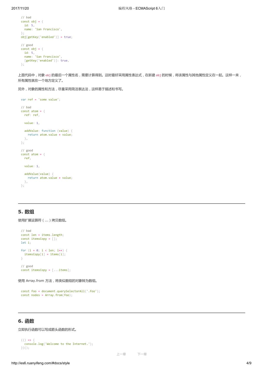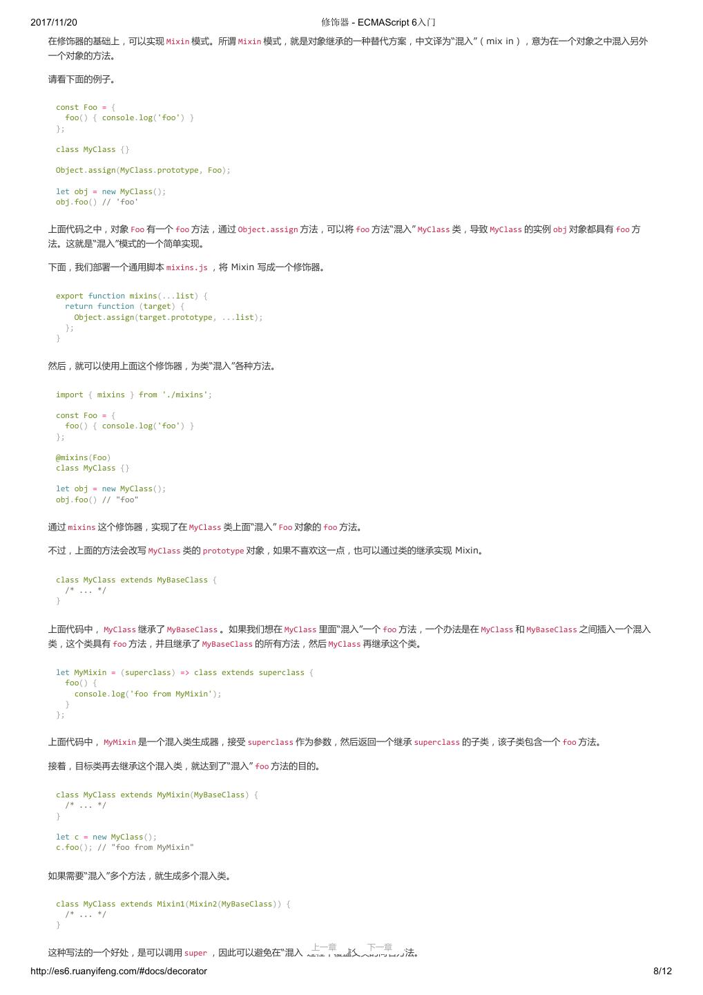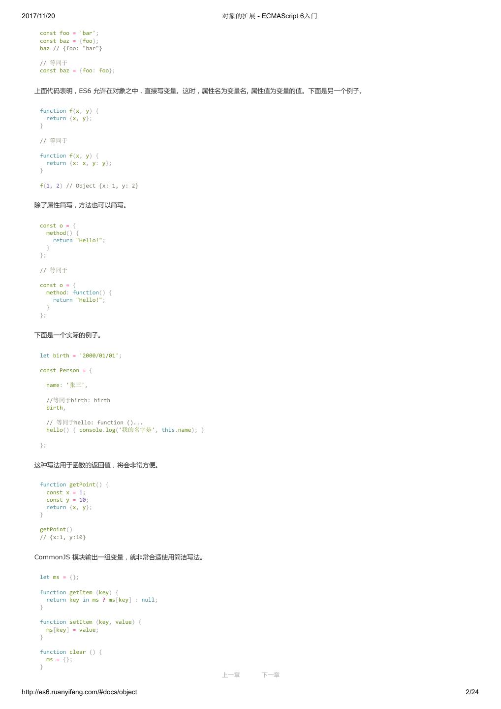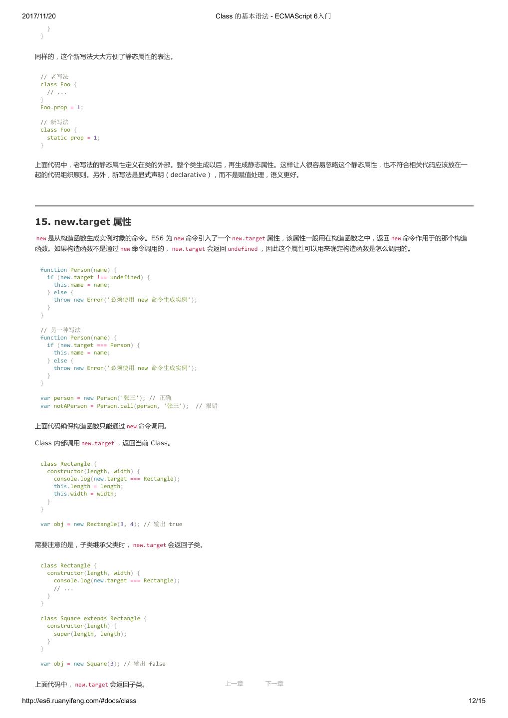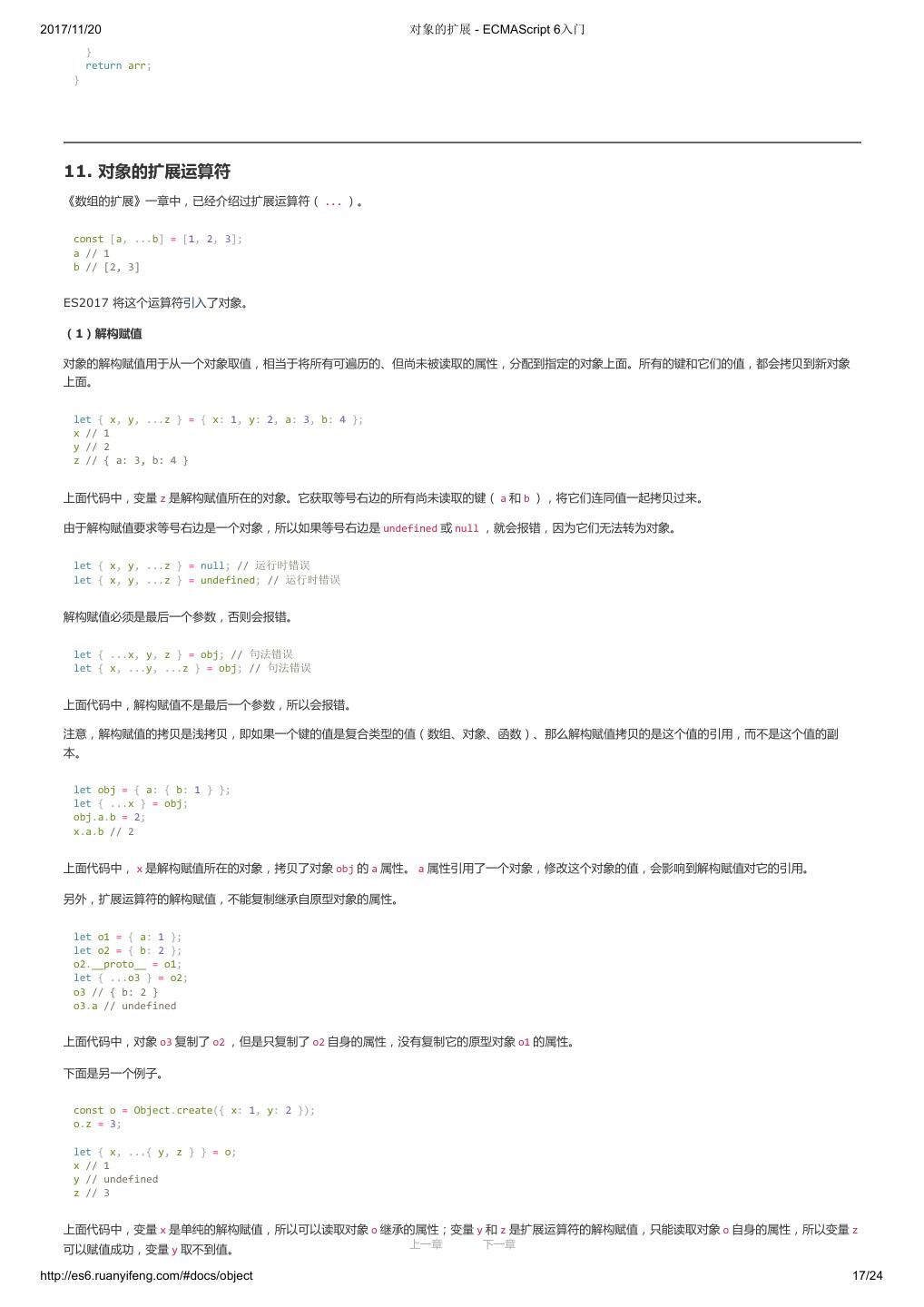 1 .2017/11/20 ECMAScript 6 入门 - ECMAScript 6入门 本书覆盖 ES6 与上一个版本 ES5 的所有不同之处,对涉及的语法知识给予详细介绍,并给出大量简洁易懂的示例代码。 本书为中级难度,适合已经掌握 ES5 的读者,用来了解这门语言的最新发展;也可当作参考手册,查寻新增的语法点。 全书已由电子工业出版社出版,2017年9月推出了第三版,书名为《ES6 标准入门》。纸版是基于网站内容排版印刷的。 感谢张春雨编辑支持我将全书开源的做法。如果您认可这本书,建议购买纸版。这样可以使出版社不因出版开源书籍而亏钱,进而鼓励更多的作者开源自 己的书籍。下面是第三版的购买地址。 - 淘宝 - 京东 - 当当 - 亚马逊 - China-pub 版权许可 本书采用“保持署名—非商用”创意共享4.0许可证。 只要保持原作者署名和非商用,您可以自由地阅读、分享、修改本书。 详细的法律条文请参见创意共享网站。 留言 下一章 http://es6.ruanyifeng.com/#undefined 2/2