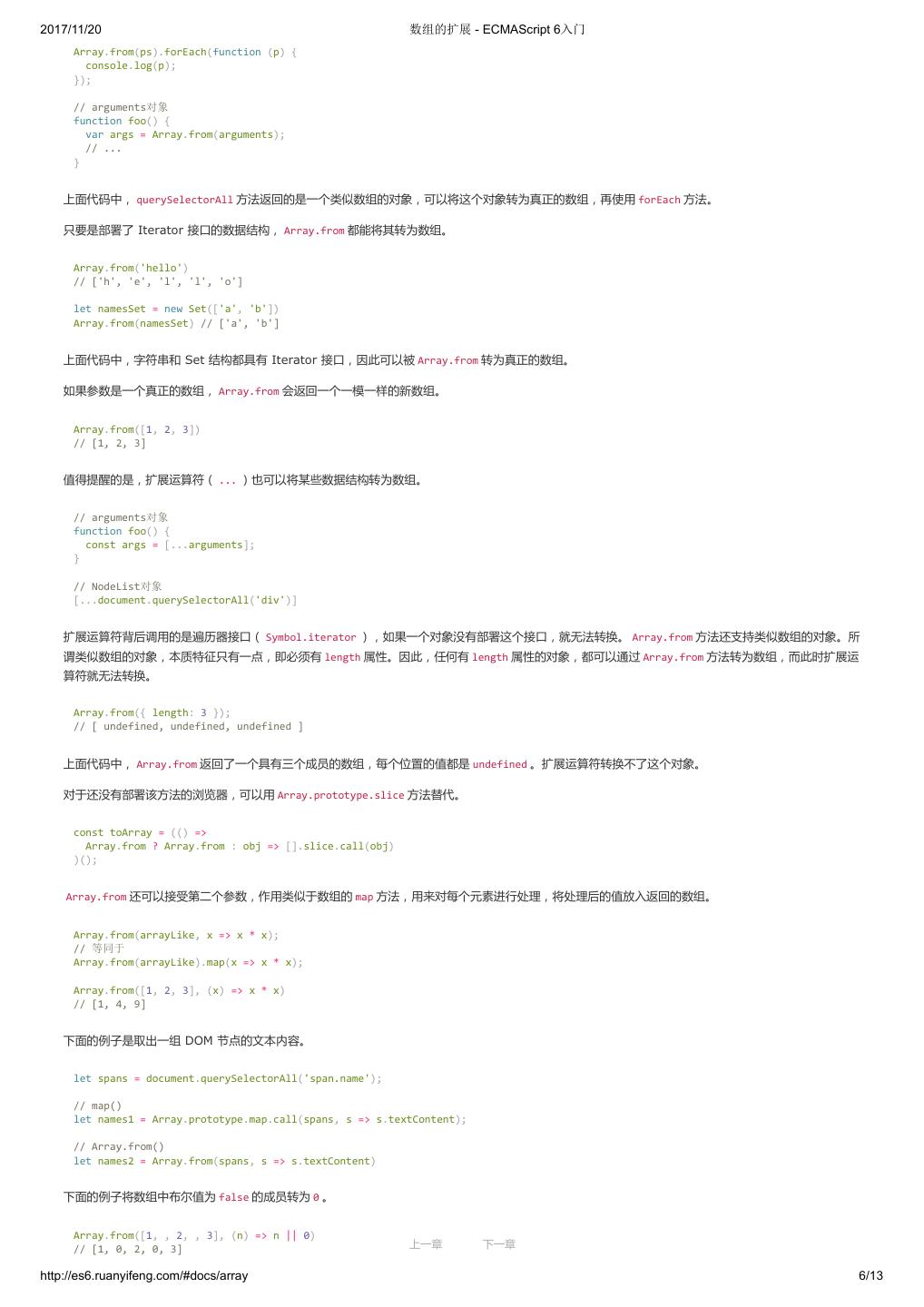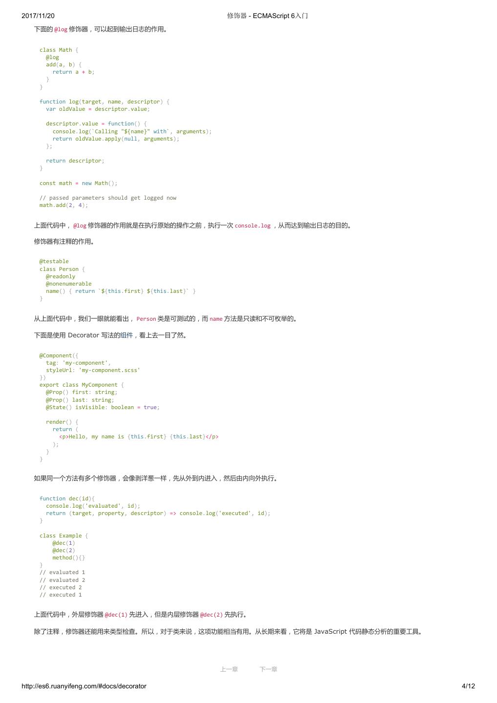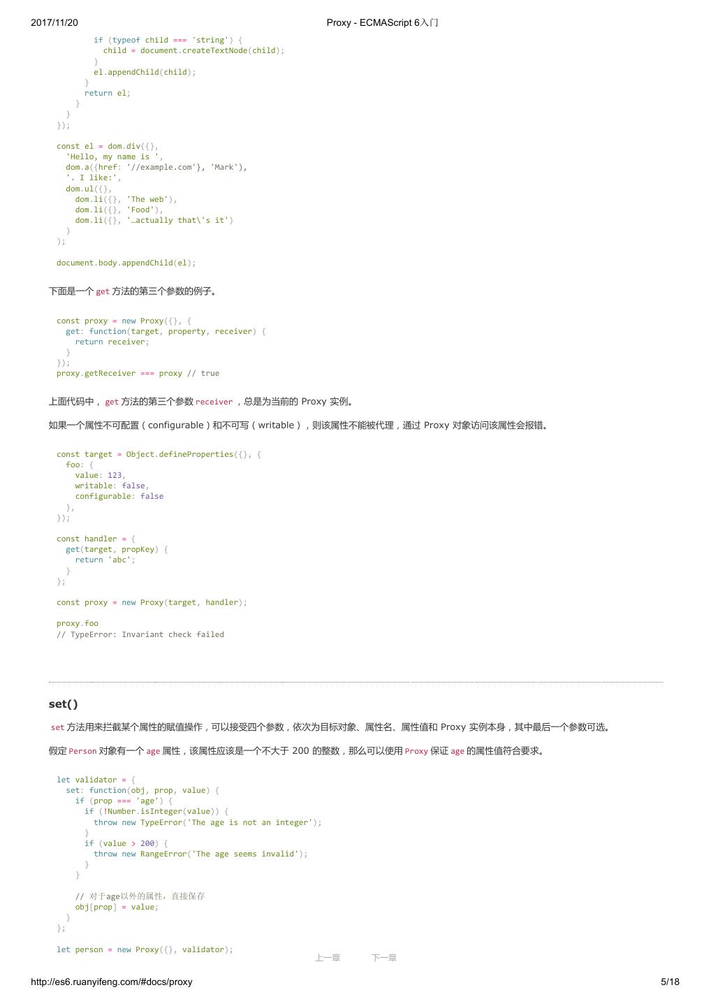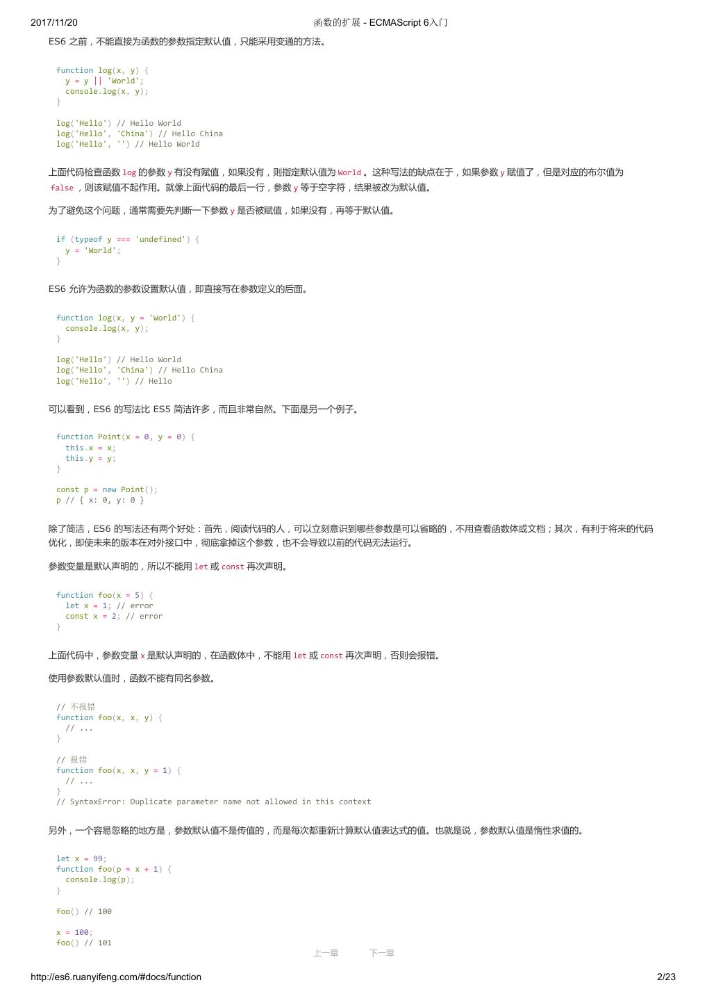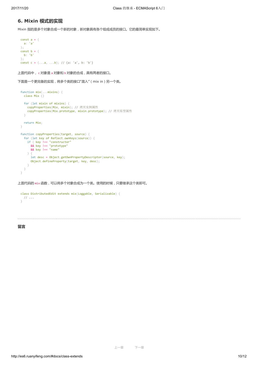 1 .2017/11/20 ECMAScript 6 入门 - ECMAScript 6入门 本书覆盖 ES6 与上一个版本 ES5 的所有不同之处,对涉及的语法知识给予详细介绍,并给出大量简洁易懂的示例代码。 本书为中级难度,适合已经掌握 ES5 的读者,用来了解这门语言的最新发展;也可当作参考手册,查寻新增的语法点。 全书已由电子工业出版社出版,2017年9月推出了第三版,书名为《ES6 标准入门》。纸版是基于网站内容排版印刷的。 感谢张春雨编辑支持我将全书开源的做法。如果您认可这本书,建议购买纸版。这样可以使出版社不因出版开源书籍而亏钱,进而鼓励更多的作者开源自 己的书籍。下面是第三版的购买地址。 - 淘宝 - 京东 - 当当 - 亚马逊 - China-pub 版权许可 本书采用“保持署名—非商用”创意共享4.0许可证。 只要保持原作者署名和非商用,您可以自由地阅读、分享、修改本书。 详细的法律条文请参见创意共享网站。 留言 下一章 http://es6.ruanyifeng.com/#undefined 2/2