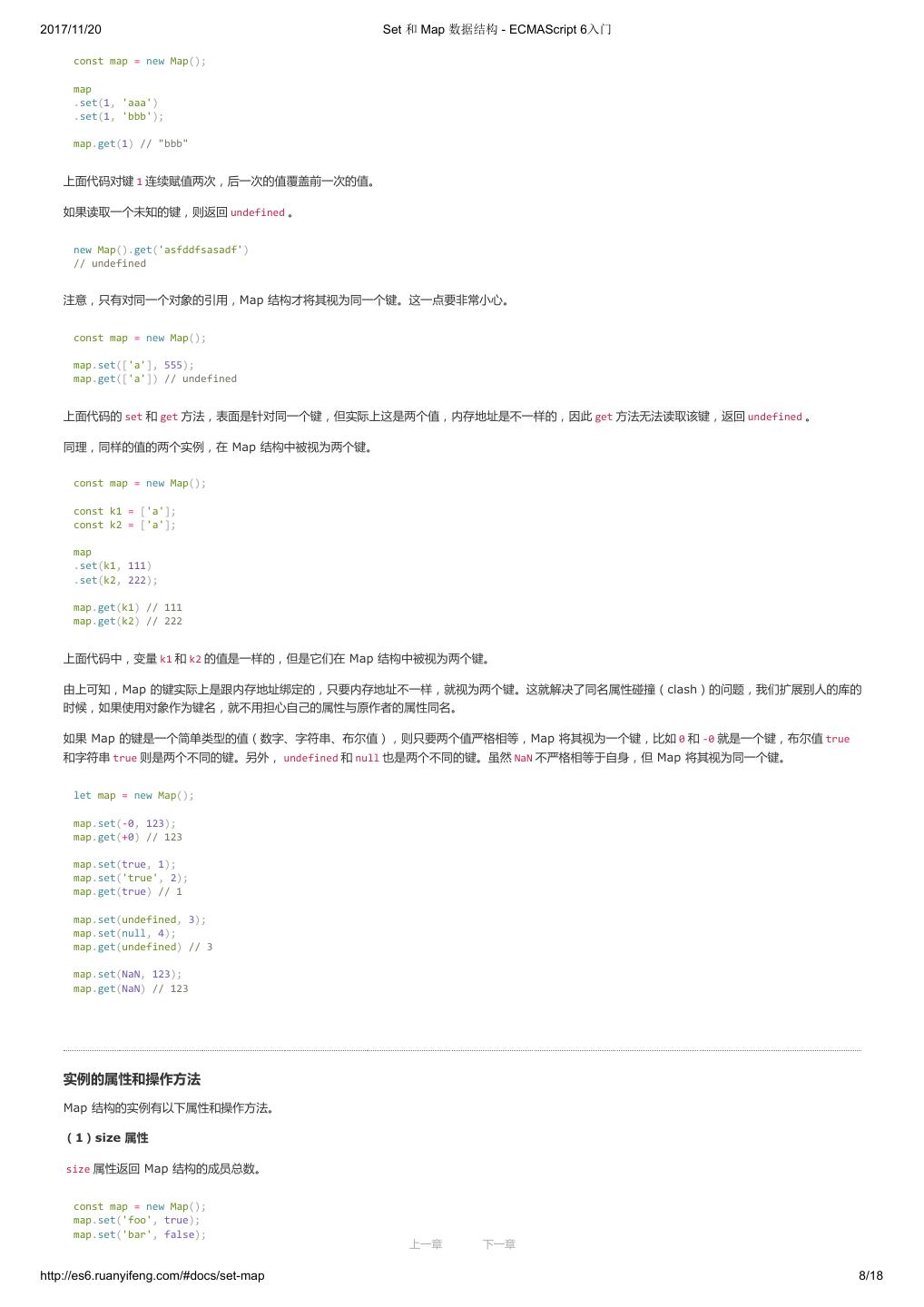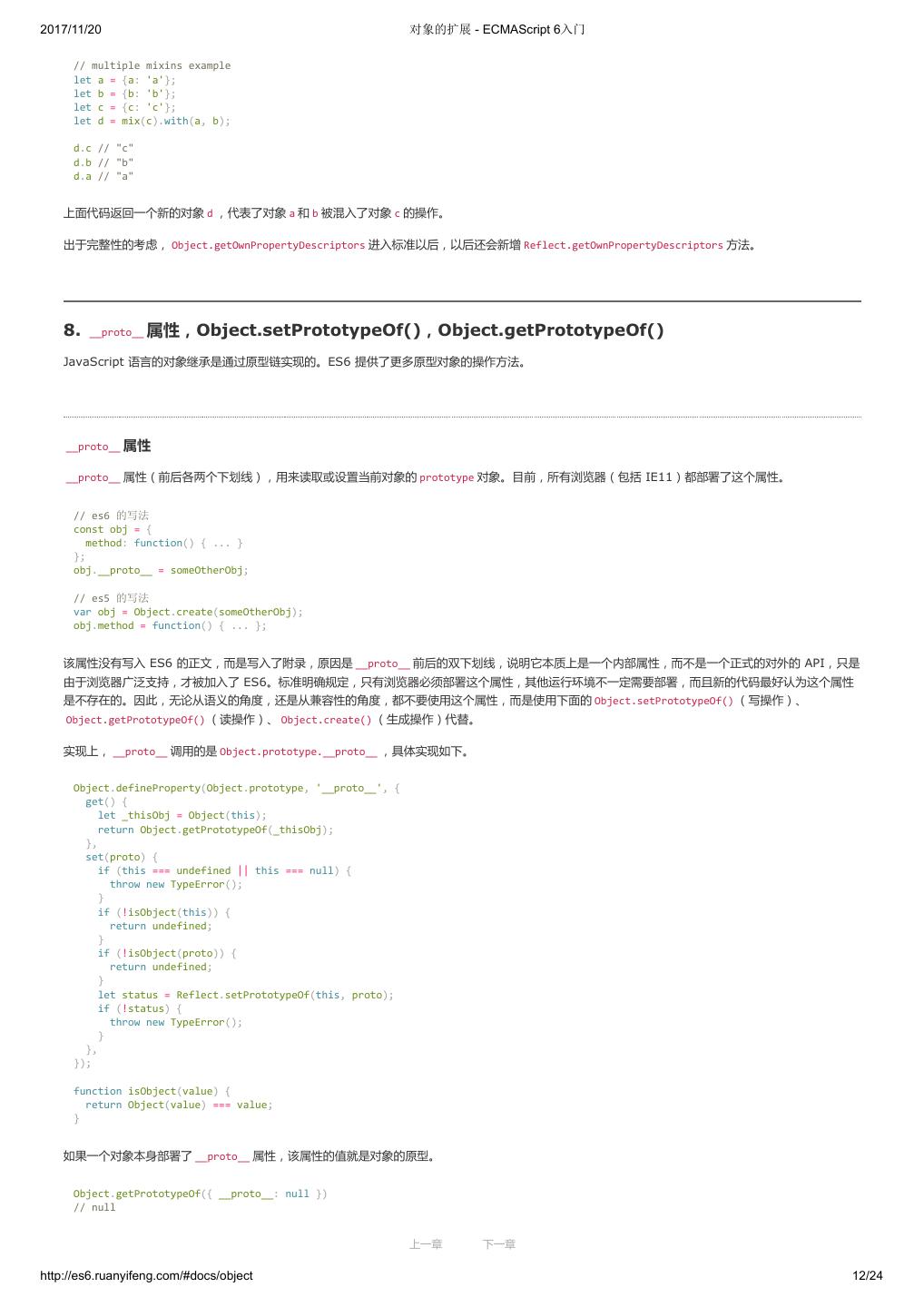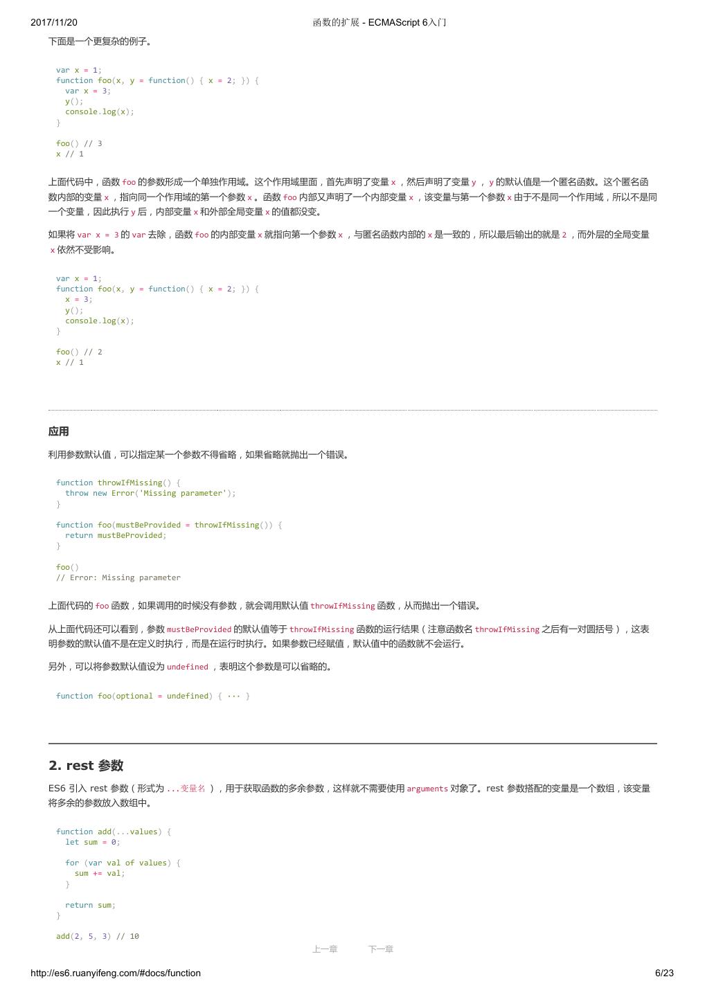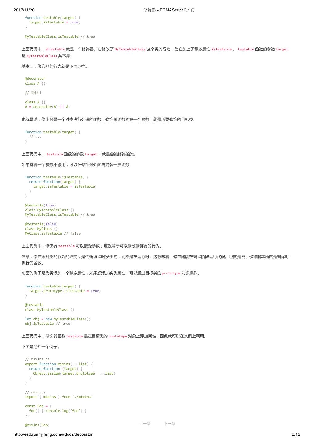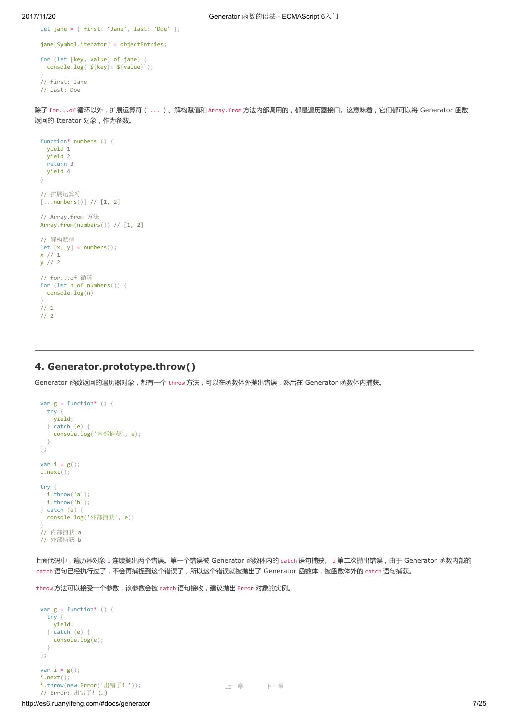 1 .2017/11/20 ECMAScript 6 入门 - ECMAScript 6入门 本书覆盖 ES6 与上一个版本 ES5 的所有不同之处,对涉及的语法知识给予详细介绍,并给出大量简洁易懂的示例代码。 本书为中级难度,适合已经掌握 ES5 的读者,用来了解这门语言的最新发展;也可当作参考手册,查寻新增的语法点。 全书已由电子工业出版社出版,2017年9月推出了第三版,书名为《ES6 标准入门》。纸版是基于网站内容排版印刷的。 感谢张春雨编辑支持我将全书开源的做法。如果您认可这本书,建议购买纸版。这样可以使出版社不因出版开源书籍而亏钱,进而鼓励更多的作者开源自 己的书籍。下面是第三版的购买地址。 - 淘宝 - 京东 - 当当 - 亚马逊 - China-pub 版权许可 本书采用“保持署名—非商用”创意共享4.0许可证。 只要保持原作者署名和非商用,您可以自由地阅读、分享、修改本书。 详细的法律条文请参见创意共享网站。 留言 下一章 http://es6.ruanyifeng.com/#undefined 2/2