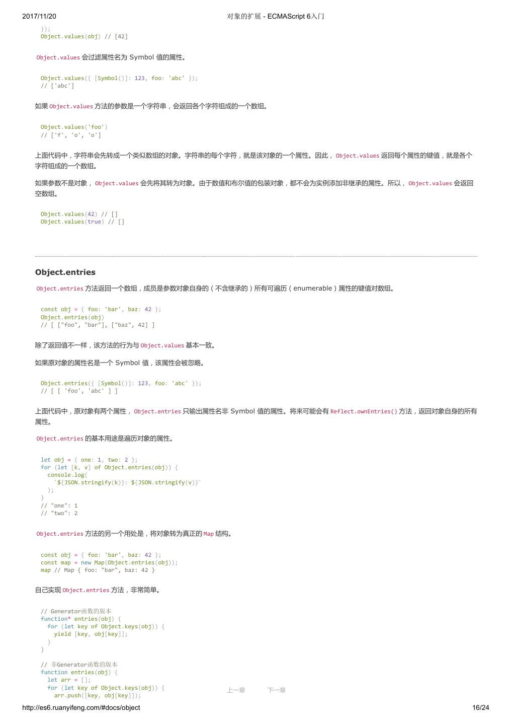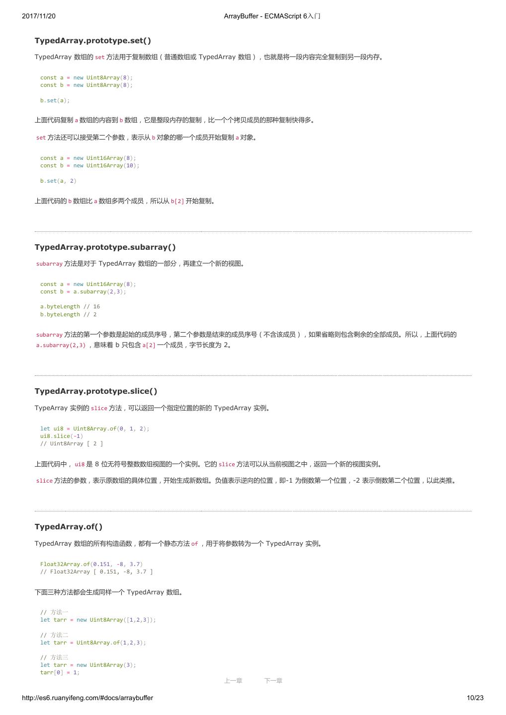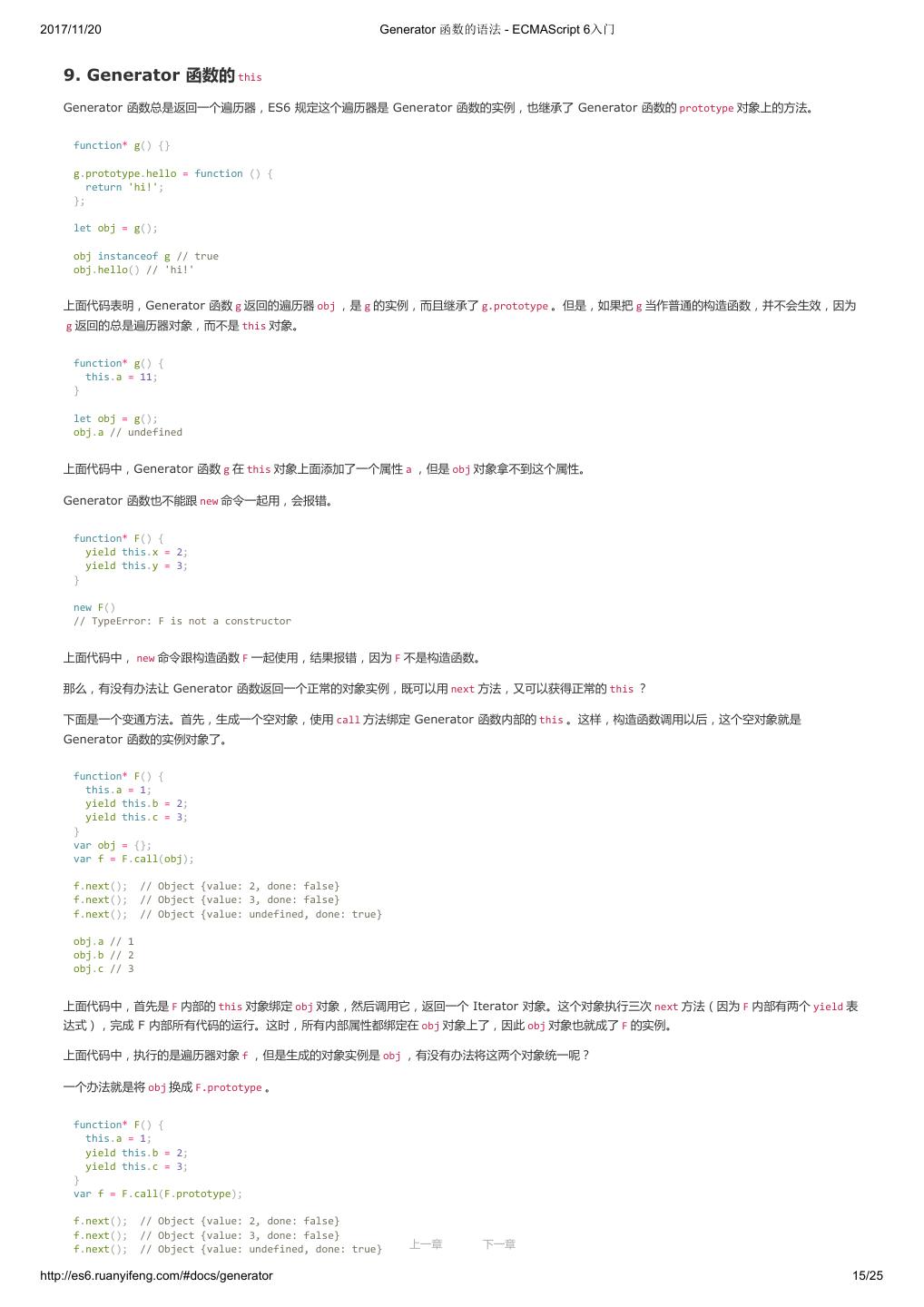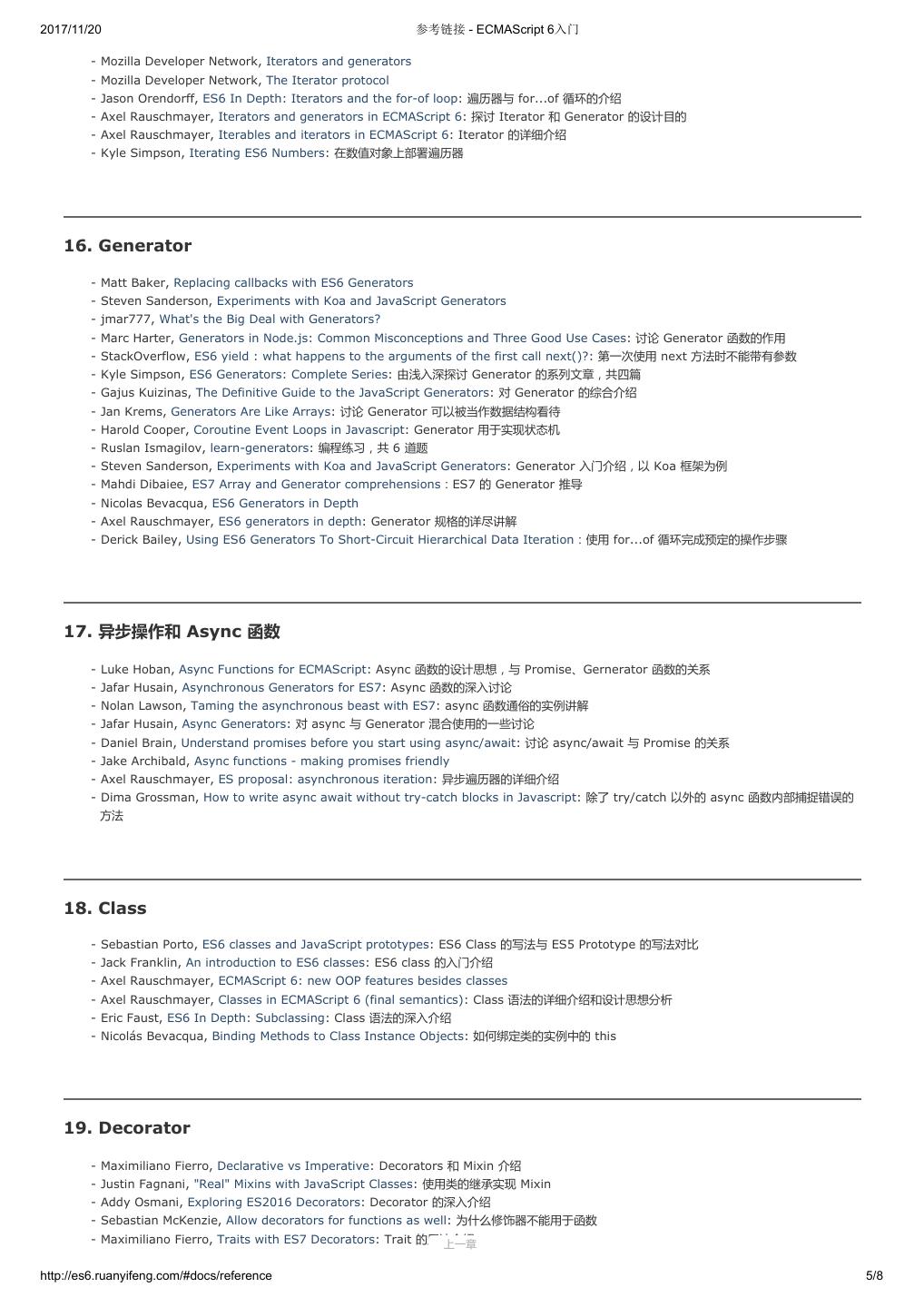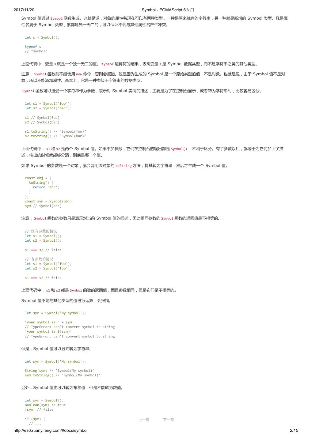 1 .2017/11/20 ECMAScript 6 入门 - ECMAScript 6入门 本书覆盖 ES6 与上一个版本 ES5 的所有不同之处,对涉及的语法知识给予详细介绍,并给出大量简洁易懂的示例代码。 本书为中级难度,适合已经掌握 ES5 的读者,用来了解这门语言的最新发展;也可当作参考手册,查寻新增的语法点。 全书已由电子工业出版社出版,2017年9月推出了第三版,书名为《ES6 标准入门》。纸版是基于网站内容排版印刷的。 感谢张春雨编辑支持我将全书开源的做法。如果您认可这本书,建议购买纸版。这样可以使出版社不因出版开源书籍而亏钱,进而鼓励更多的作者开源自 己的书籍。下面是第三版的购买地址。 - 淘宝 - 京东 - 当当 - 亚马逊 - China-pub 版权许可 本书采用“保持署名—非商用”创意共享4.0许可证。 只要保持原作者署名和非商用,您可以自由地阅读、分享、修改本书。 详细的法律条文请参见创意共享网站。 留言 下一章 http://es6.ruanyifeng.com/#undefined 2/2
