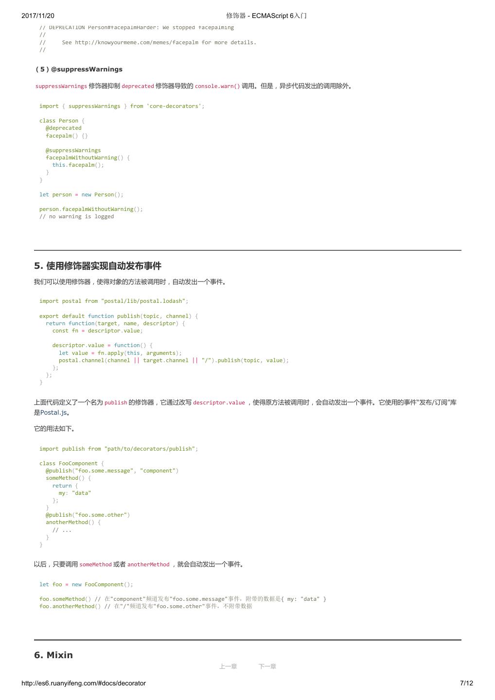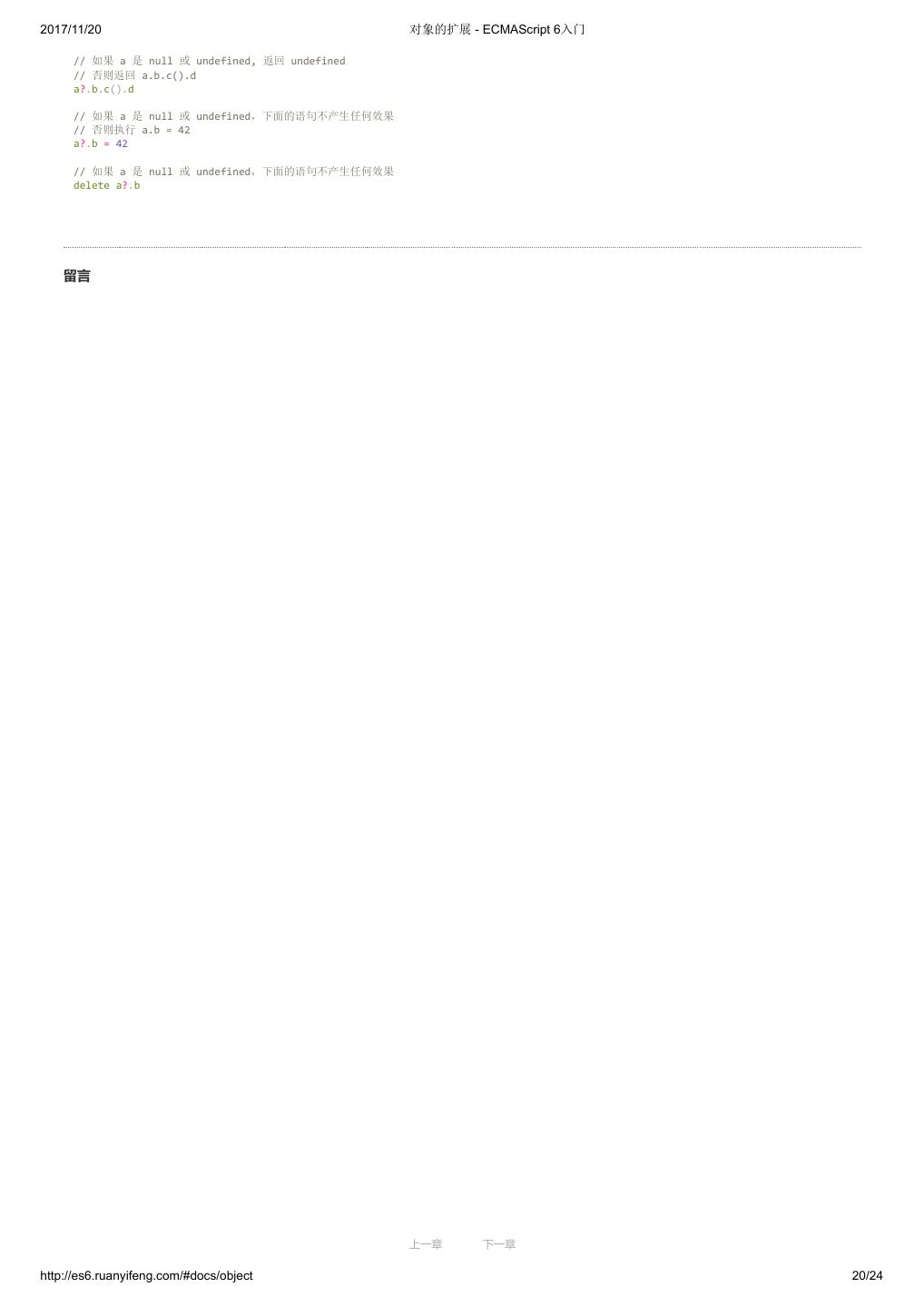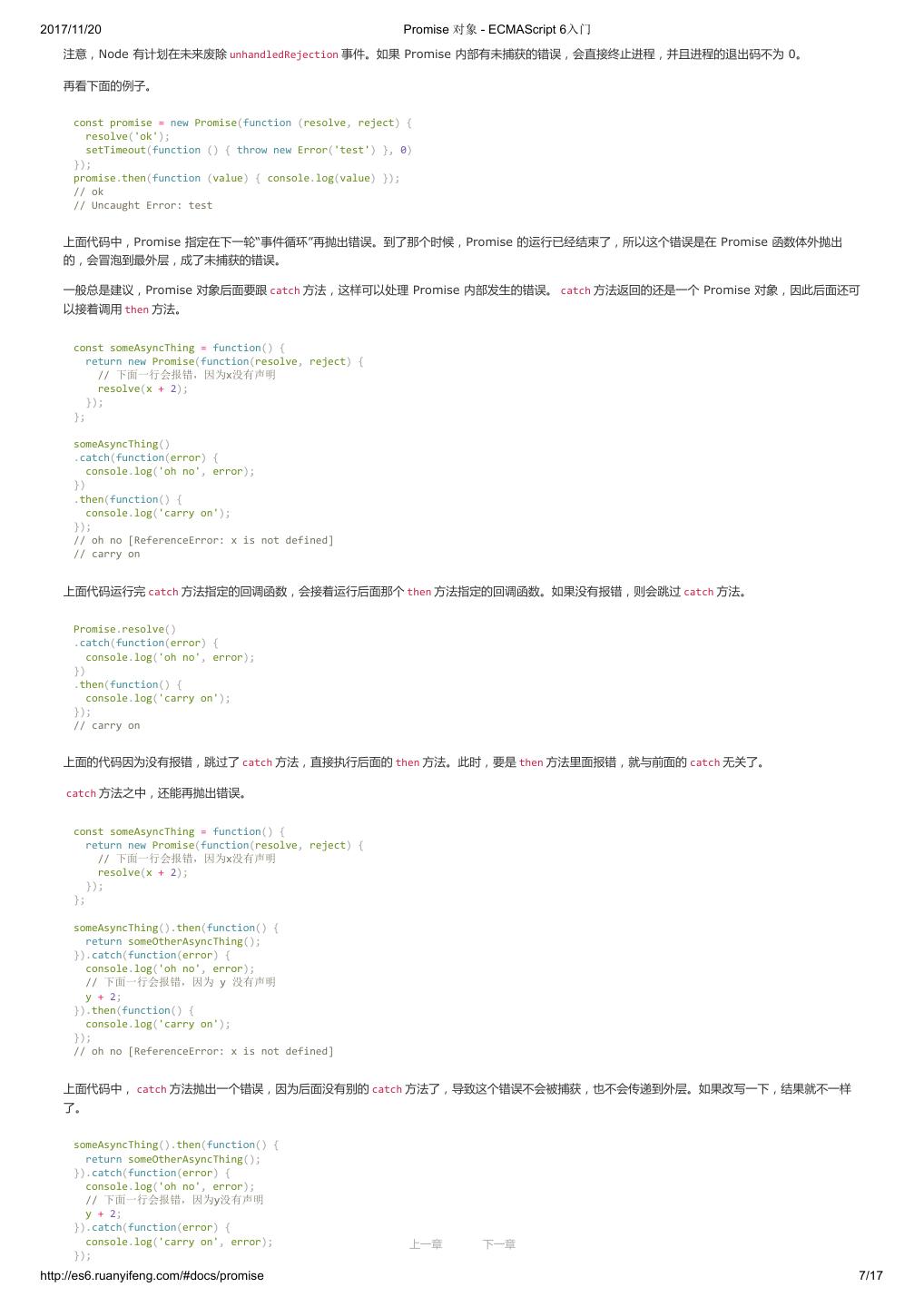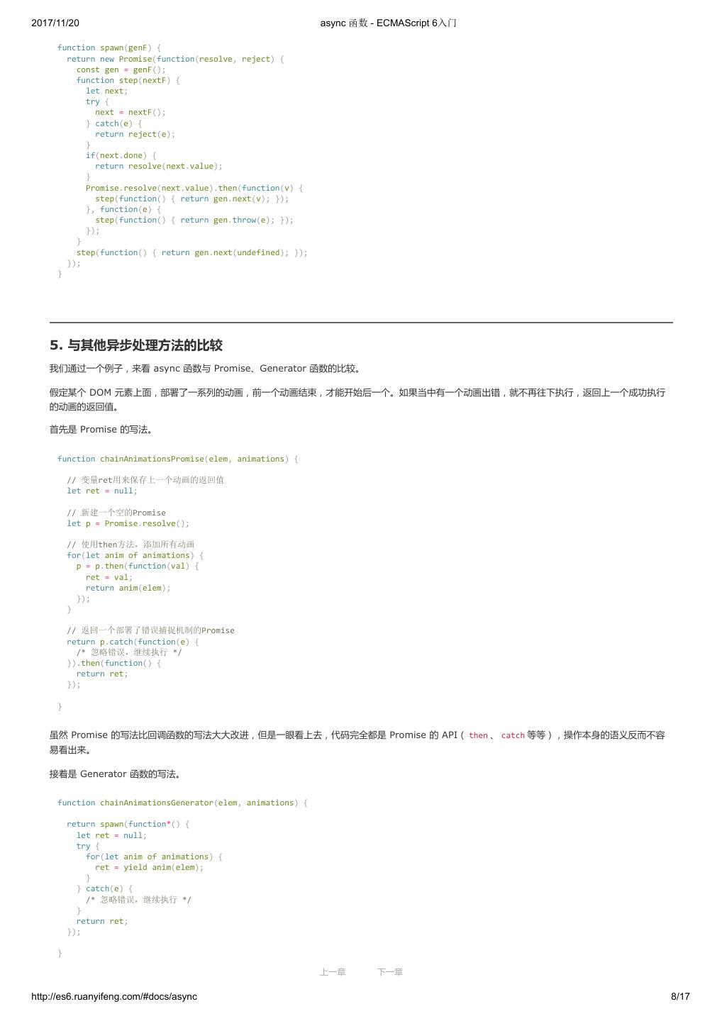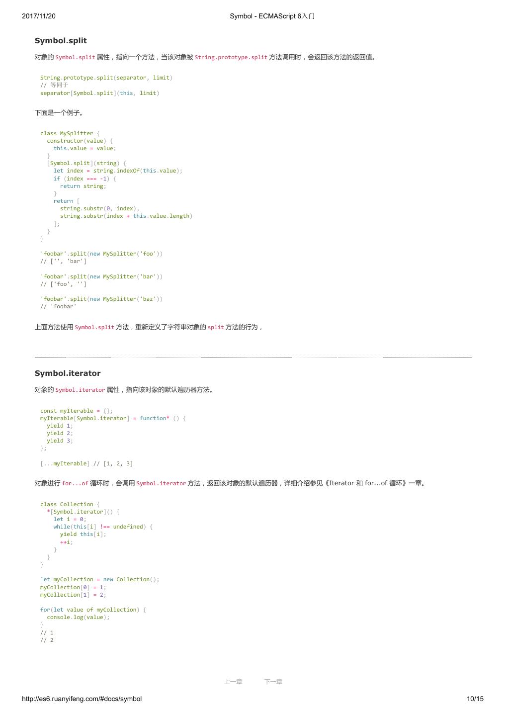 1 .2017/11/20 ECMAScript 6 入门 - ECMAScript 6入门 本书覆盖 ES6 与上一个版本 ES5 的所有不同之处,对涉及的语法知识给予详细介绍,并给出大量简洁易懂的示例代码。 本书为中级难度,适合已经掌握 ES5 的读者,用来了解这门语言的最新发展;也可当作参考手册,查寻新增的语法点。 全书已由电子工业出版社出版,2017年9月推出了第三版,书名为《ES6 标准入门》。纸版是基于网站内容排版印刷的。 感谢张春雨编辑支持我将全书开源的做法。如果您认可这本书,建议购买纸版。这样可以使出版社不因出版开源书籍而亏钱,进而鼓励更多的作者开源自 己的书籍。下面是第三版的购买地址。 - 淘宝 - 京东 - 当当 - 亚马逊 - China-pub 版权许可 本书采用“保持署名—非商用”创意共享4.0许可证。 只要保持原作者署名和非商用,您可以自由地阅读、分享、修改本书。 详细的法律条文请参见创意共享网站。 留言 下一章 http://es6.ruanyifeng.com/#undefined 2/2