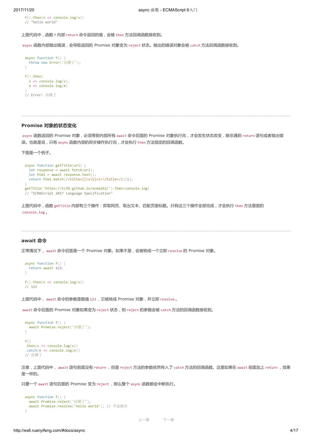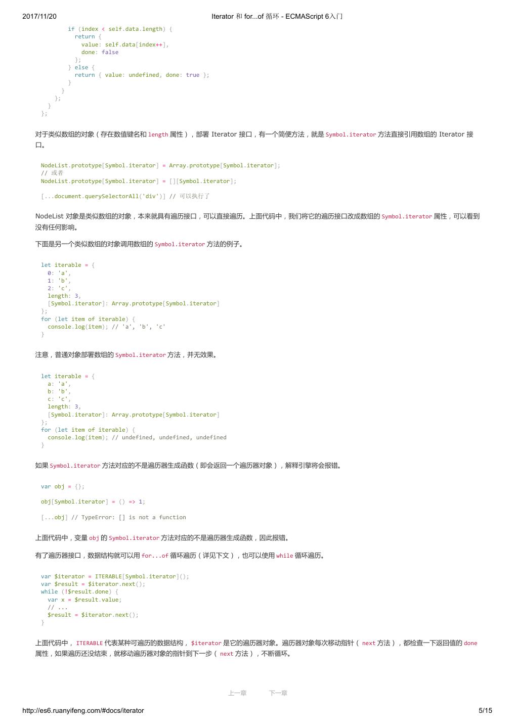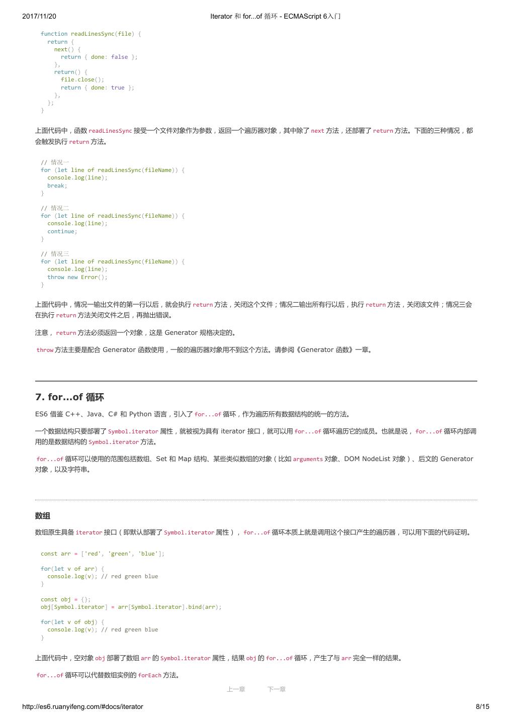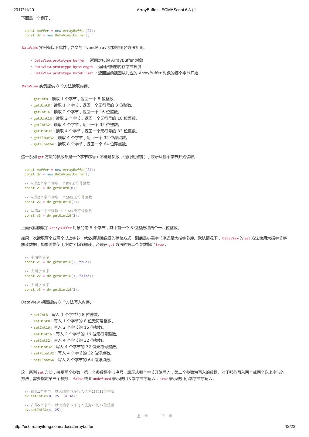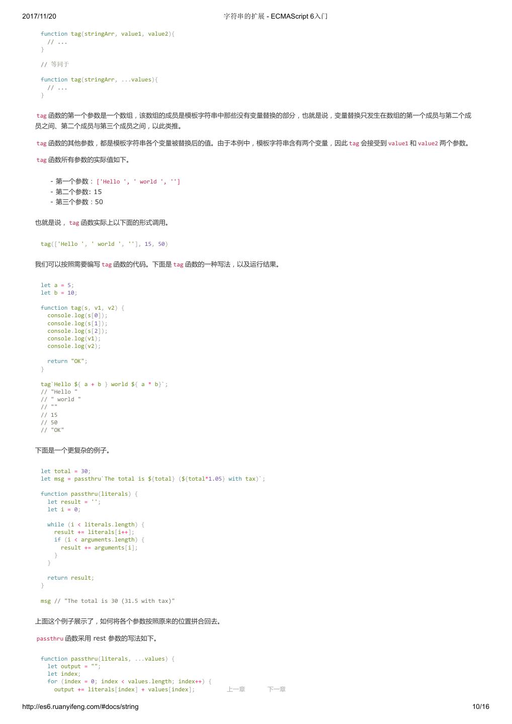 1 .2017/11/20 ECMAScript 6 入门 - ECMAScript 6入门 本书覆盖 ES6 与上一个版本 ES5 的所有不同之处,对涉及的语法知识给予详细介绍,并给出大量简洁易懂的示例代码。 本书为中级难度,适合已经掌握 ES5 的读者,用来了解这门语言的最新发展;也可当作参考手册,查寻新增的语法点。 全书已由电子工业出版社出版,2017年9月推出了第三版,书名为《ES6 标准入门》。纸版是基于网站内容排版印刷的。 感谢张春雨编辑支持我将全书开源的做法。如果您认可这本书,建议购买纸版。这样可以使出版社不因出版开源书籍而亏钱,进而鼓励更多的作者开源自 己的书籍。下面是第三版的购买地址。 - 淘宝 - 京东 - 当当 - 亚马逊 - China-pub 版权许可 本书采用“保持署名—非商用”创意共享4.0许可证。 只要保持原作者署名和非商用,您可以自由地阅读、分享、修改本书。 详细的法律条文请参见创意共享网站。 留言 下一章 http://es6.ruanyifeng.com/#undefined 2/2