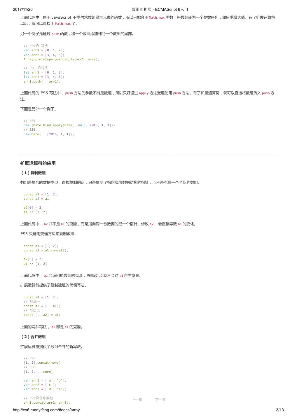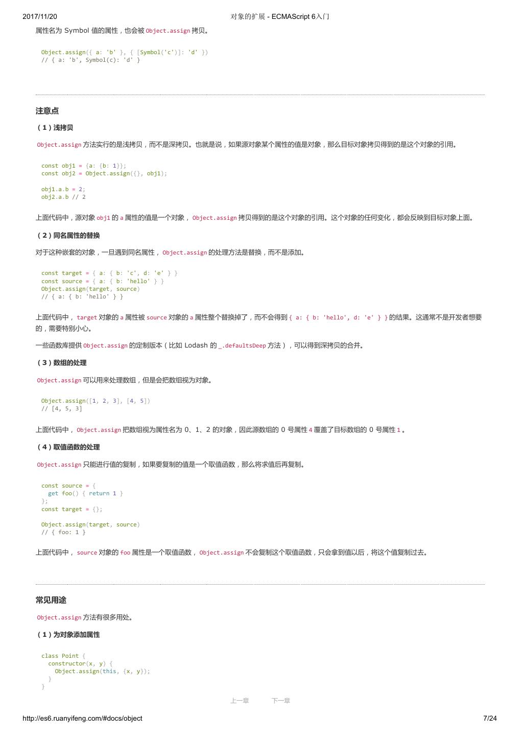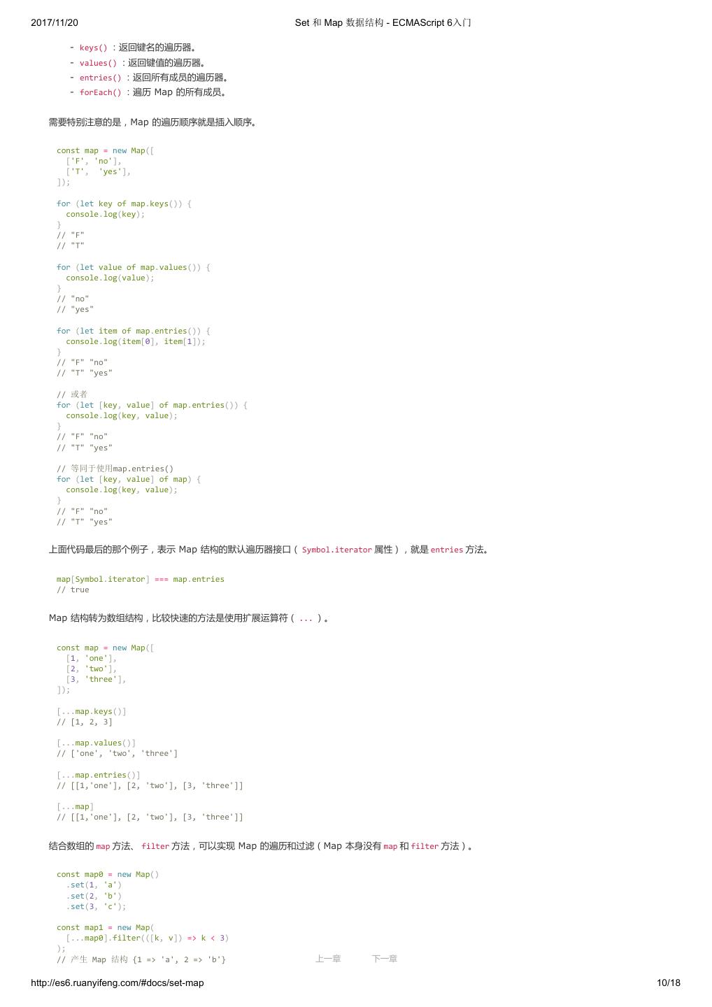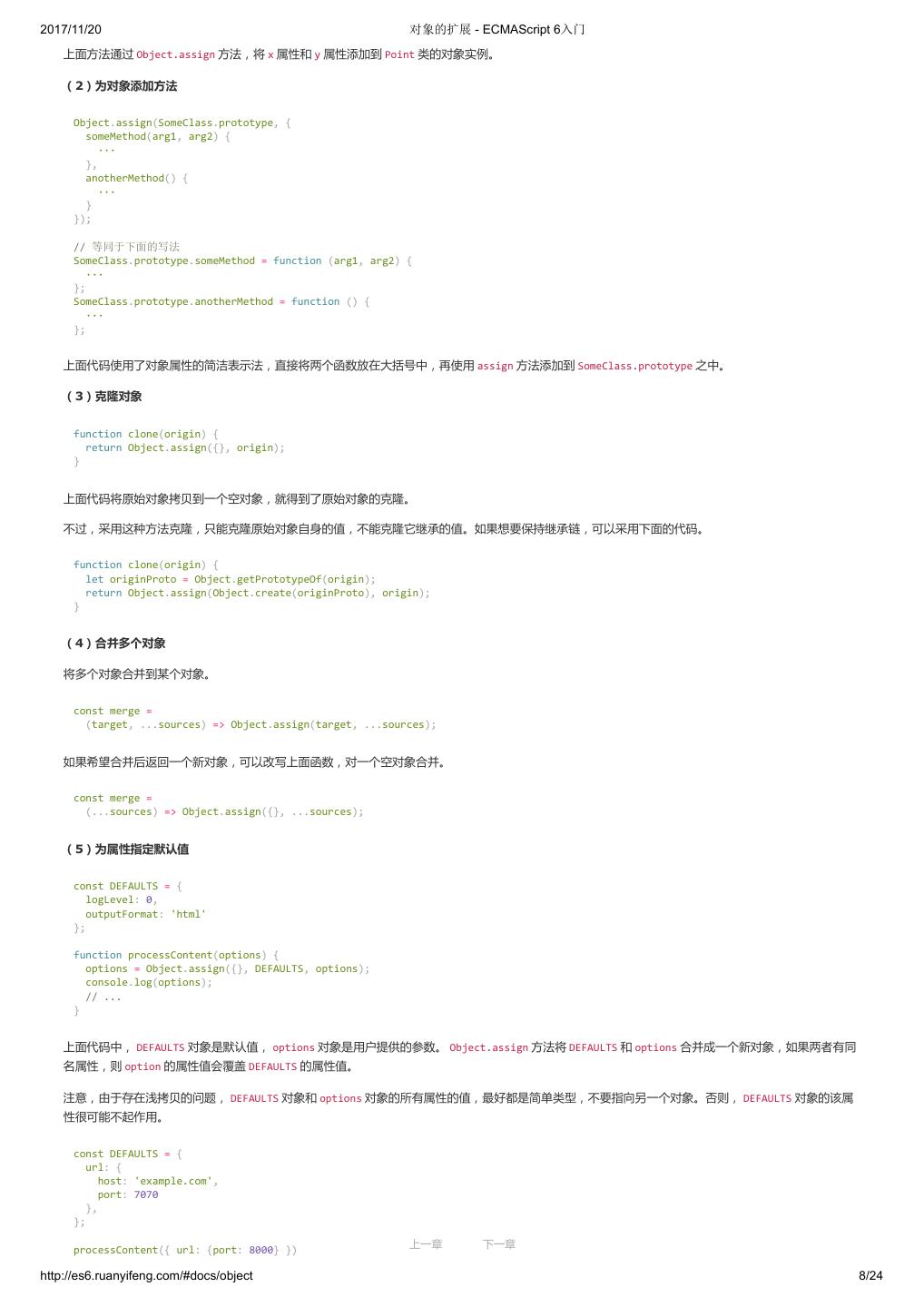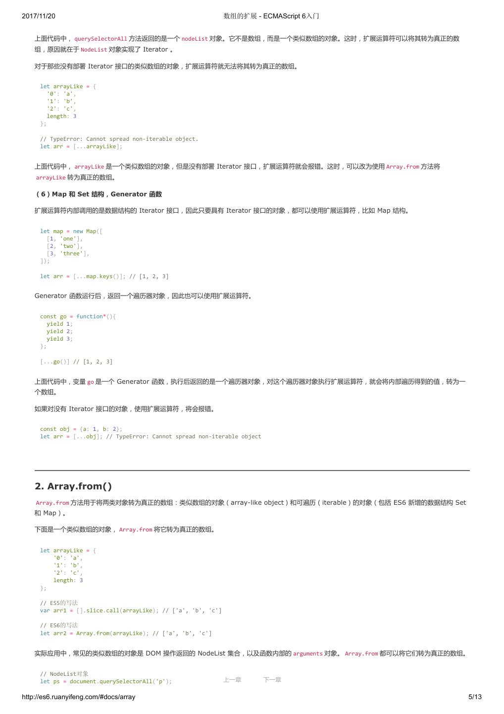 1 .2017/11/20 ECMAScript 6 入门 - ECMAScript 6入门 本书覆盖 ES6 与上一个版本 ES5 的所有不同之处,对涉及的语法知识给予详细介绍,并给出大量简洁易懂的示例代码。 本书为中级难度,适合已经掌握 ES5 的读者,用来了解这门语言的最新发展;也可当作参考手册,查寻新增的语法点。 全书已由电子工业出版社出版,2017年9月推出了第三版,书名为《ES6 标准入门》。纸版是基于网站内容排版印刷的。 感谢张春雨编辑支持我将全书开源的做法。如果您认可这本书,建议购买纸版。这样可以使出版社不因出版开源书籍而亏钱,进而鼓励更多的作者开源自 己的书籍。下面是第三版的购买地址。 - 淘宝 - 京东 - 当当 - 亚马逊 - China-pub 版权许可 本书采用“保持署名—非商用”创意共享4.0许可证。 只要保持原作者署名和非商用,您可以自由地阅读、分享、修改本书。 详细的法律条文请参见创意共享网站。 留言 下一章 http://es6.ruanyifeng.com/#undefined 2/2
