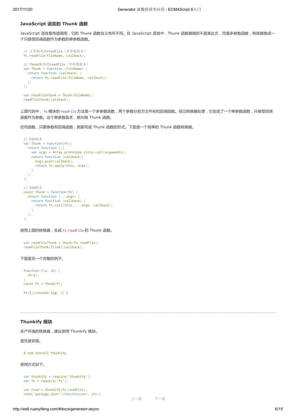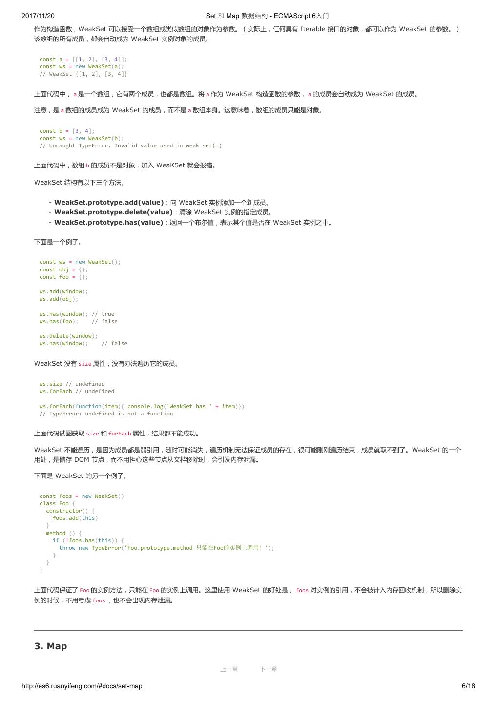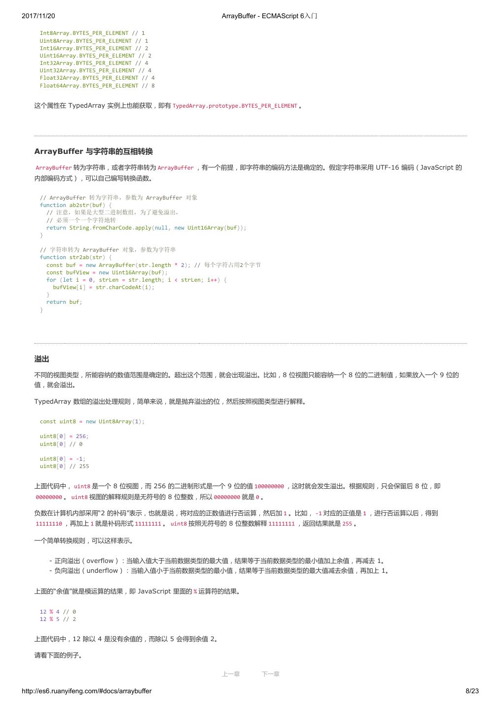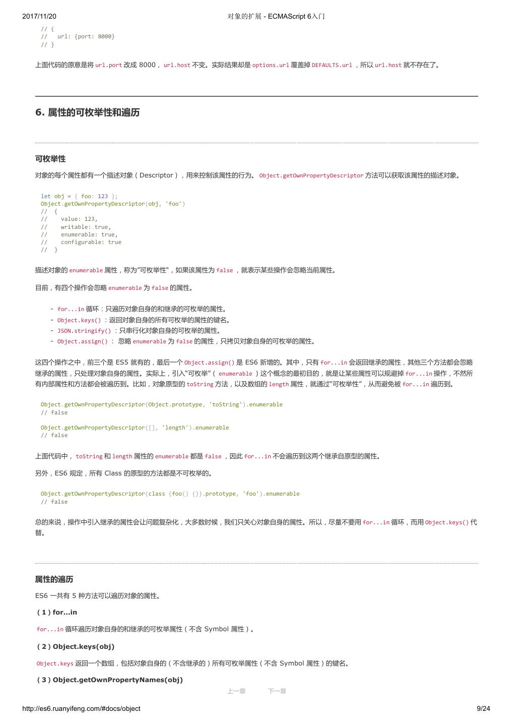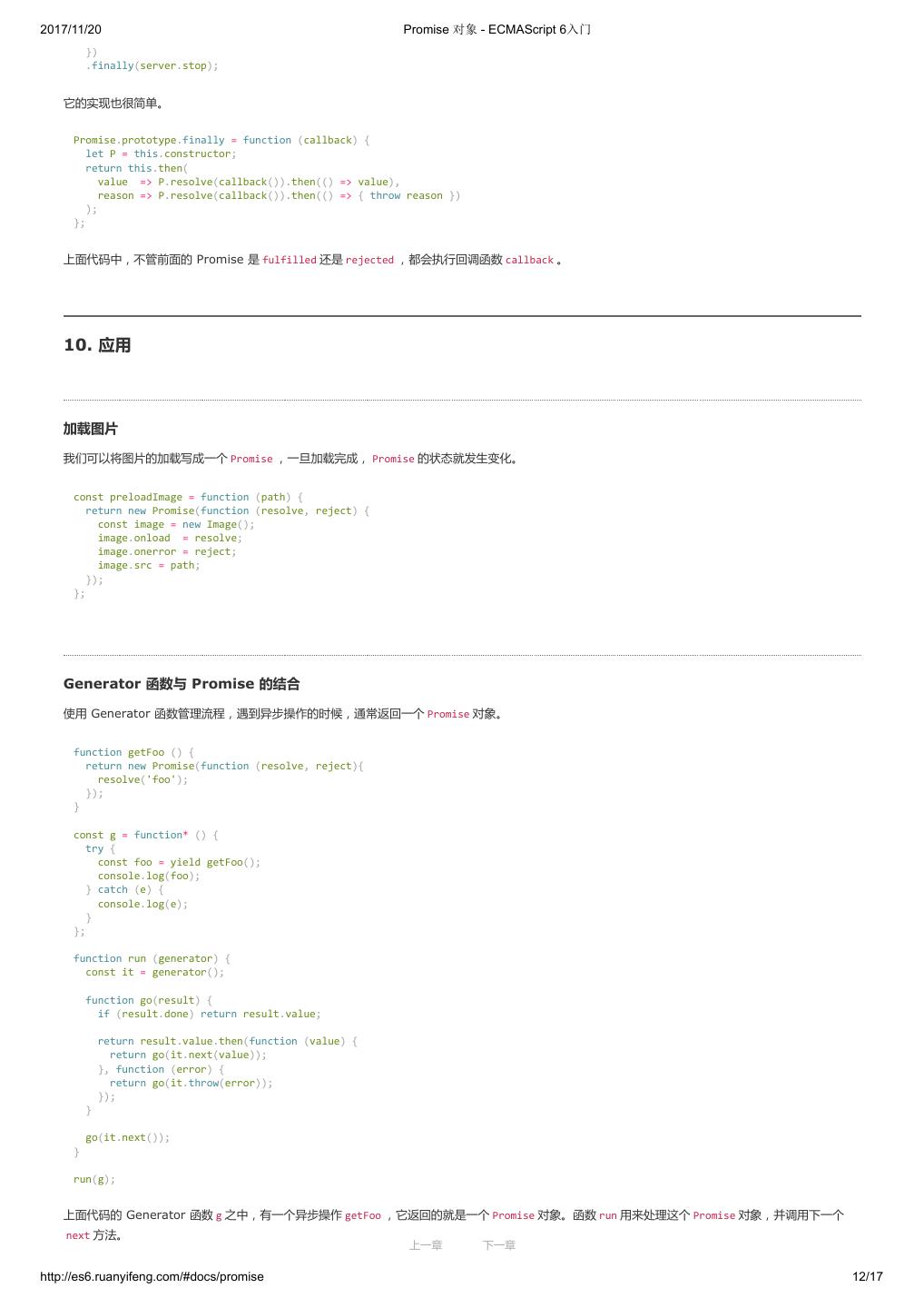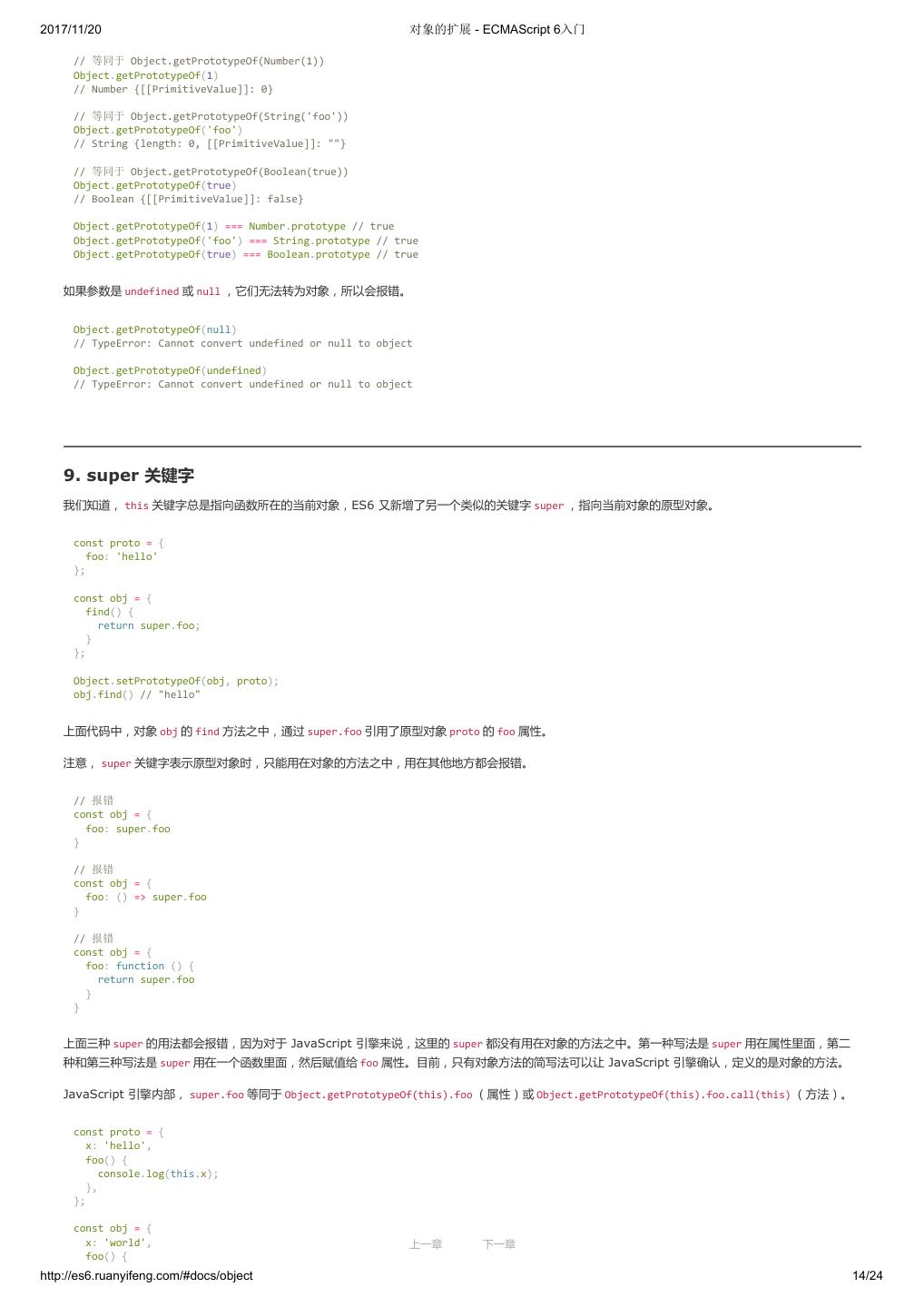 1 .2017/11/20 ECMAScript 6 入门 - ECMAScript 6入门 本书覆盖 ES6 与上一个版本 ES5 的所有不同之处,对涉及的语法知识给予详细介绍,并给出大量简洁易懂的示例代码。 本书为中级难度,适合已经掌握 ES5 的读者,用来了解这门语言的最新发展;也可当作参考手册,查寻新增的语法点。 全书已由电子工业出版社出版,2017年9月推出了第三版,书名为《ES6 标准入门》。纸版是基于网站内容排版印刷的。 感谢张春雨编辑支持我将全书开源的做法。如果您认可这本书,建议购买纸版。这样可以使出版社不因出版开源书籍而亏钱,进而鼓励更多的作者开源自 己的书籍。下面是第三版的购买地址。 - 淘宝 - 京东 - 当当 - 亚马逊 - China-pub 版权许可 本书采用“保持署名—非商用”创意共享4.0许可证。 只要保持原作者署名和非商用,您可以自由地阅读、分享、修改本书。 详细的法律条文请参见创意共享网站。 留言 下一章 http://es6.ruanyifeng.com/#undefined 2/2