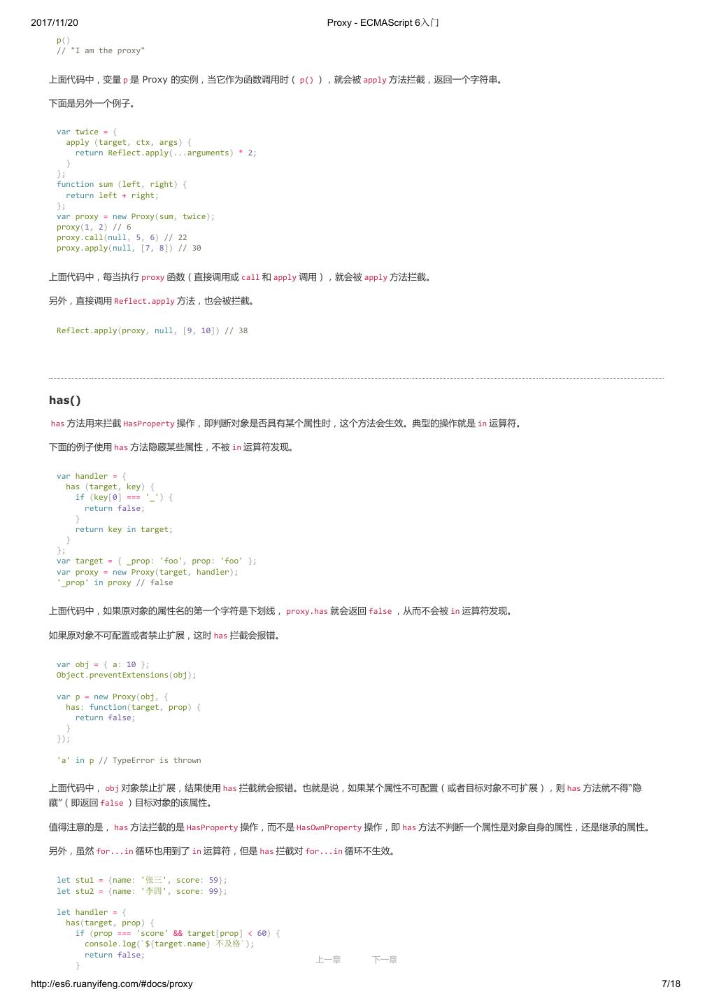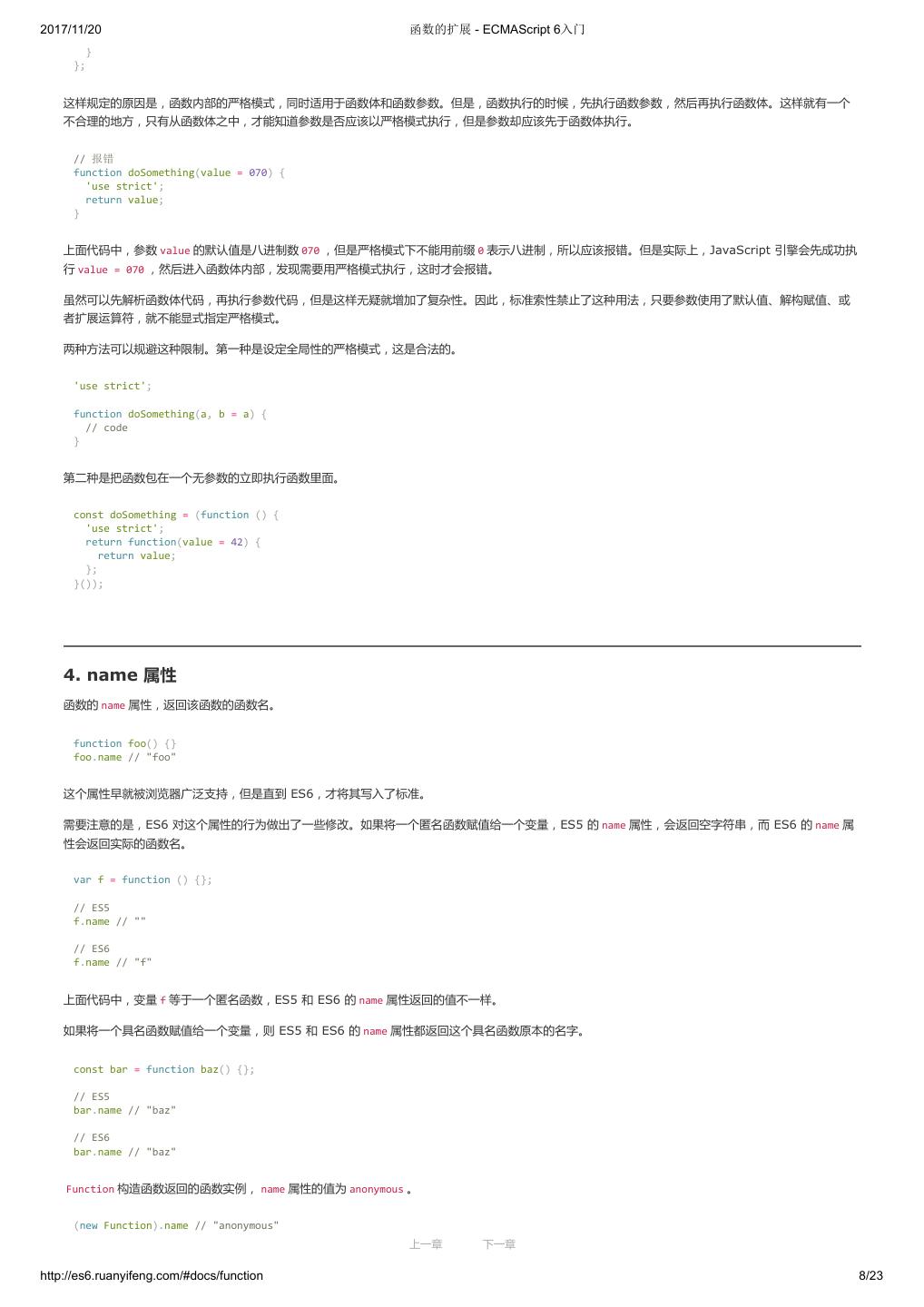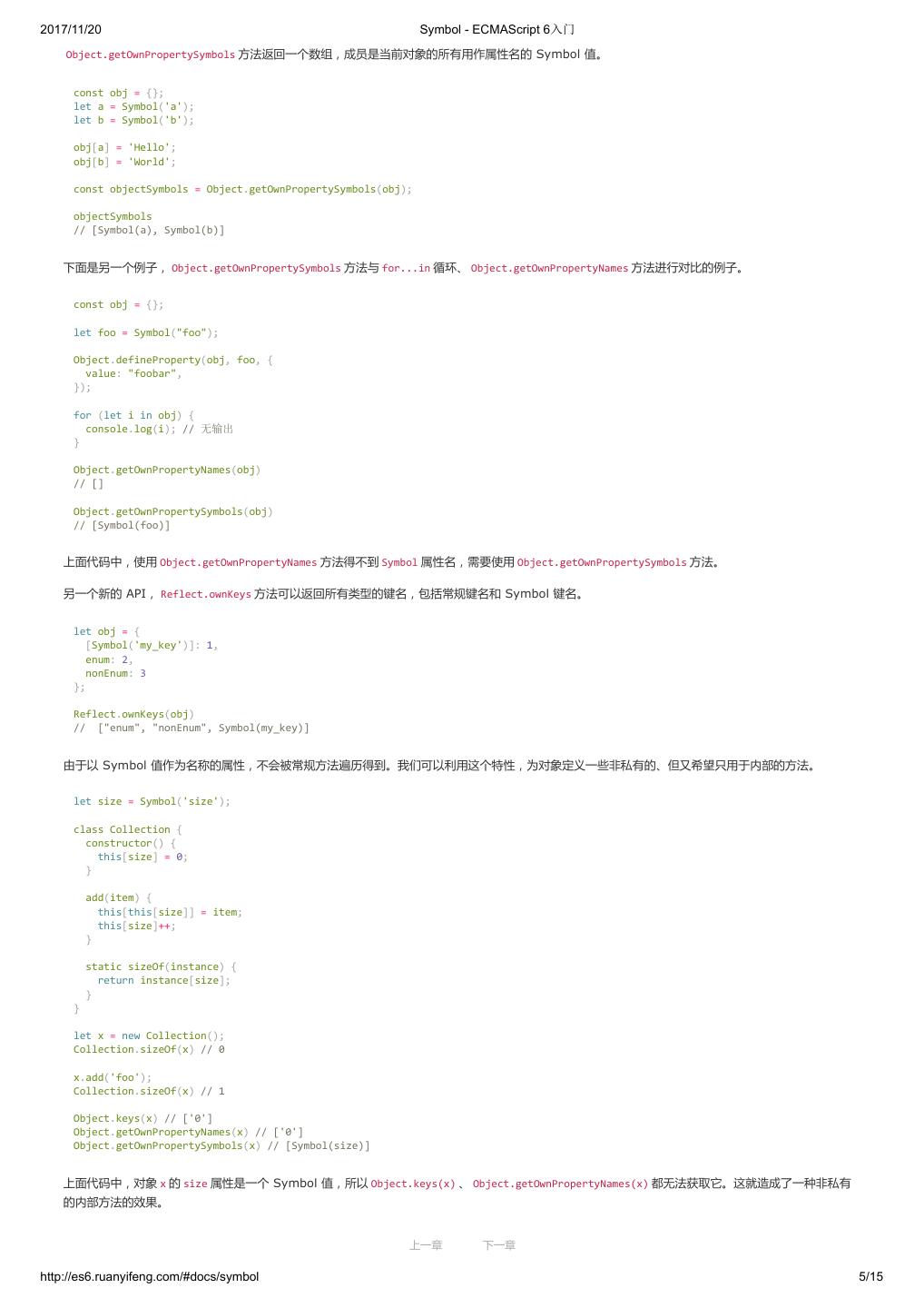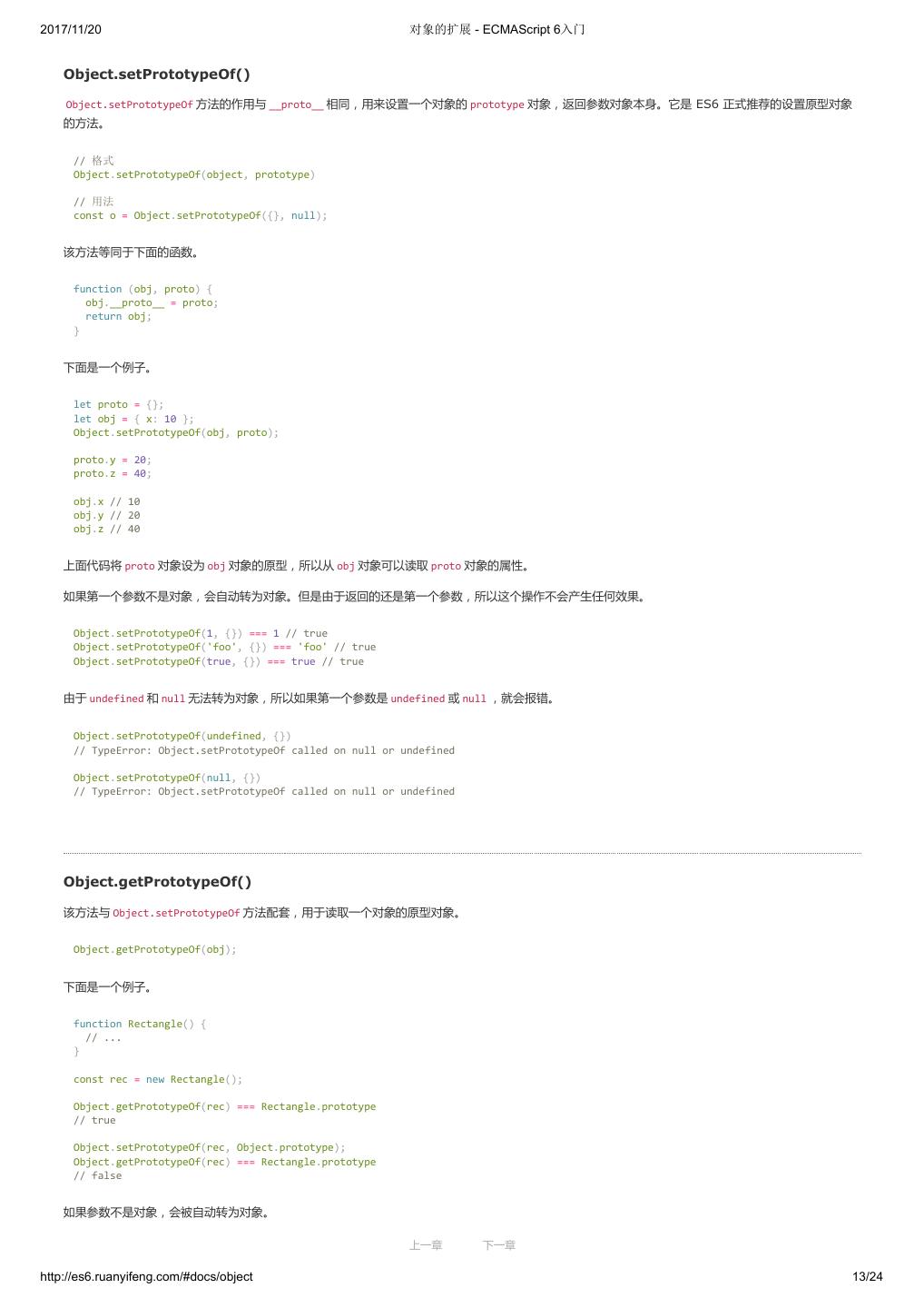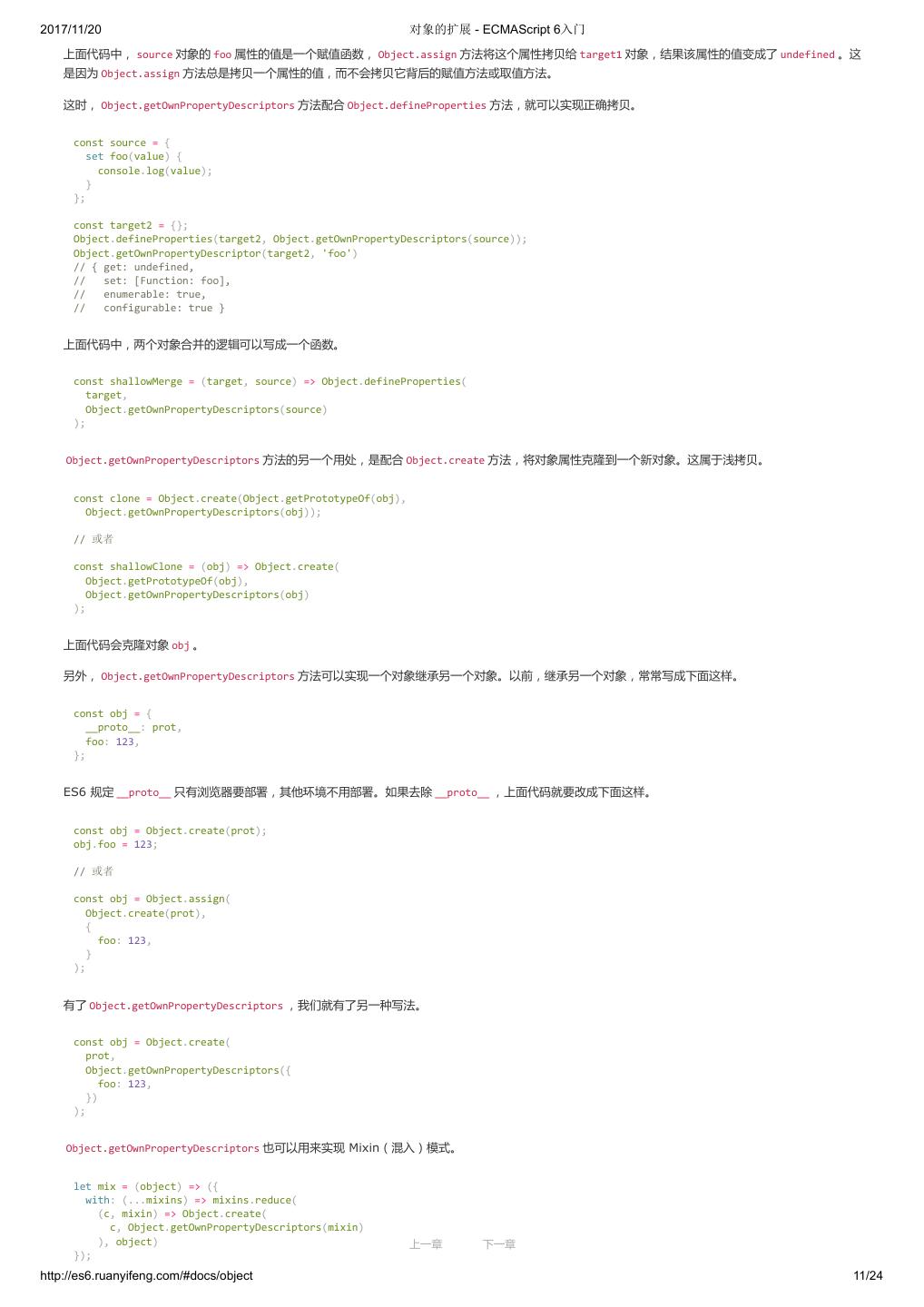1 .2017/11/20 ECMAScript 6 入门 - ECMAScript 6入门 本书覆盖 ES6 与上一个版本 ES5 的所有不同之处,对涉及的语法知识给予详细介绍,并给出大量简洁易懂的示例代码。 本书为中级难度,适合已经掌握 ES5 的读者,用来了解这门语言的最新发展;也可当作参考手册,查寻新增的语法点。 全书已由电子工业出版社出版,2017年9月推出了第三版,书名为《ES6 标准入门》。纸版是基于网站内容排版印刷的。 感谢张春雨编辑支持我将全书开源的做法。如果您认可这本书,建议购买纸版。这样可以使出版社不因出版开源书籍而亏钱,进而鼓励更多的作者开源自 己的书籍。下面是第三版的购买地址。 - 淘宝 - 京东 - 当当 - 亚马逊 - China-pub 版权许可 本书采用“保持署名—非商用”创意共享4.0许可证。 只要保持原作者署名和非商用,您可以自由地阅读、分享、修改本书。 详细的法律条文请参见创意共享网站。 留言 下一章 http://es6.ruanyifeng.com/#undefined 2/2