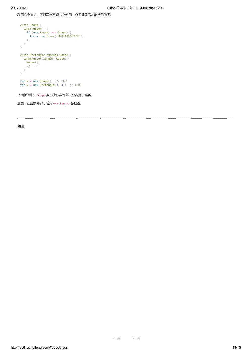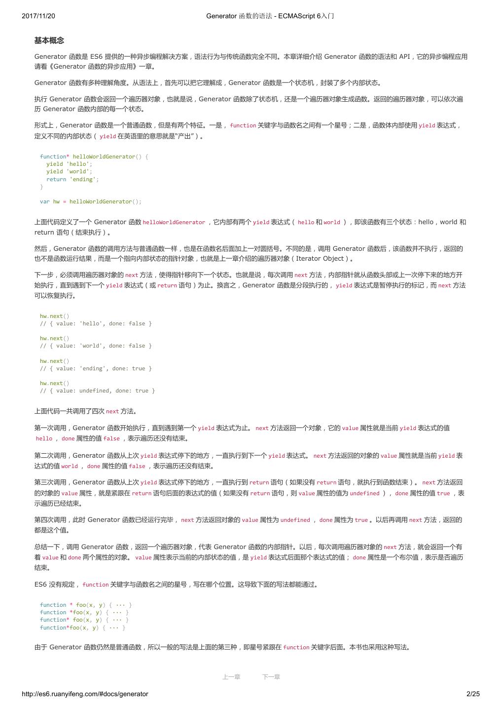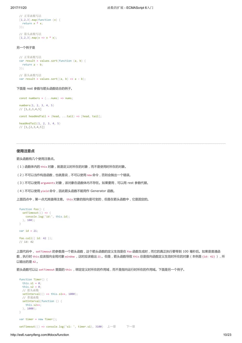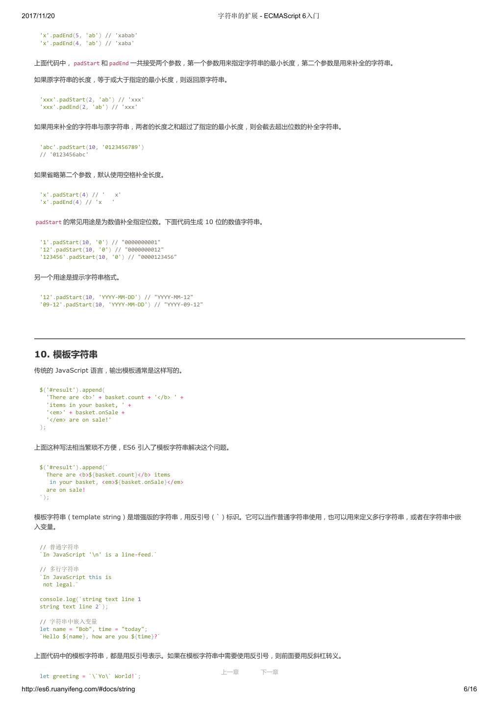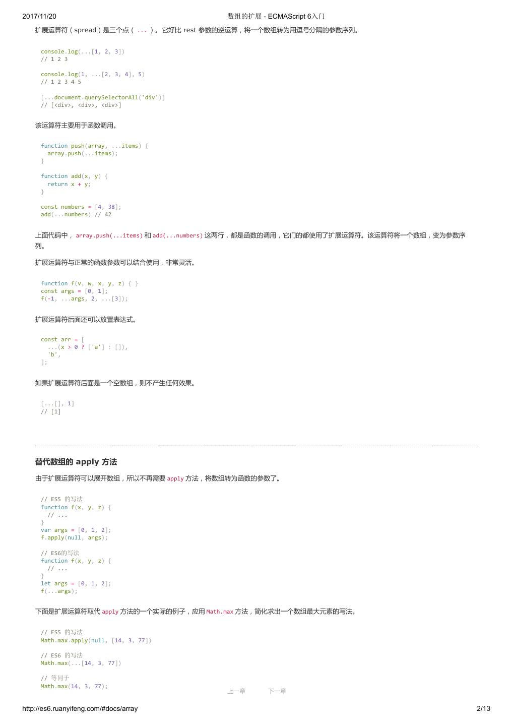 1 .2017/11/20 ECMAScript 6 入门 - ECMAScript 6入门 本书覆盖 ES6 与上一个版本 ES5 的所有不同之处,对涉及的语法知识给予详细介绍,并给出大量简洁易懂的示例代码。 本书为中级难度,适合已经掌握 ES5 的读者,用来了解这门语言的最新发展;也可当作参考手册,查寻新增的语法点。 全书已由电子工业出版社出版,2017年9月推出了第三版,书名为《ES6 标准入门》。纸版是基于网站内容排版印刷的。 感谢张春雨编辑支持我将全书开源的做法。如果您认可这本书,建议购买纸版。这样可以使出版社不因出版开源书籍而亏钱,进而鼓励更多的作者开源自 己的书籍。下面是第三版的购买地址。 - 淘宝 - 京东 - 当当 - 亚马逊 - China-pub 版权许可 本书采用“保持署名—非商用”创意共享4.0许可证。 只要保持原作者署名和非商用,您可以自由地阅读、分享、修改本书。 详细的法律条文请参见创意共享网站。 留言 下一章 http://es6.ruanyifeng.com/#undefined 2/2