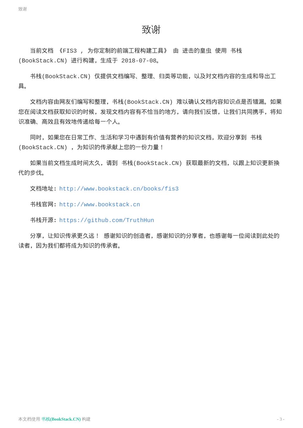 3 .致谢 致谢 当前文档 《FIS3 , 为你定制的前端工程构建工具》 由 进击的皇虫 使用 书栈 (BookStack.CN) 进行构建,生成于 2018-07-08。 书栈(BookStack.CN) 仅提供文档编写、整理、归类等功能,以及对文档内容的生成和导出工 具。 文档内容由网友们编写和整理,书栈(BookStack.CN) 难以确认文档内容知识点是否错漏。如果 您在阅读文档获取知识的时候,发现文档内容有不恰当的地方,请向我们反馈,让我们共同携手,将知 识准确、高效且有效地传递给每一个人。 同时,如果您在日常工作、生活和学习中遇到有价值有营养的知识文档,欢迎分享到 书栈 (BookStack.CN) ,为知识的传承献上您的一份力量! 如果当前文档生成时间太久,请到 书栈(BookStack.CN) 获取最新的文档,以跟上知识更新换 代的步伐。 文档地址:http://www.bookstack.cn/books/fis3 书栈官网:http://www.bookstack.cn 书栈开源:https://github.com/TruthHun 分享,让知识传承更久远! 感谢知识的创造者,感谢知识的分享者,也感谢每一位阅读到此处的 读者,因为我们都将成为知识的传承者。 本文档使用 书栈(BookStack.CN) 构建 - 3 -