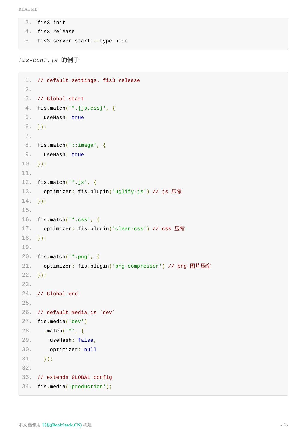 5 .README 3. fis3 init 4. fis3 release 5. fis3 server start --type node fis-conf.js 的例子 1. // default settings. fis3 release 2. 3. // Global start 4. fis.match('*.{js,css}', { 5. useHash: true 6. }); 7. 8. fis.match('::image', { 9. useHash: true 10. }); 11. 12. fis.match('*.js', { 13. optimizer: fis.plugin('uglify-js') // js 压缩 14. }); 15. 16. fis.match('*.css', { 17. optimizer: fis.plugin('clean-css') // css 压缩 18. }); 19. 20. fis.match('*.png', { 21. optimizer: fis.plugin('png-compressor') // png 图片压缩 22. }); 23. 24. // Global end 25. 26. // default media is `dev` 27. fis.media('dev') 28. .match('*', { 29. useHash: false, 30. optimizer: null 31. }); 32. 33. // extends GLOBAL config 34. fis.media('production'); 本文档使用 书栈(BookStack.CN) 构建 - 5 -