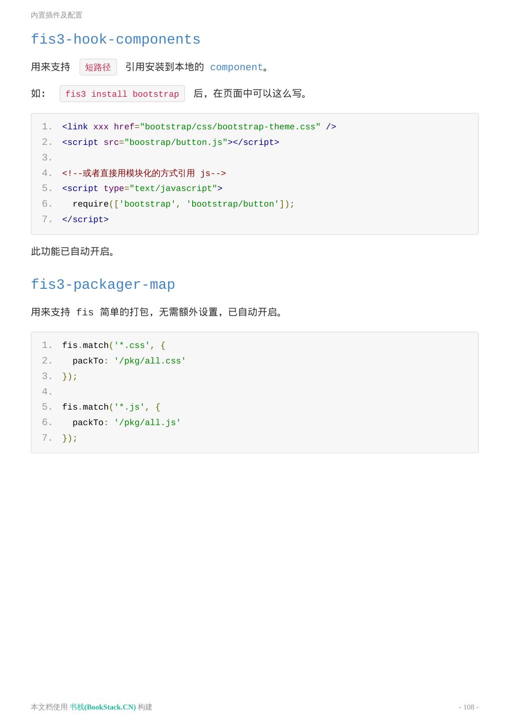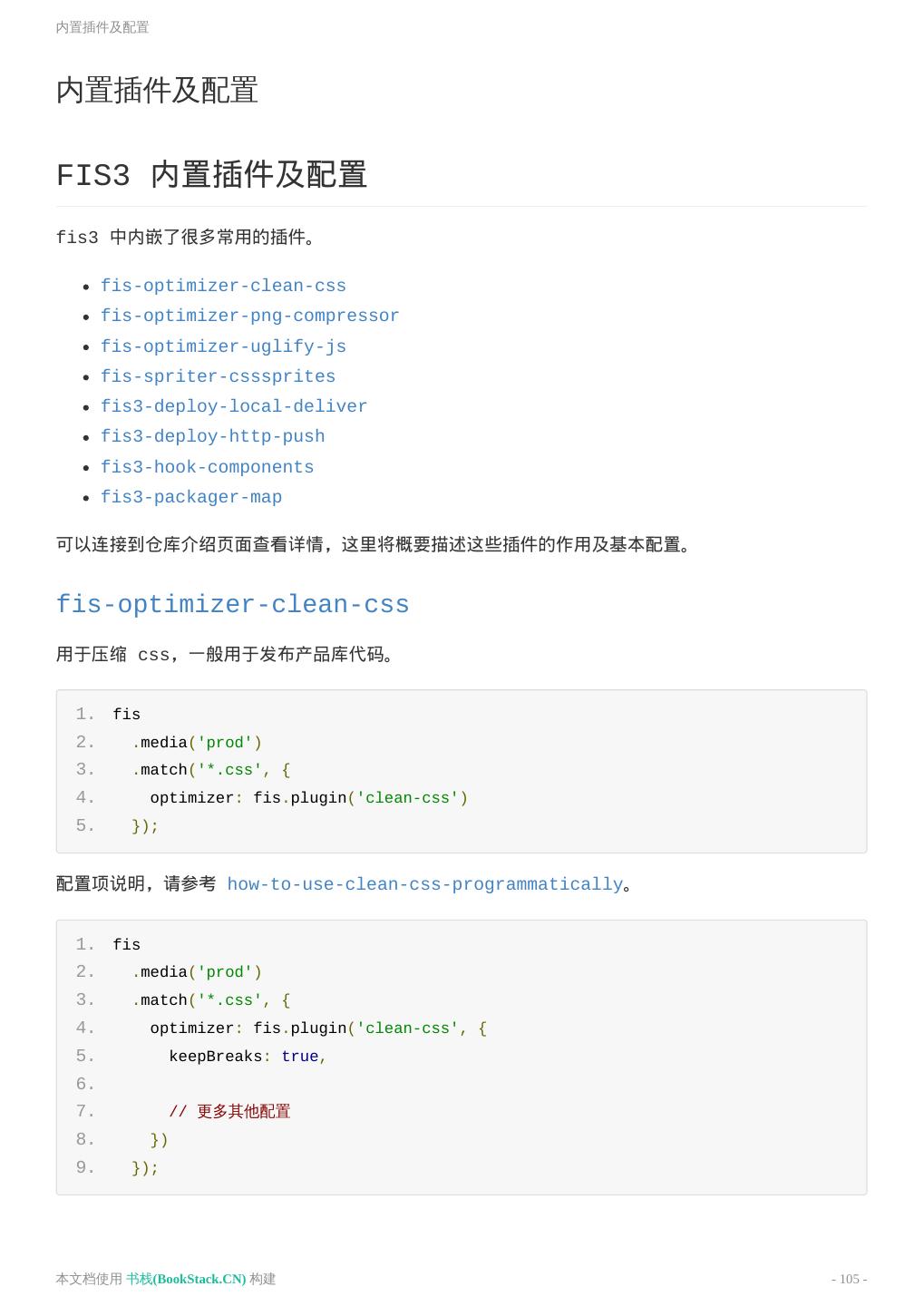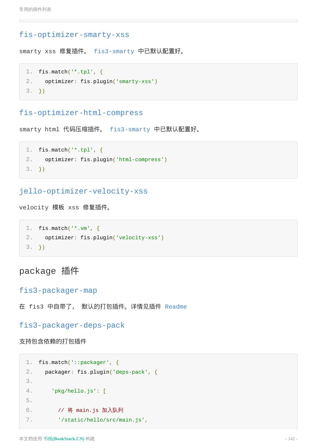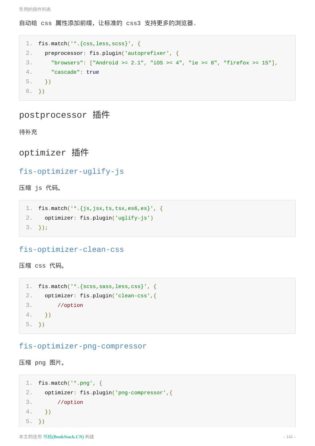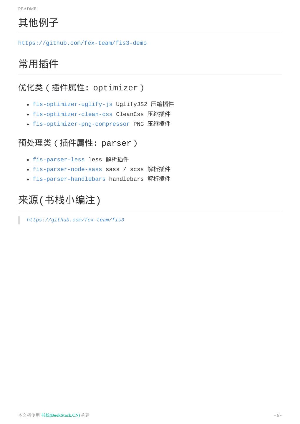 6 .README 其他例子 https://github.com/fex-team/fis3-demo 常用插件 优化类(插件属性:optimizer) fis-optimizer-uglify-js UglifyJS2 压缩插件 fis-optimizer-clean-css CleanCss 压缩插件 fis-optimizer-png-compressor PNG 压缩插件 预处理类(插件属性:parser) fis-parser-less less 解析插件 fis-parser-node-sass sass / scss 解析插件 fis-parser-handlebars handlebars 解析插件 来源(书栈小编注) https://github.com/fex-team/fis3 本文档使用 书栈(BookStack.CN) 构建 - 6 -