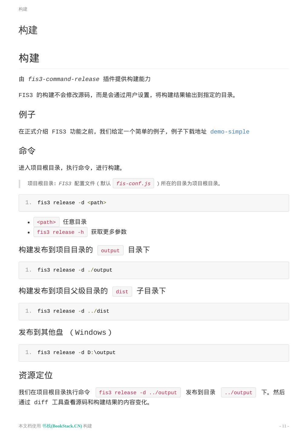 11 .构建 构建 构建 由 fis3-command-release 插件提供构建能力 FIS3 的构建不会修改源码,而是会通过用户设置,将构建结果输出到指定的目录。 例子 在正式介绍 FIS3 功能之前,我们给定一个简单的例子,例子下载地址 demo-simple 命令 进入项目根目录,执行命令,进行构建。 项目根目录:FIS3 配置文件(默认 fis-conf.js )所在的目录为项目根目录。 1. fis3 release -d <path> <path> 任意目录 fis3 release -h 获取更多参数 构建发布到项目目录的 output 目录下 1. fis3 release -d ./output 构建发布到项目父级目录的 dist 子目录下 1. fis3 release -d ../dist 发布到其他盘 (Windows) 1. fis3 release -d D:\output 资源定位 我们在项目根目录执行命令 fis3 release -d ../output 发布到目录 ../output 下。然后 通过 diff 工具查看源码和构建结果的内容变化。 本文档使用 书栈(BookStack.CN) 构建 - 11 -