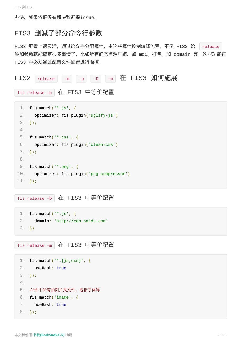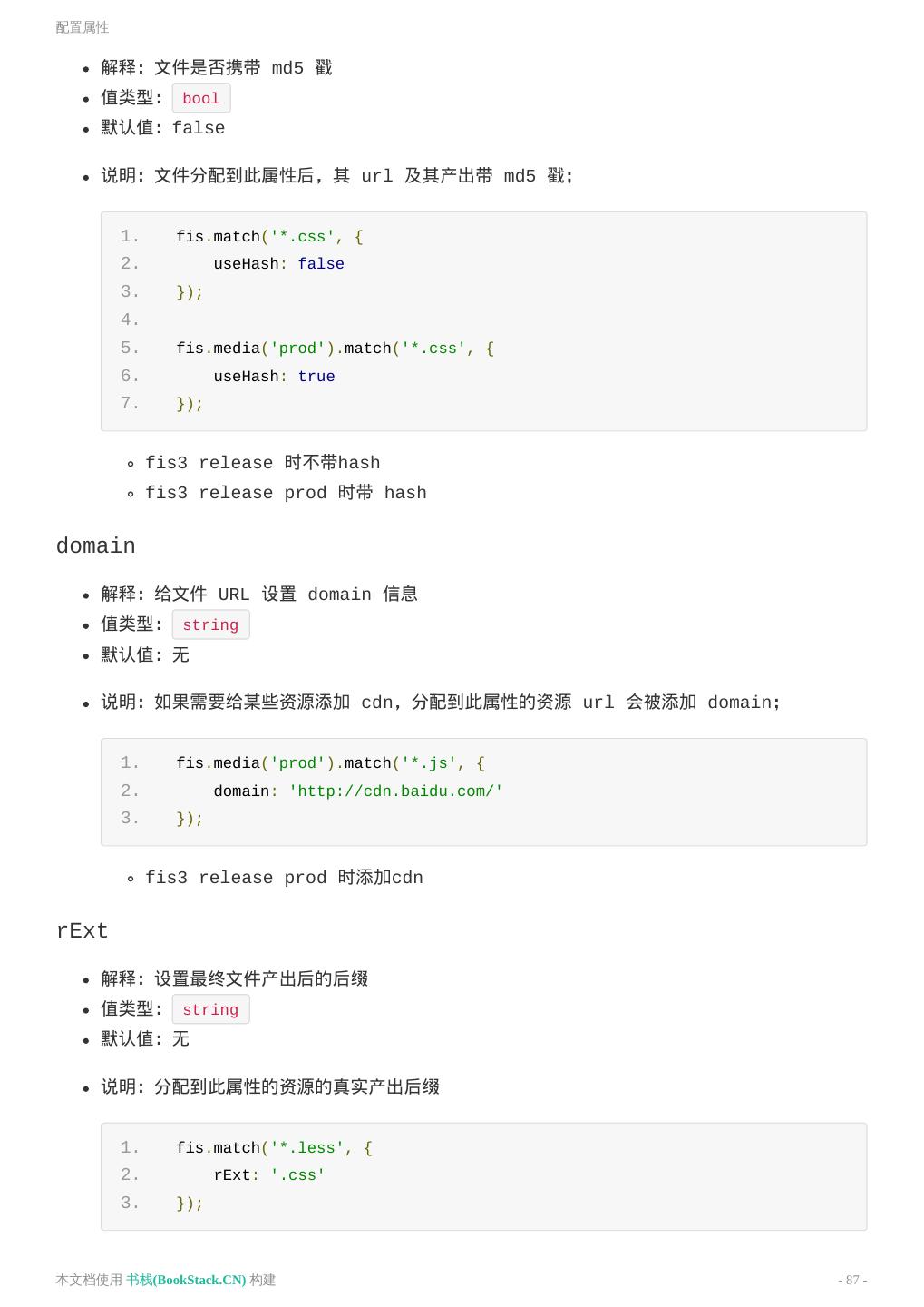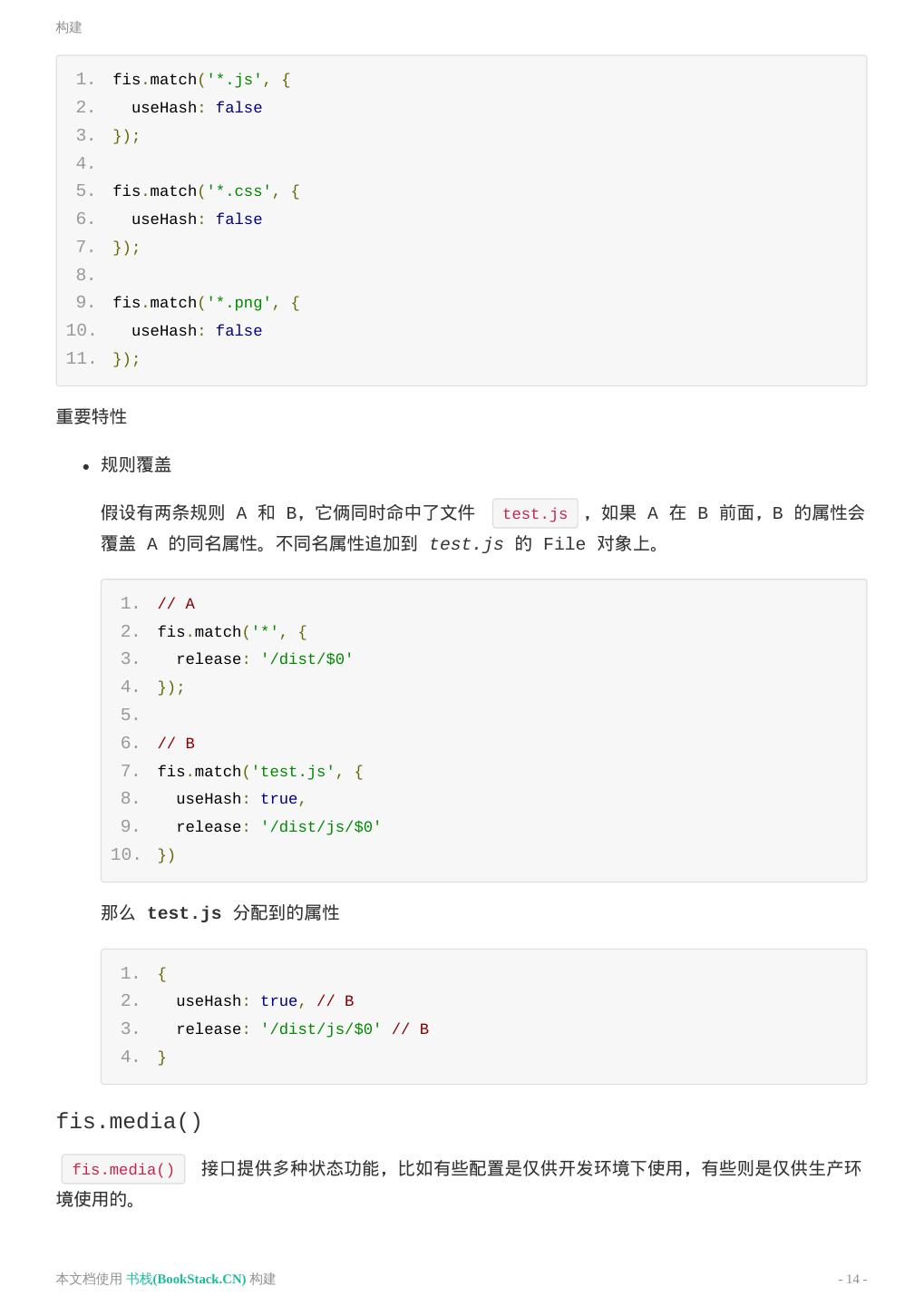 14 .构建 1. fis.match('*.js', { 2. useHash: false 3. }); 4. 5. fis.match('*.css', { 6. useHash: false 7. }); 8. 9. fis.match('*.png', { 10. useHash: false 11. }); 重要特性 规则覆盖 假设有两条规则 A 和 B,它俩同时命中了文件 test.js ,如果 A 在 B 前面,B 的属性会 覆盖 A 的同名属性。不同名属性追加到 test.js 的 File 对象上。 1. // A 2. fis.match('*', { 3. release: '/dist/$0' 4. }); 5. 6. // B 7. fis.match('test.js', { 8. useHash: true, 9. release: '/dist/js/$0' 10. }) 那么 test.js 分配到的属性 1. { 2. useHash: true, // B 3. release: '/dist/js/$0' // B 4. } fis.media() fis.media() 接口提供多种状态功能,比如有些配置是仅供开发环境下使用,有些则是仅供生产环 境使用的。 本文档使用 书栈(BookStack.CN) 构建 - 14 -