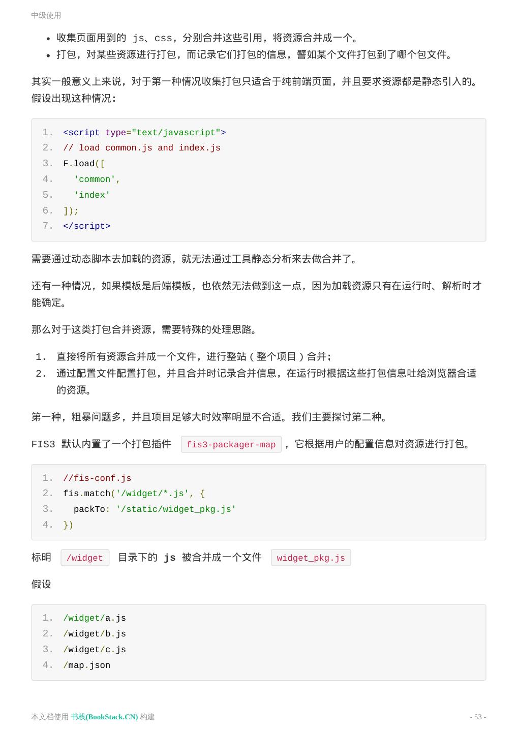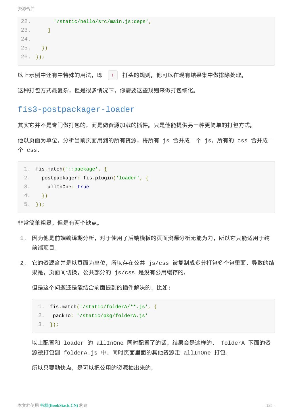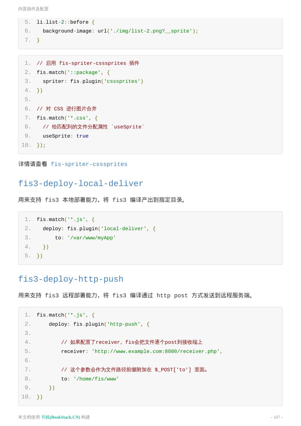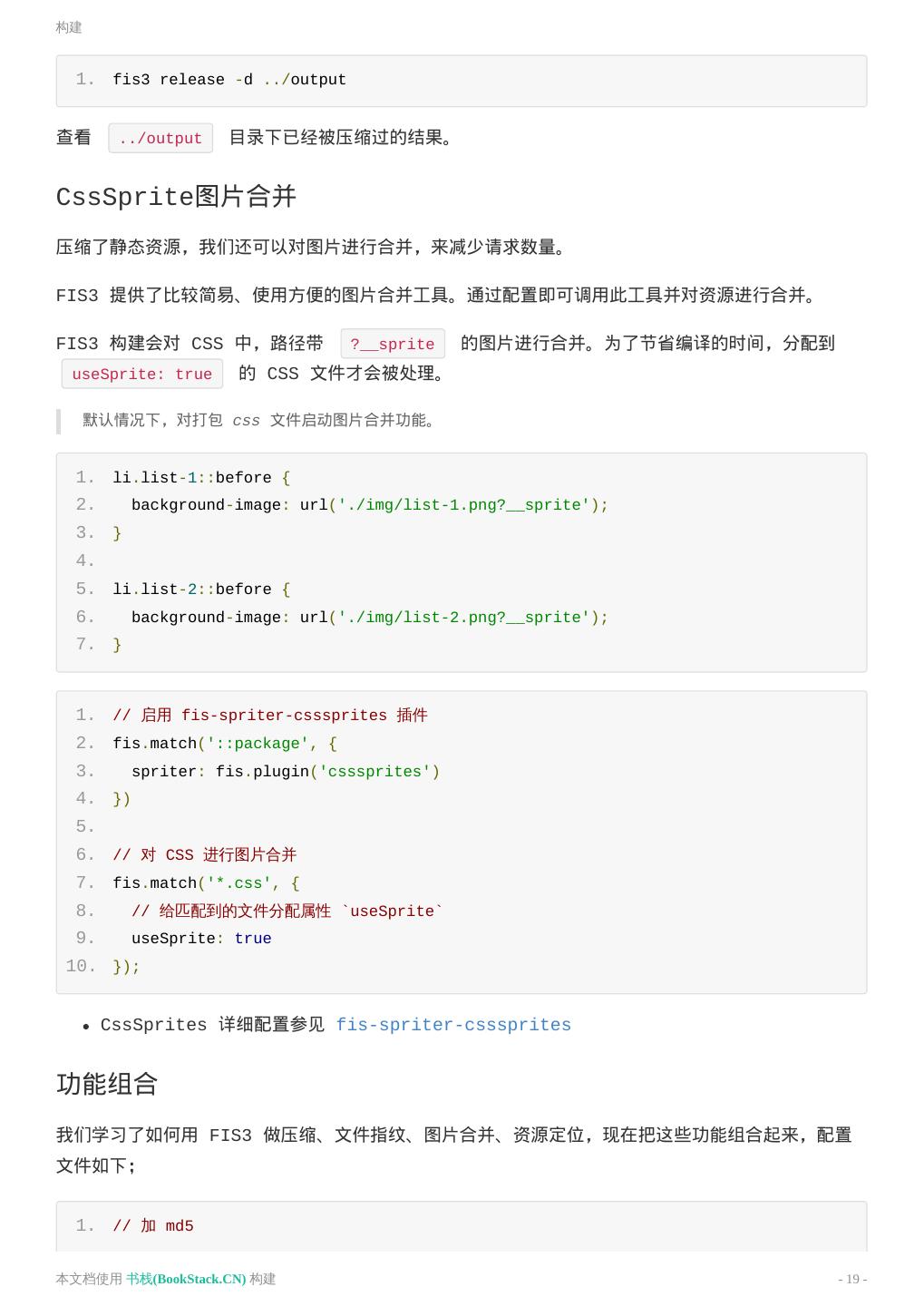 19 .构建 1. fis3 release -d ../output 查看 ../output 目录下已经被压缩过的结果。 CssSprite图片合并 压缩了静态资源,我们还可以对图片进行合并,来减少请求数量。 FIS3 提供了比较简易、使用方便的图片合并工具。通过配置即可调用此工具并对资源进行合并。 FIS3 构建会对 CSS 中,路径带 ?__sprite 的图片进行合并。为了节省编译的时间,分配到 useSprite: true 的 CSS 文件才会被处理。 默认情况下,对打包 css 文件启动图片合并功能。 1. li.list-1::before { 2. background-image: url('./img/list-1.png?__sprite'); 3. } 4. 5. li.list-2::before { 6. background-image: url('./img/list-2.png?__sprite'); 7. } 1. // 启用 fis-spriter-csssprites 插件 2. fis.match('::package', { 3. spriter: fis.plugin('csssprites') 4. }) 5. 6. // 对 CSS 进行图片合并 7. fis.match('*.css', { 8. // 给匹配到的文件分配属性 `useSprite` 9. useSprite: true 10. }); CssSprites 详细配置参见 fis-spriter-csssprites 功能组合 我们学习了如何用 FIS3 做压缩、文件指纹、图片合并、资源定位,现在把这些功能组合起来,配置 文件如下; 1. // 加 md5 本文档使用 书栈(BookStack.CN) 构建 - 19 -