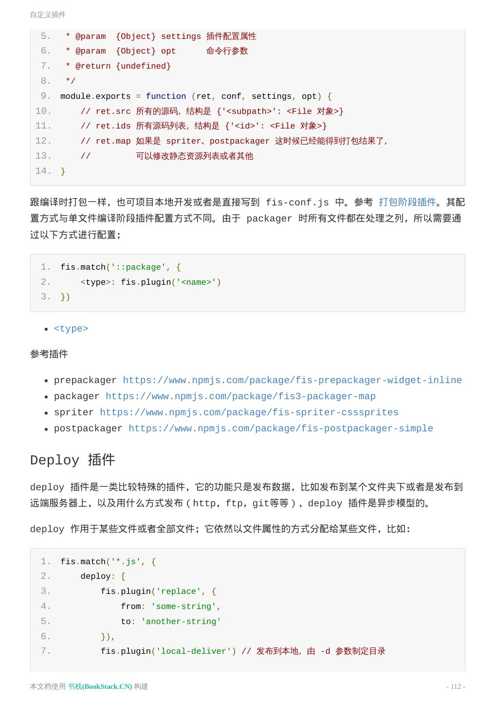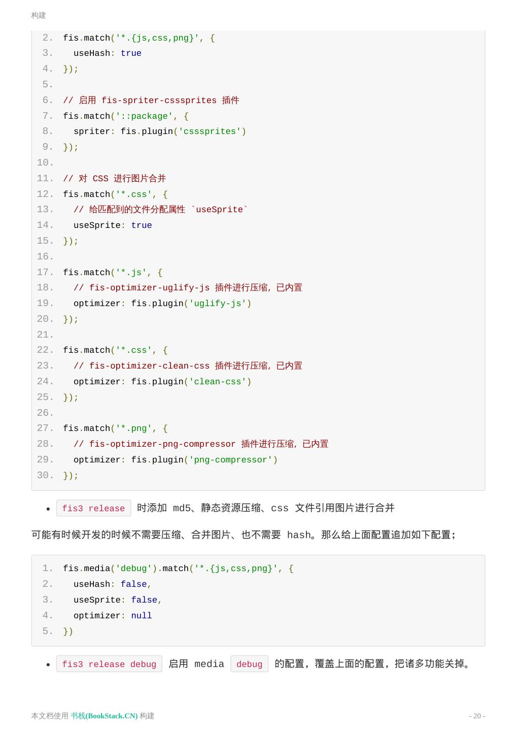 20 .构建 2. fis.match('*.{js,css,png}', { 3. useHash: true 4. }); 5. 6. // 启用 fis-spriter-csssprites 插件 7. fis.match('::package', { 8. spriter: fis.plugin('csssprites') 9. }); 10. 11. // 对 CSS 进行图片合并 12. fis.match('*.css', { 13. // 给匹配到的文件分配属性 `useSprite` 14. useSprite: true 15. }); 16. 17. fis.match('*.js', { 18. // fis-optimizer-uglify-js 插件进行压缩,已内置 19. optimizer: fis.plugin('uglify-js') 20. }); 21. 22. fis.match('*.css', { 23. // fis-optimizer-clean-css 插件进行压缩,已内置 24. optimizer: fis.plugin('clean-css') 25. }); 26. 27. fis.match('*.png', { 28. // fis-optimizer-png-compressor 插件进行压缩,已内置 29. optimizer: fis.plugin('png-compressor') 30. }); fis3 release 时添加 md5、静态资源压缩、css 文件引用图片进行合并 可能有时候开发的时候不需要压缩、合并图片、也不需要 hash。那么给上面配置追加如下配置; 1. fis.media('debug').match('*.{js,css,png}', { 2. useHash: false, 3. useSprite: false, 4. optimizer: null 5. }) fis3 release debug 启用 media debug 的配置,覆盖上面的配置,把诸多功能关掉。 本文档使用 书栈(BookStack.CN) 构建 - 20 -