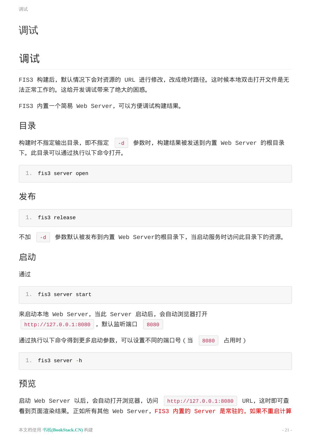 21 .调试 调试 调试 FIS3 构建后,默认情况下会对资源的 URL 进行修改,改成绝对路径。这时候本地双击打开文件是无 法正常工作的。这给开发调试带来了绝大的困惑。 FIS3 内置一个简易 Web Server,可以方便调试构建结果。 目录 构建时不指定输出目录,即不指定 -d 参数时,构建结果被发送到内置 Web Server 的根目录 下。此目录可以通过执行以下命令打开。 1. fis3 server open 发布 1. fis3 release 不加 -d 参数默认被发布到内置 Web Server的根目录下,当启动服务时访问此目录下的资源。 启动 通过 1. fis3 server start 来启动本地 Web Server,当此 Server 启动后,会自动浏览器打开 http://127.0.0.1:8080 ,默认监听端口 8080 通过执行以下命令得到更多启动参数,可以设置不同的端口号(当 8080 占用时) 1. fis3 server -h 预览 启动 Web Server 以后,会自动打开浏览器,访问 http://127.0.0.1:8080 URL,这时即可查 看到页面渲染结果。正如所有其他 Web Server,FIS3 内置的 Server 是常驻的,如果不重启计算 本文档使用 书栈(BookStack.CN) 构建 - 21 -