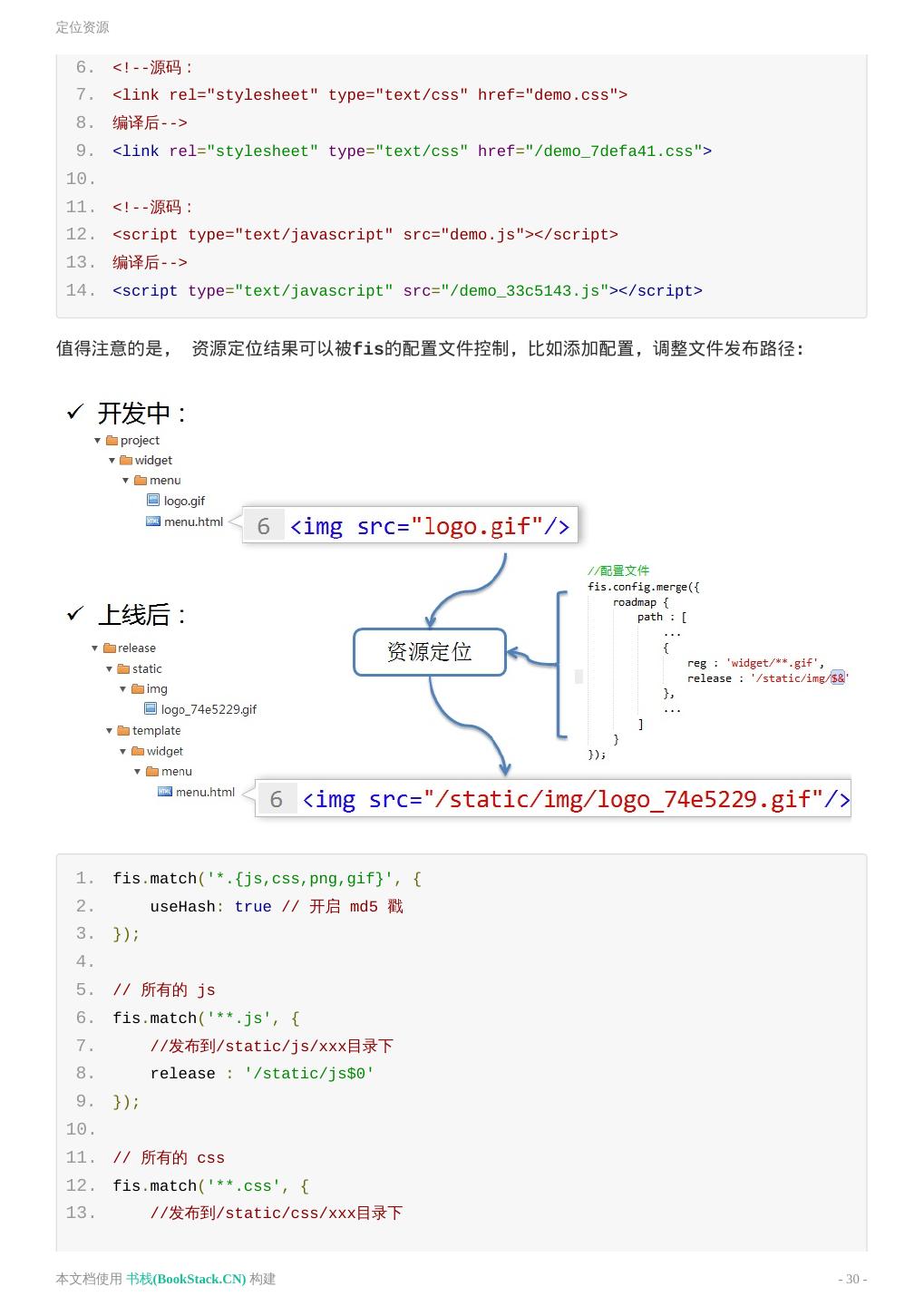 29 .定位资源 定位资源 定位资源 定位资源能力,可以有效地分离开发路径与部署路径之间的关系,工程师不再关心资源部署到线上之后 去了哪里,变成了什么名字,这些都可以通过配置来指定。而工程师只需要使用相对路径来定位自己的 开发资源即可。这样的好处是:资源可以发布到任何静态资源服务器的任何路径上而不用担心线上运行 时找不到它们,而且代码具有很强的可移植性,甚至可以从一个产品线移植到另一个产品线而不用担心 线上部署不一致的问题。 在html中定位资源 FIS3 支持对html中的script、link、style、video、audio、embed等标签的src或href属性 进行分析,一旦这些标签的资源定位属性可以命中已存在文件,则把命中文件的url路径替换到属性 中,同时可保留原来url中的query查询信息。 例如: 1. <!--源码: 2. <img title="百度logo" src="images/logo.gif"/> 3. 编译后--> 4. <img title="百度logo" src="/images/logo_74e5229.gif"/> 5. 本文档使用 书栈(BookStack.CN) 构建 - 29 -