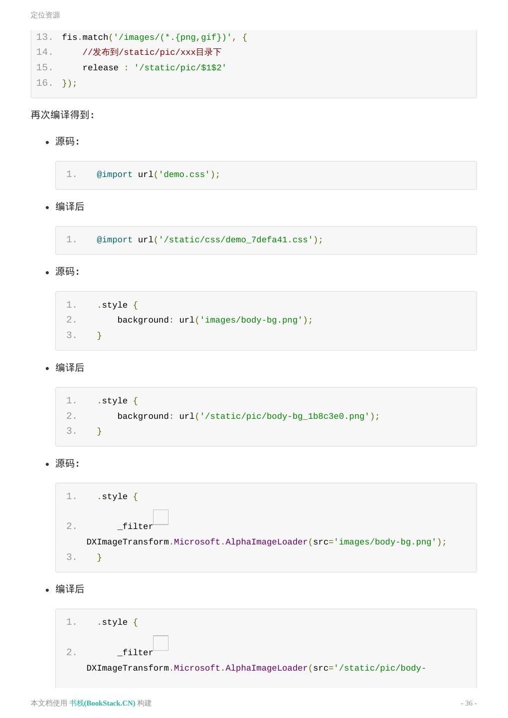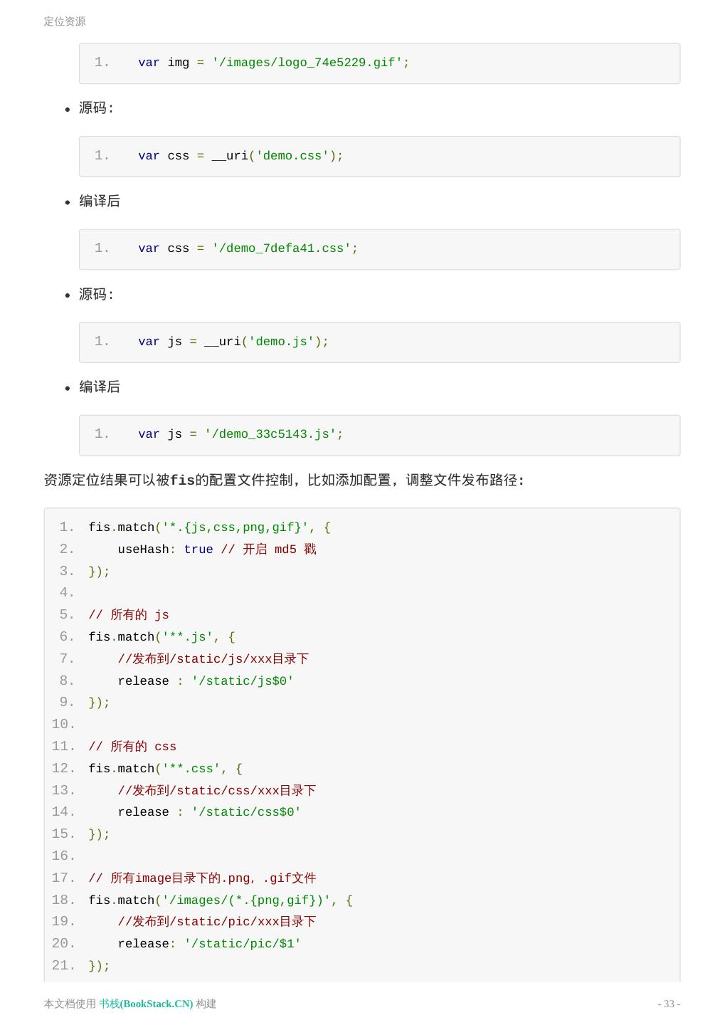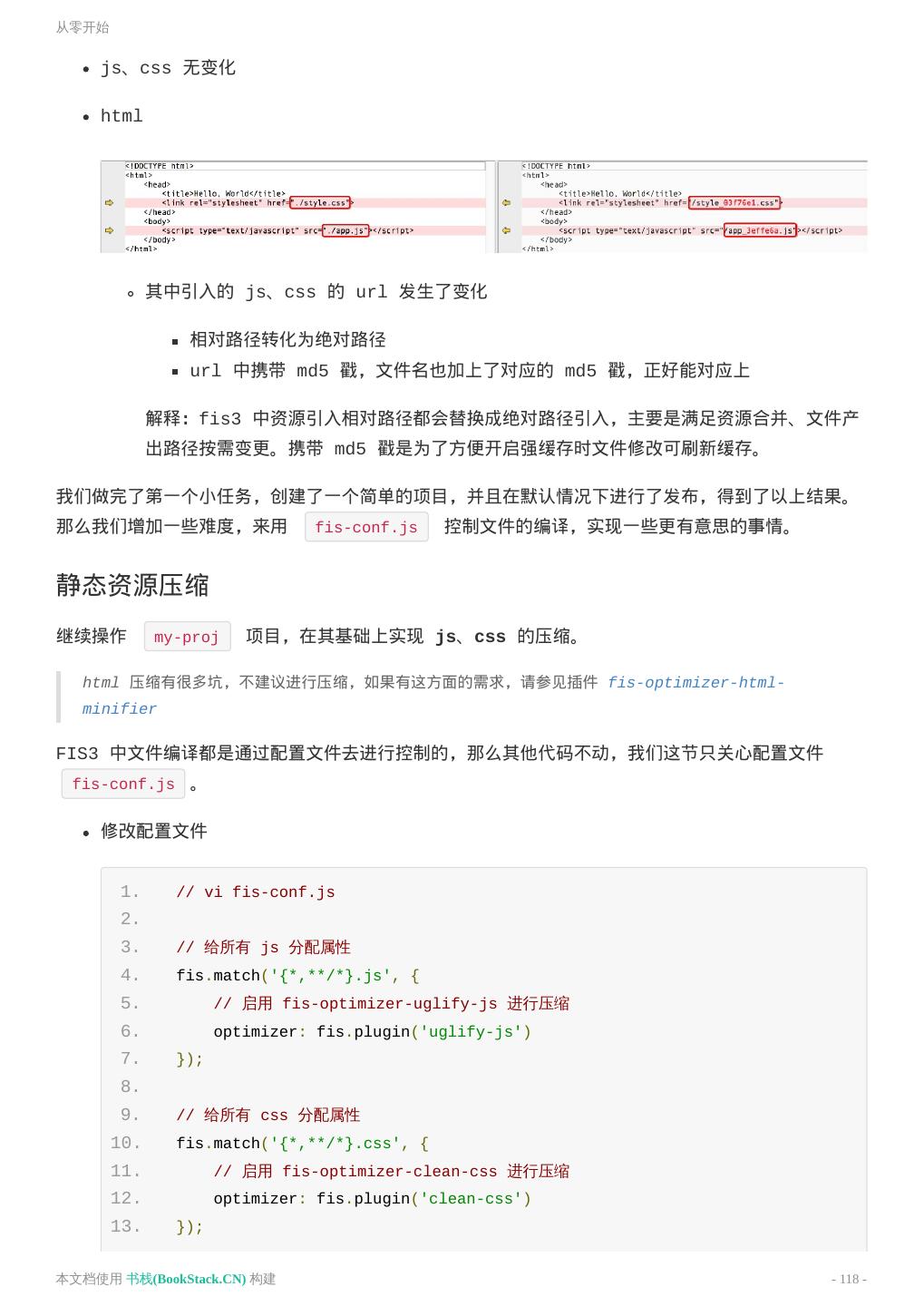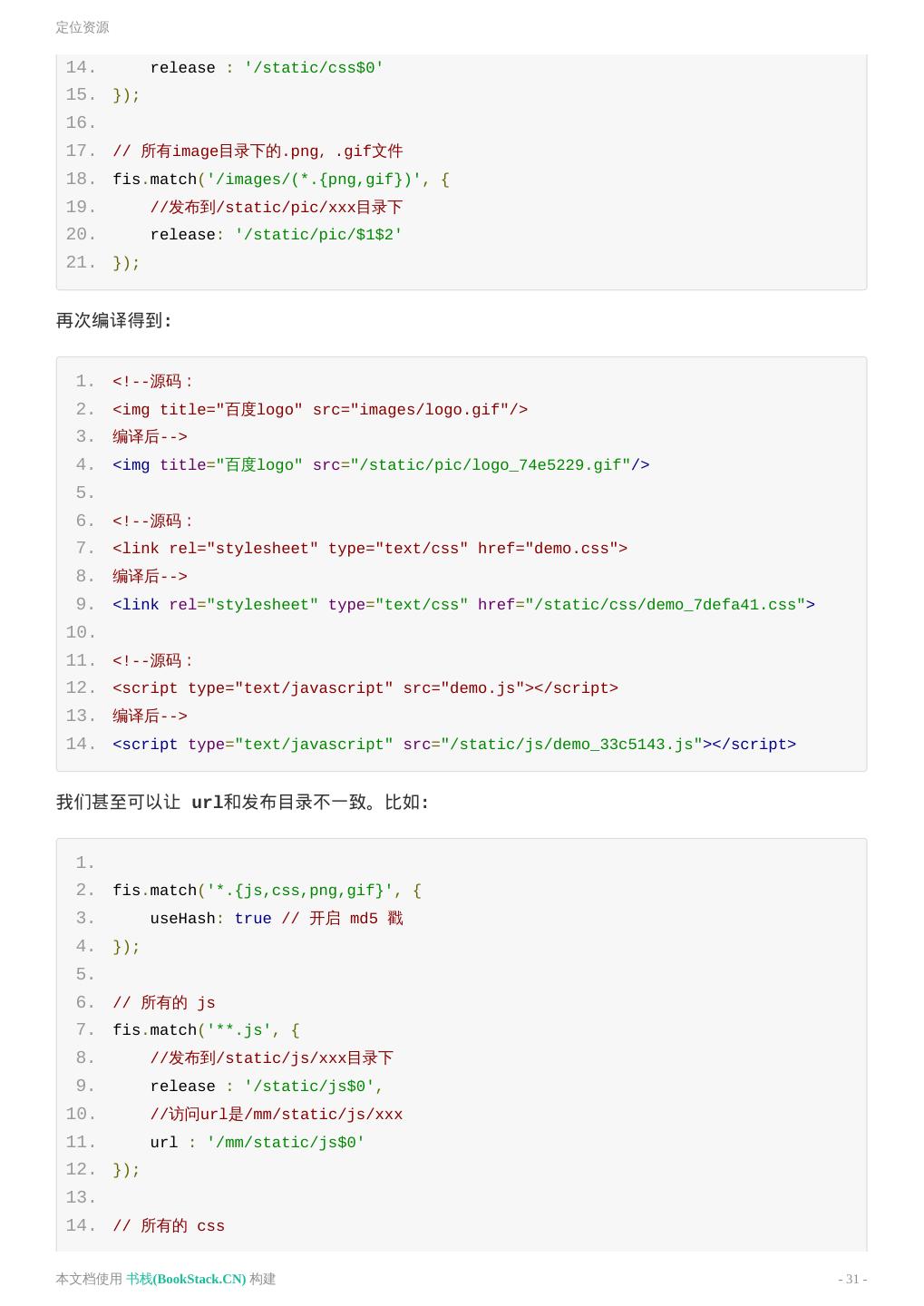 12 .构建 文件变化 index.html 、 style.css 发生了变化 index.html style.css 如上,构建过程中对资源 URI 进行了替换,替换成了绝对 URL。通俗点讲就是相对路径换成了绝对路 径。 这是一个 FIS 的很重要的特性,资源定位。 资源定位能力,可以有效地分离开发路径与部署路径之间的关系,工程师不再关心资源部署到线上之后 去了哪里,变成了什么名字,这些都可以通过配置来指定。而工程师只需要使用相对路径来定位自己的 开发资源即可。这样的好处是 资源可以发布到任何静态资源服务器的任何路径上,而不用担心线上运 行时找不到它们,而且代码 具有很强的可移植性,甚至可以从一个产品线移植到另一个产品线而不用 担心线上部署不一致的问题。 在默认不配置的情况下只是对资源相对路径修改成了绝对路径。通过配置文件可以轻松分离开发路径 (源码路径)与部署路径。比如我们想让所有的静态资源构建后到 static 目录下。 本文档使用 书栈(BookStack.CN) 构建 - 12 -