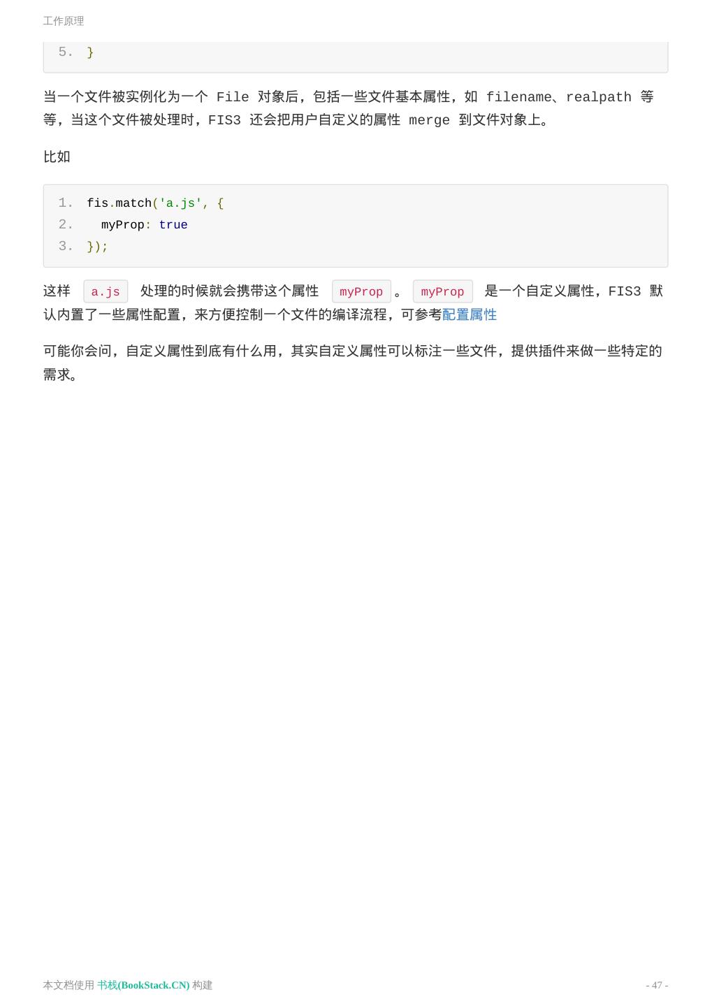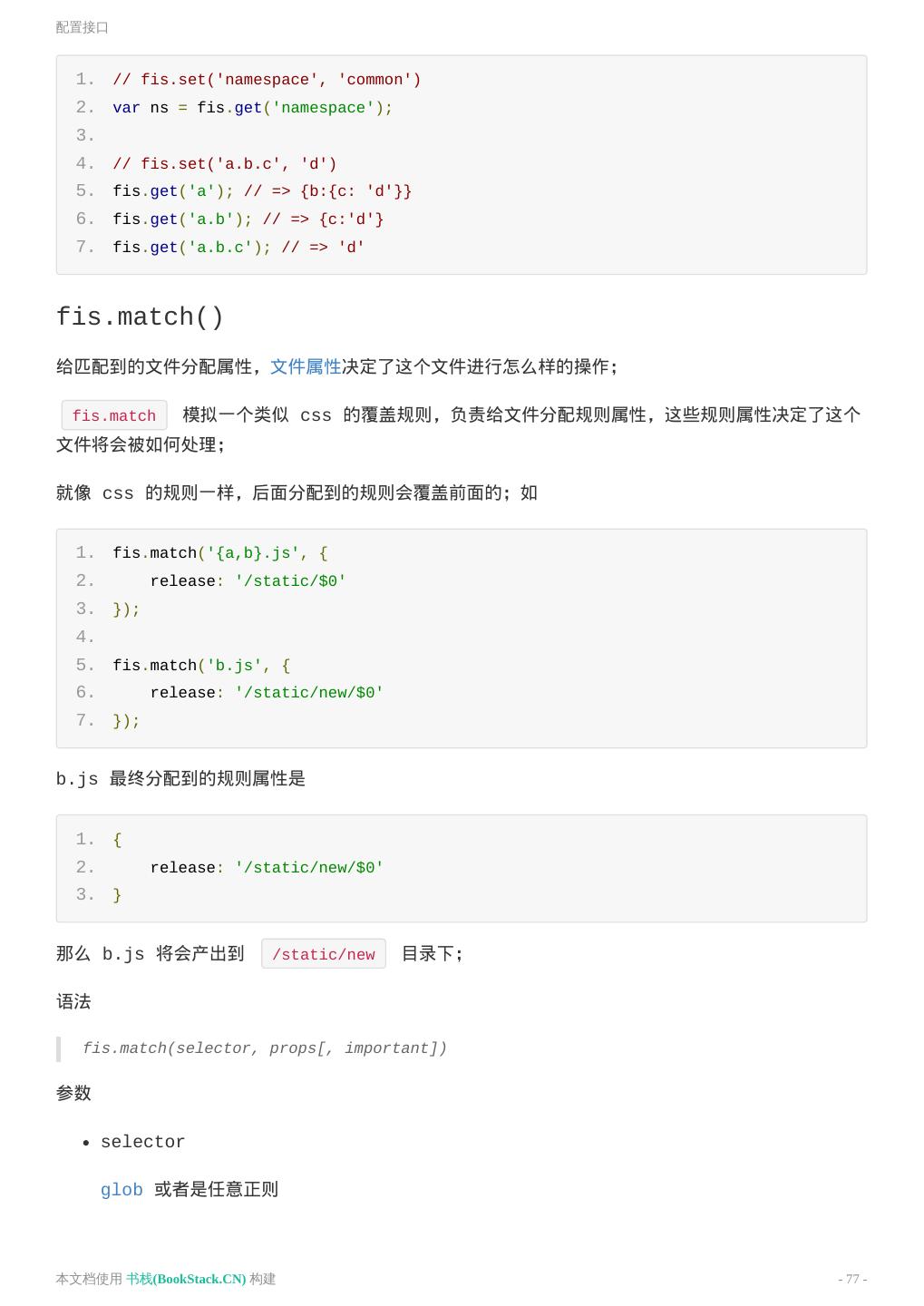 13 .构建 1. // 配置配置文件,注意,清空所有的配置,只留下以下代码即可。 2. fis.match('*.{png,js,css}', { 3. release: '/static/$0' 4. }); 同样构建到 ../output 目录下看变化。 1. fis3 release -d ../output 以上示例只是更改部署路径,还可以给 url 添加 CDN domain 或者添加文件指纹(时间戳或 者md5戳)。 再次强调,FIS3 的构建是不会对源码做修改的,而是构建产出到了另外一个目录,并且构建的结果才 是用来上线使用的。 可能有人会疑惑,修改成了绝对路径,本地如何调试开发?下一节介绍调试的方法。 配置文件 默认配置文件为 fis-conf.js ,FIS3 编译的整个流程都是通过配置来控制的。FIS3 定义了一种 类似 CSS 的配置方式。固化了构建流程,让工程构建变得简单。 fis.match() 首先介绍设置规则的配置接口 1. fis.match(selector, props); selector :FIS3 把匹配文件路径的路径作为selector,匹配到的文件会分配给它设置的 props 。关于 selector 语法,请参看 Glob 说明 props :编译规则属性,包括文件属性和插件属性,更多属性 我们修改例子的配置文件 fis-conf.js ,添加以下内容 本文档使用 书栈(BookStack.CN) 构建 - 13 -