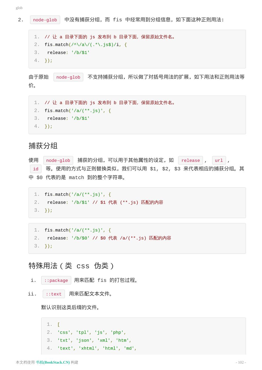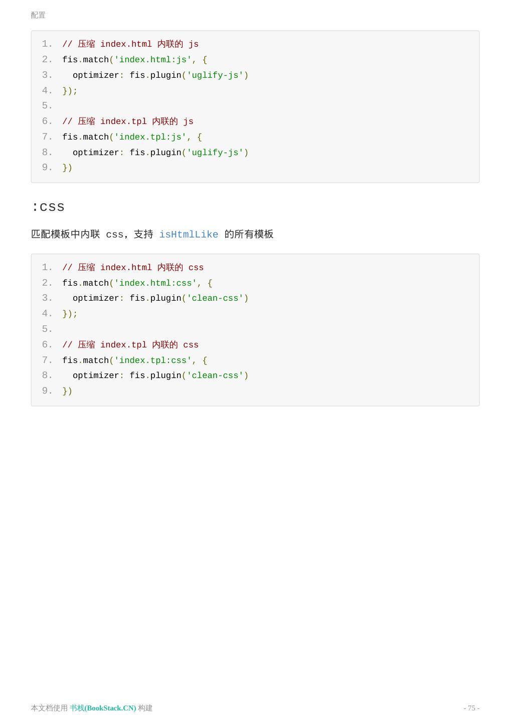 18 .构建 片段编译 有些插件会对文件中的一部分先进行片段编译 fis.compile.partial , 这时可以对相应的片段编译 配置对应的规则。 1. // vue组件中的less片段处理 2. fis.match('src/vue/**.vue:less', { 3. rExt: 'css', 4. parser: fis.plugin('less'), 5. release: 'xxx' // 这个无效 6. }); 7. 8. // 注意:因为组件中的样式片段编译只是编译内容,所以上面的release配置是无效的。要配置其 release,需要针对生成的css文件: 9. fis.match('src/vue/(**.css)', { 10. release: '/vue-style/$1' 11. }); 压缩资源 为了减少资源网络传输的大小,通过压缩器对 js、css、图片进行压缩是一直以来前端工程优化的选 择。在 FIS3 中这个过程非常简单,通过给文件配置压缩器即可。 1. // 清除其他配置,只保留如下配置 2. fis.match('*.js', { 3. // fis-optimizer-uglify-js 插件进行压缩,已内置 4. optimizer: fis.plugin('uglify-js') 5. }); 6. 7. fis.match('*.css', { 8. // fis-optimizer-clean-css 插件进行压缩,已内置 9. optimizer: fis.plugin('clean-css') 10. }); 11. 12. fis.match('*.png', { 13. // fis-optimizer-png-compressor 插件进行压缩,已内置 14. optimizer: fis.plugin('png-compressor') 15. }); 构建到 ../output 目录下看变化。 本文档使用 书栈(BookStack.CN) 构建 - 18 -