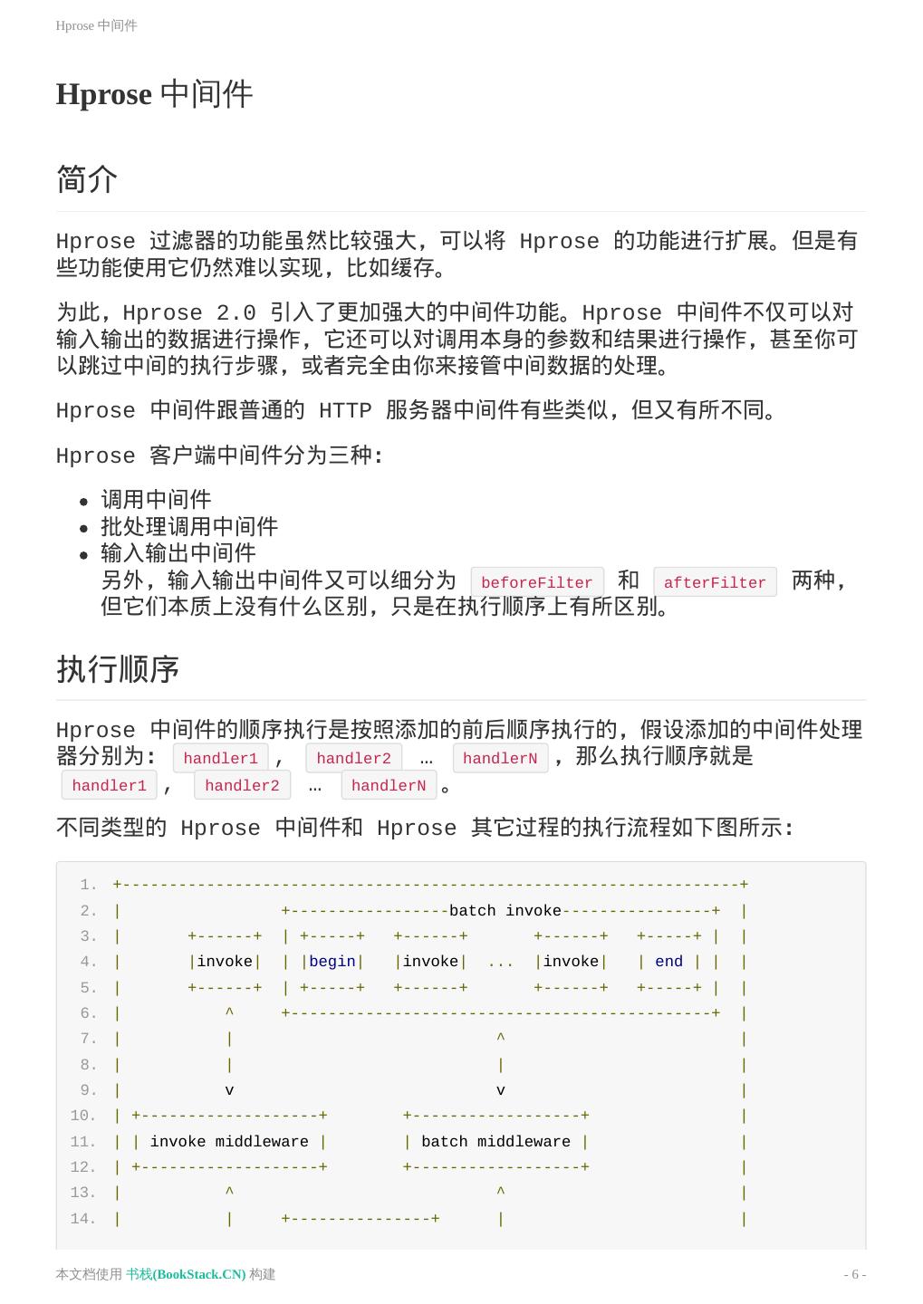6 .Hprose 中间件 Hprose 中间件 简介 Hprose 过滤器的功能虽然比较强大,可以将 Hprose 的功能进行扩展。但是有 些功能使用它仍然难以实现,比如缓存。 为此,Hprose 2.0 引入了更加强大的中间件功能。Hprose 中间件不仅可以对 输入输出的数据进行操作,它还可以对调用本身的参数和结果进行操作,甚至你可 以跳过中间的执行步骤,或者完全由你来接管中间数据的处理。 Hprose 中间件跟普通的 HTTP 服务器中间件有些类似,但又有所不同。 Hprose 客户端中间件分为三种: 调用中间件 批处理调用中间件 输入输出中间件 另外,输入输出中间件又可以细分为 beforeFilter 和 afterFilter 两种, 但它们本质上没有什么区别,只是在执行顺序上有所区别。 执行顺序 Hprose 中间件的顺序执行是按照添加的前后顺序执行的,假设添加的中间件处理 器分别为: handler1 , handler2 … handlerN ,那么执行顺序就是 handler1 , handler2 … handlerN 。 不同类型的 Hprose 中间件和 Hprose 其它过程的执行流程如下图所示: 1. +------------------------------------------------------------------+ 2. | +-----------------batch invoke----------------+ | 3. | +------+ | +-----+ +------+ +------+ +-----+ | | 4. | |invoke| | |begin| |invoke| ... |invoke| | end | | | 5. | +------+ | +-----+ +------+ +------+ +-----+ | | 6. | ^ +---------------------------------------------+ | 7. | | ^ | 8. | | | | 9. | v v | 10. | +-------------------+ +------------------+ | 11. | | invoke middleware | | batch middleware | | 12. | +-------------------+ +------------------+ | 13. | ^ ^ | 14. | | +---------------+ | | 本文档使用 书栈(BookStack.CN) 构建 - 6 -