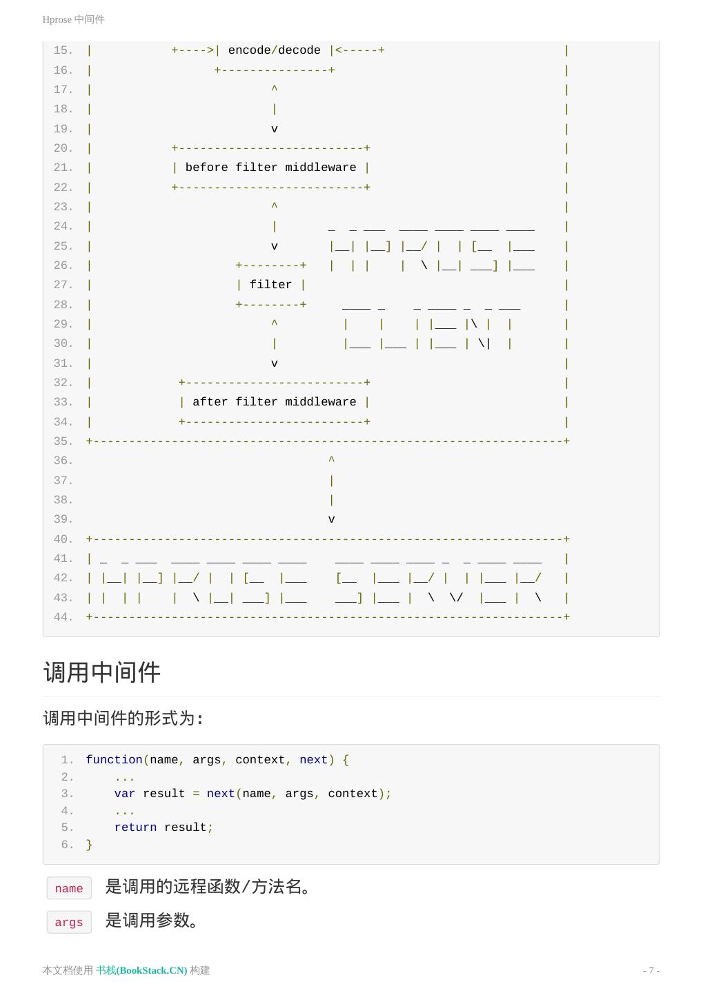 7 .Hprose 中间件 15. | +---->| encode/decode |<-----+ | 16. | +---------------+ | 17. | ^ | 18. | | | 19. | v | 20. | +--------------------------+ | 21. | | before filter middleware | | 22. | +--------------------------+ | 23. | ^ | 24. | | _ _ ___ ____ ____ ____ ____ | 25. | v |__| |__] |__/ | | [__ |___ | 26. | +--------+ | | | | \ |__| ___] |___ | 27. | | filter | | 28. | +--------+ ____ _ _ ____ _ _ ___ | 29. | ^ | | | |___ |\ | | | 30. | | |___ |___ | |___ | \| | | 31. | v | 32. | +-------------------------+ | 33. | | after filter middleware | | 34. | +-------------------------+ | 35. +------------------------------------------------------------------+ 36. ^ 37. | 38. | 39. v 40. +------------------------------------------------------------------+ 41. | _ _ ___ ____ ____ ____ ____ ____ ____ ____ _ _ ____ ____ | 42. | |__| |__] |__/ | | [__ |___ [__ |___ |__/ | | |___ |__/ | 43. | | | | | \ |__| ___] |___ ___] |___ | \ \/ |___ | \ | 44. +------------------------------------------------------------------+ 调用中间件 调用中间件的形式为: 1. function(name, args, context, next) { 2. ... 3. var result = next(name, args, context); 4. ... 5. return result; 6. } name 是调用的远程函数/方法名。 args 是调用参数。 本文档使用 书栈(BookStack.CN) 构建 - 7 -
