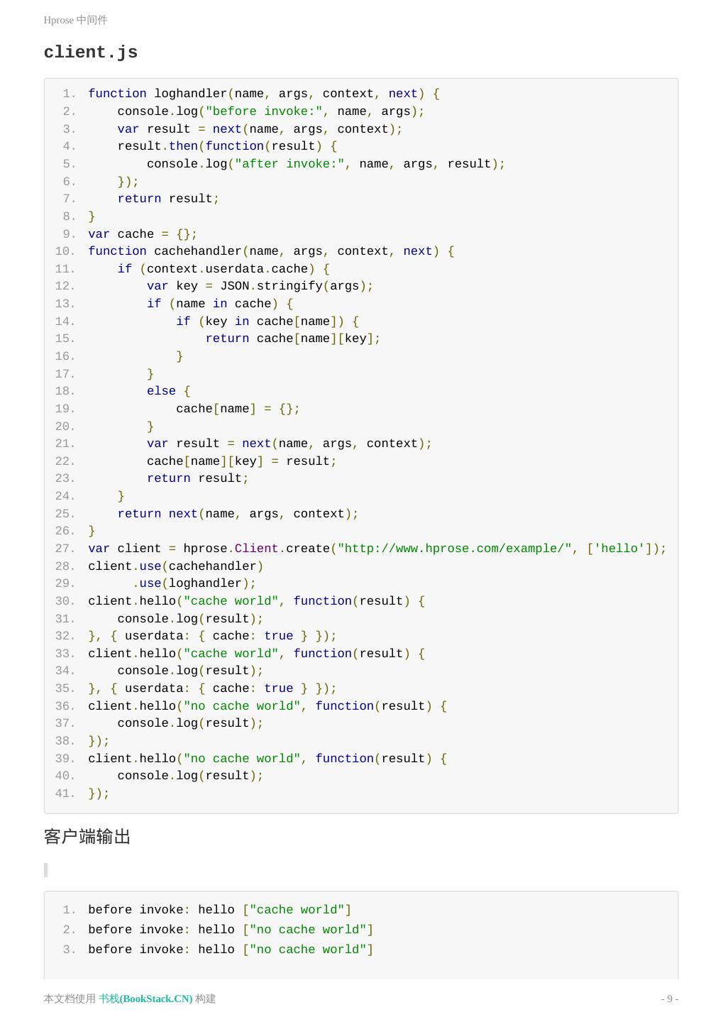 8 .Hprose 中间件 context 是调用上下文对象。 next 表示下一个中间件。通过调用 next 将各个中间件串联起来。 在调用 next 之前的操作在调用发生前执行,在调用 next 之后的操作在调 用发生后执行,如果你不想修改返回结果,你应该将 next 的返回值作为该中间 件的返回值返回。 跟踪调试 我们来看一个例子: client.js 1. function loghandler(name, args, context, next) { 2. console.log("before invoke:", name, args); 3. var result = next(name, args, context); 4. result.then(function(result) { 5. console.log("after invoke:", name, args, result); 6. }); 7. return result; 8. } 9. var client = hprose.Client.create("http://www.hprose.com/example/", ['hello']); 10. client.use(loghandler); 11. client.hello("world", function(result) { 12. console.log(result); 13. }); 客户端输出 1. before invoke: hello ["world"] 2. after invoke: hello ["world"] Hello world 3. Hello world 通过上面的输出,我们会发现结果 result 是个 promise 对象。但参数值 args 在 loghandler 里并不包含 Promise 的值,原因是 Hprose 内部已 经对参数值处理过了。这样对于中间件编写就方便了很多,只需要处理异步结果就 可以了。 缓存调用 我们再来看一个实现缓存调用的例子,在这个例子中我们也使用了上面的日志中间 件,用来观察我们的缓存是否真的有效。 本文档使用 书栈(BookStack.CN) 构建 - 8 -