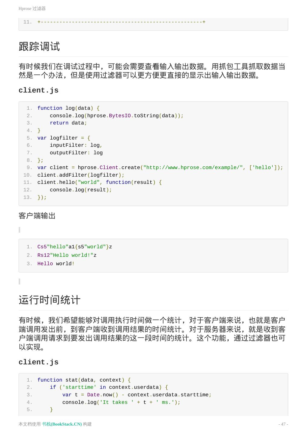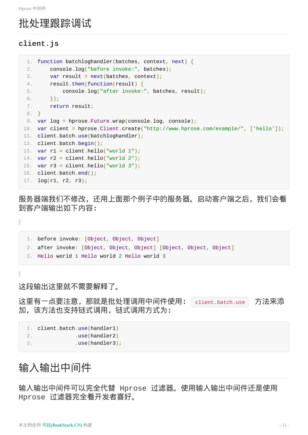 11 .Hprose 中间件 批处理跟踪调试 client.js 1. function batchloghandler(batches, context, next) { 2. console.log("before invoke:", batches); 3. var result = next(batches, context); 4. result.then(function(result) { 5. console.log("after invoke:", batches, result); 6. }); 7. return result; 8. } 9. var log = hprose.Future.wrap(console.log, console); 10. var client = hprose.Client.create("http://www.hprose.com/example/", ['hello']); 11. client.batch.use(batchloghandler); 12. client.batch.begin(); 13. var r1 = client.hello("world 1"); 14. var r2 = client.hello("world 2"); 15. var r3 = client.hello("world 3"); 16. client.batch.end(); 17. log(r1, r2, r3); 服务器端我们不修改,还用上面那个例子中的服务器。启动客户端之后,我们会看 到客户端输出如下内容: 1. before invoke: [Object, Object, Object] 2. after invoke: [Object, Object, Object] [Object, Object, Object] 3. Hello world 1 Hello world 2 Hello world 3 这段输出这里就不需要解释了。 这里有一点要注意,那就是批处理调用中间件使用: client.batch.use 方法来添 加,该方法也支持链式调用,链式调用方式为: 1. client.batch.use(handler1) 2. .use(handler2) 3. .use(handler3); 输入输出中间件 输入输出中间件可以完全代替 Hprose 过滤器。使用输入输出中间件还是使用 Hprose 过滤器完全看开发者喜好。 本文档使用 书栈(BookStack.CN) 构建 - 11 -