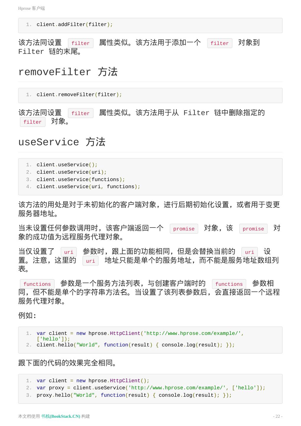 22 .Hprose 客户端 1. client.addFilter(filter); 该方法同设置 filter 属性类似。该方法用于添加一个 filter 对象到 Filter 链的末尾。 removeFilter 方法 1. client.removeFilter(filter); 该方法同设置 filter 属性类似。该方法用于从 Filter 链中删除指定的 filter 对象。 useService 方法 1. client.useService(); 2. client.useService(uri); 3. client.useService(functions); 4. client.useService(uri, functions); 该方法的用处是对于未初始化的客户端对象,进行后期初始化设置,或者用于变更 服务器地址。 当未设置任何参数调用时,该客户端返回一个 promise 对象,该 promise 对 象的成功值为远程服务代理对象。 当仅设置了 uri 参数时,跟上面的功能相同,但是会替换当前的 uri 设 置。注意,这里的 uri 地址只能是单个的服务地址,而不能是服务地址数组列 表。 参数是一个服务方法列表,与创建客户端时的 functions 参数相 functions 同,但不能是单个的字符串方法名。当设置了该列表参数后,会直接返回一个远程 服务代理对象。 例如: 1. var client = new hprose.HttpClient('http://www.hprose.com/example/', ['hello']); 2. client.hello("World", function(result) { console.log(result); }); 跟下面的代码的效果完全相同。 1. var client = new hprose.HttpClient(); 2. var proxy = client.useService('http://www.hprose.com/example/', ['hello']); 3. proxy.hello("World", function(result) { console.log(result); }); 本文档使用 书栈(BookStack.CN) 构建 - 22 -