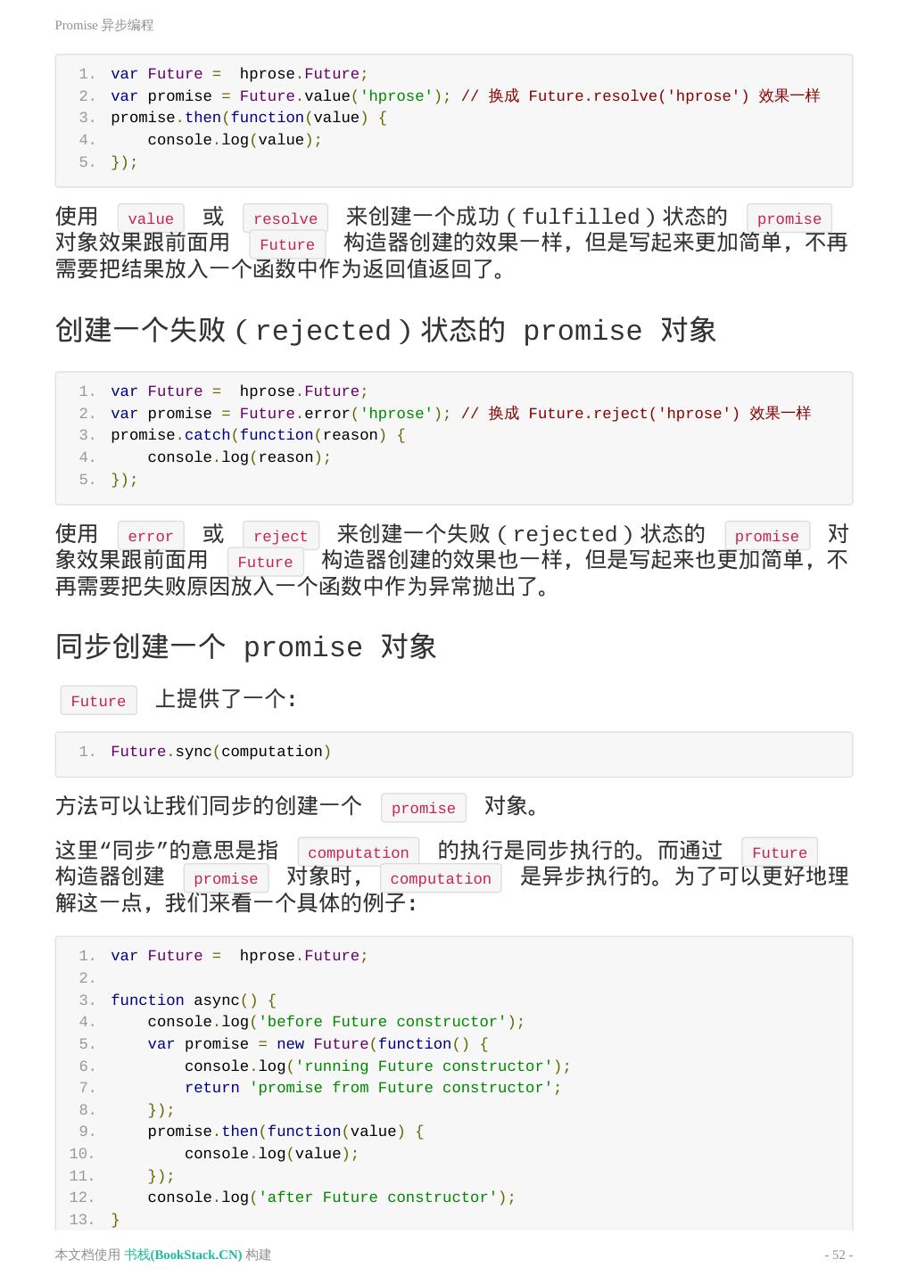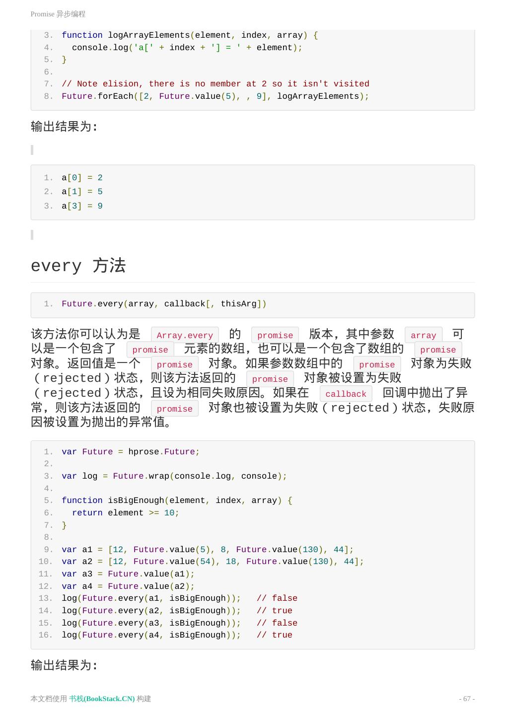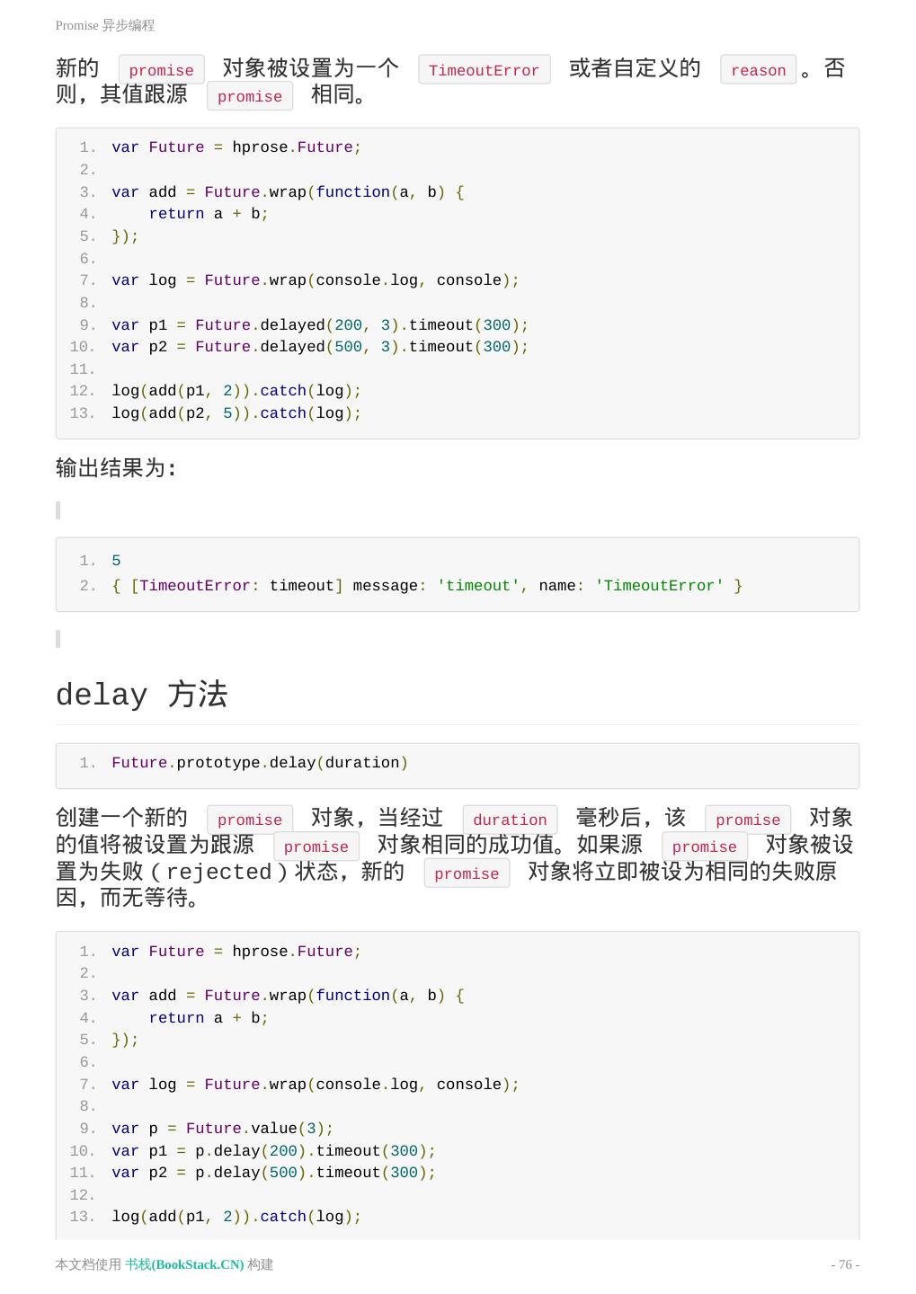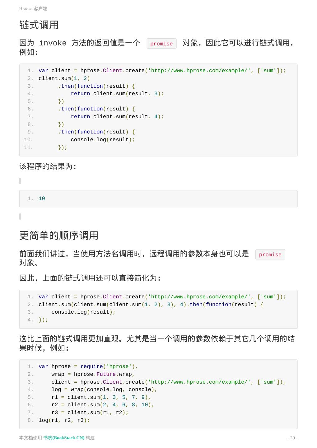 29 .Hprose 客户端 链式调用 因为 invoke 方法的返回值是一个 promise 对象,因此它可以进行链式调用, 例如: 1. var client = hprose.Client.create('http://www.hprose.com/example/', ['sum']); 2. client.sum(1, 2) 3. .then(function(result) { 4. return client.sum(result, 3); 5. }) 6. .then(function(result) { 7. return client.sum(result, 4); 8. }) 9. .then(function(result) { 10. console.log(result); 11. }); 该程序的结果为: 1. 10 更简单的顺序调用 前面我们讲过,当使用方法名调用时,远程调用的参数本身也可以是 promise 对象。 因此,上面的链式调用还可以直接简化为: 1. var client = hprose.Client.create('http://www.hprose.com/example/', ['sum']); 2. client.sum(client.sum(client.sum(1, 2), 3), 4).then(function(result) { 3. console.log(result); 4. }); 这比上面的链式调用更加直观。尤其是当一个调用的参数依赖于其它几个调用的结 果时候,例如: 1. var hprose = require('hprose'), 2. wrap = hprose.Future.wrap, 3. client = hprose.Client.create('http://www.hprose.com/example/', ['sum']), 4. log = wrap(console.log, console), 5. r1 = client.sum(1, 3, 5, 7, 9), 6. r2 = client.sum(2, 4, 6, 8, 10), 7. r3 = client.sum(r1, r2); 8. log(r1, r2, r3); 本文档使用 书栈(BookStack.CN) 构建 - 29 -