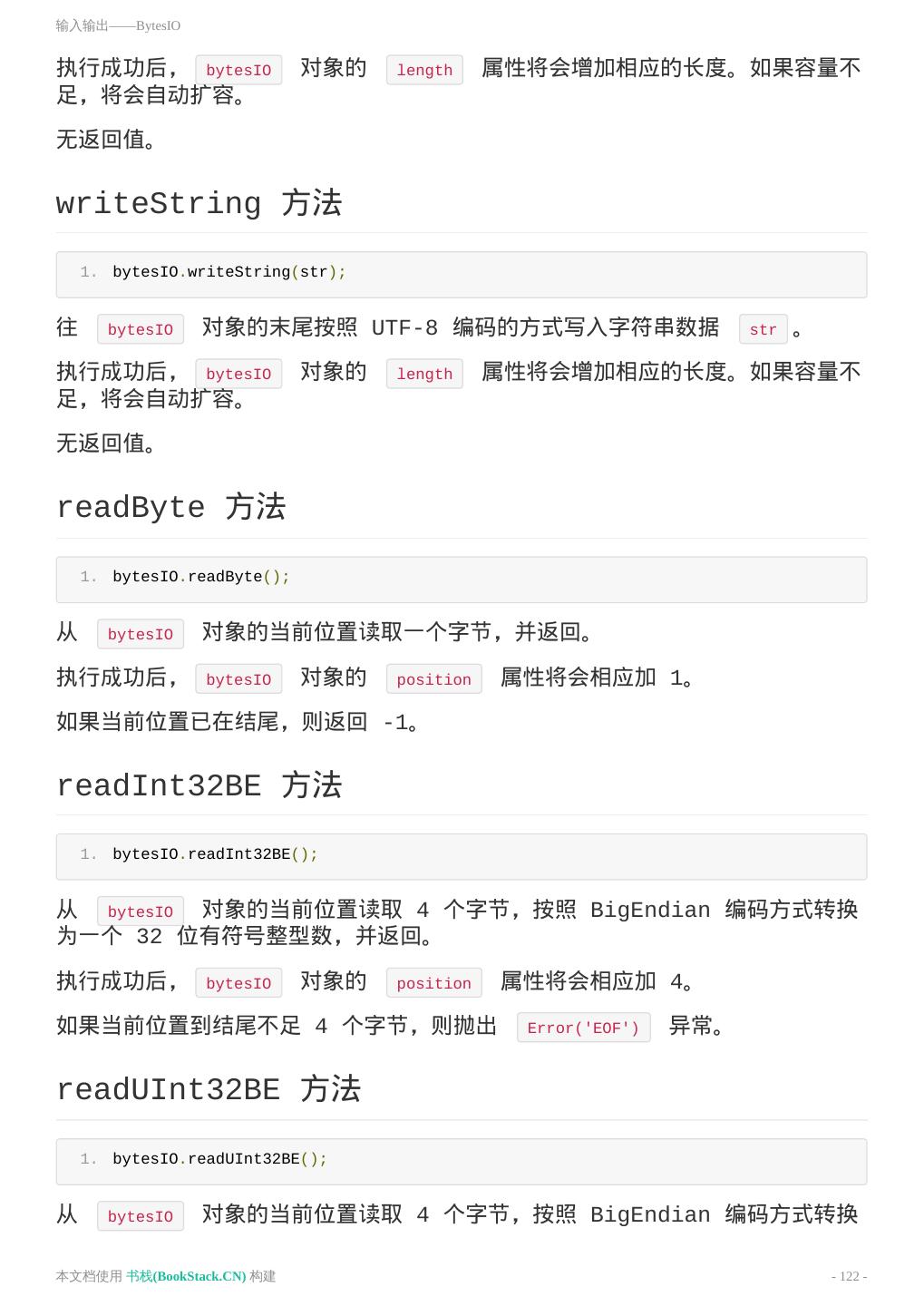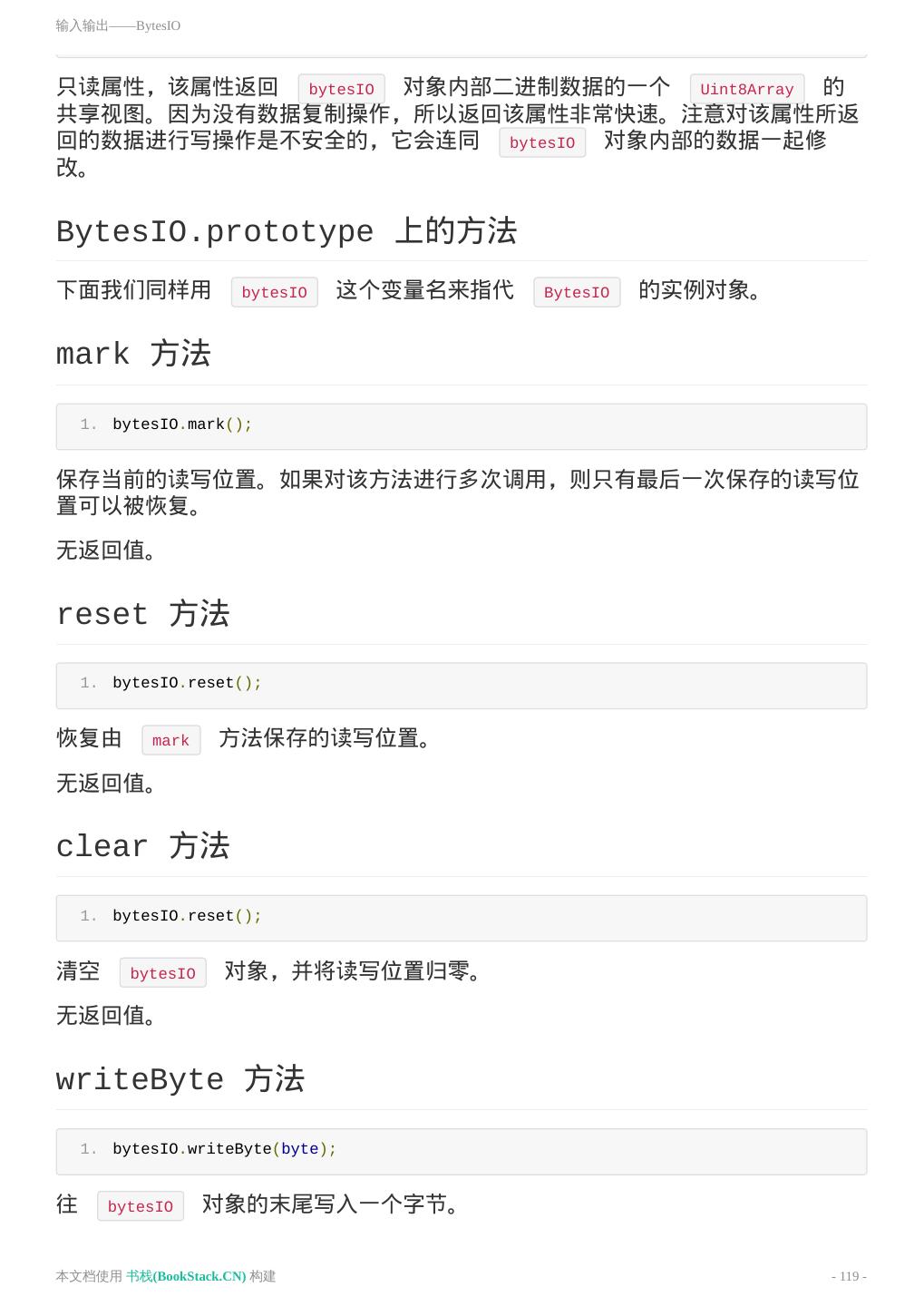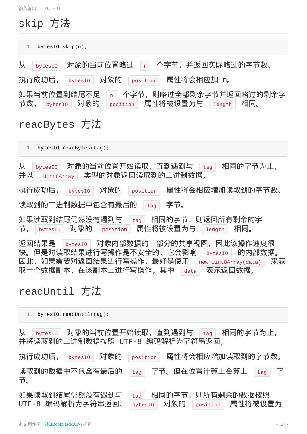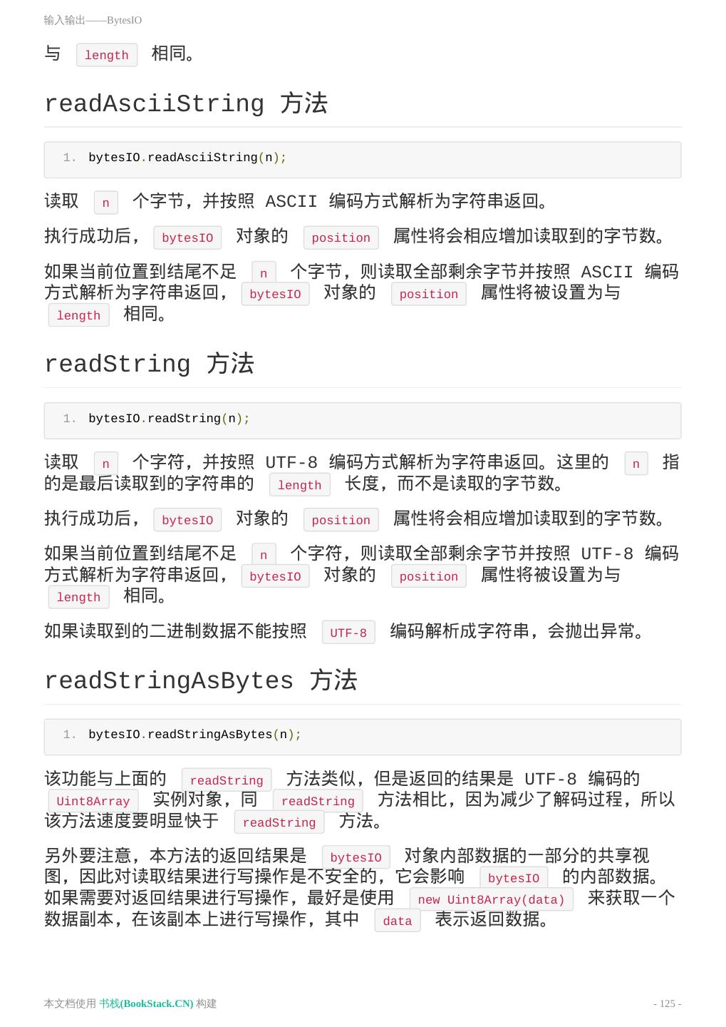 25 .Hprose 客户端 hprose.RawWithEndTag 表示返回带有结束标记的原始数据。 这样说明也许有些晦涩,让我们来看一个例子就清楚了: 1. var BytesIO = hprose.BytesIO; 2. var client = hprose.Client.create('http://www.hprose.com/example/', ['hello']); 3. function onsuccess(result) { 4. console.log(result.constructor, BytesIO.toString(result)); 5. } 6. client.hello("World", onsuccess, { mode: hprose.Normal, sync: true }); 7. client.hello("World", onsuccess, { mode: hprose.Serialized, sync: true }); 8. client.hello("World", onsuccess, { mode: hprose.Raw, sync: true }); 9. client.hello("World", onsuccess, { mode: hprose.RawWithEndTag, sync: true }); 为了保证执行顺序,这里还加了一个 sync 设置,对于该设置在后面再做详细解 释。 该程序执行结果如下: 1. [Function: String] 'Hello World' 2. [Function: Uint8Array] 's11"Hello World"' 3. [Function: Uint8Array] 'Rs11"Hello World"' 4. [Function: Uint8Array] 'Rs11"Hello World"z' 由于历史原因,为了兼容旧版本的 hprose 的写法,该设置也可以不写在 settings 对象中,例如上面程序还可以这样写: 1. var BytesIO = hprose.BytesIO; 2. var client = hprose.Client.create('http://www.hprose.com/example/', ['hello']); 3. function onsuccess(result) { 4. console.log(result.constructor, BytesIO.toString(result)); 5. } 6. client.hello("World", onsuccess, hprose.Normal, { sync: true }); 7. client.hello("World", onsuccess, hprose.Serialized, { sync: true }); 8. client.hello("World", onsuccess, hprose.Raw, { sync: true }); 9. client.hello("World", onsuccess, hprose.RawWithEndTag, { sync: true }); 但在新版本中,不再推荐这种写法。 byref 该设置表示调用是否为引用参数传递方式。例如: 1. var client = hprose.Client.create('http://www.hprose.com/example/', 2. ['swapKeyAndValue']); 本文档使用 书栈(BookStack.CN) 构建 - 25 -