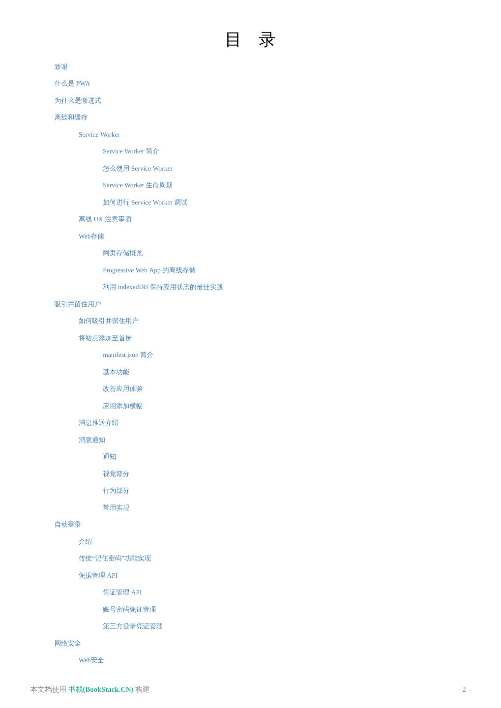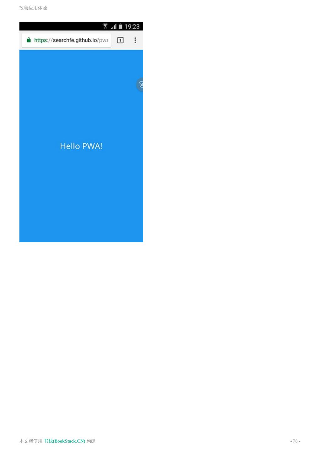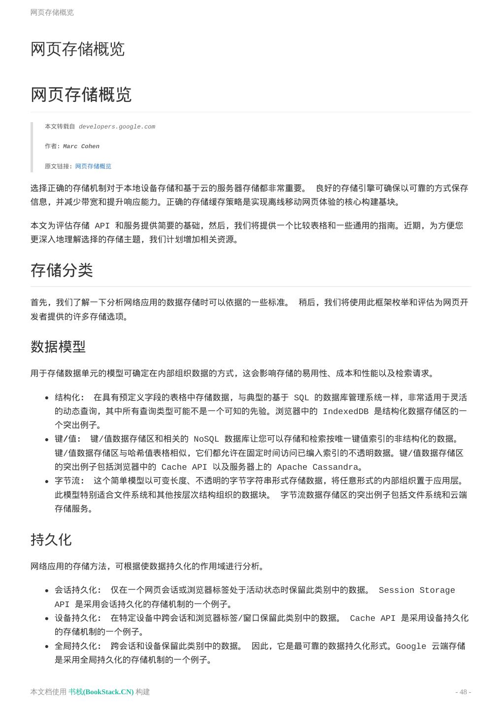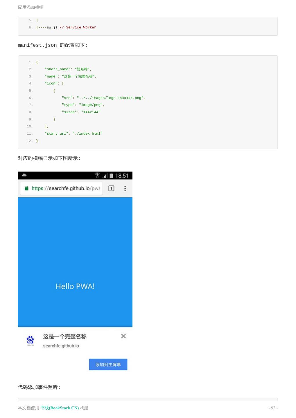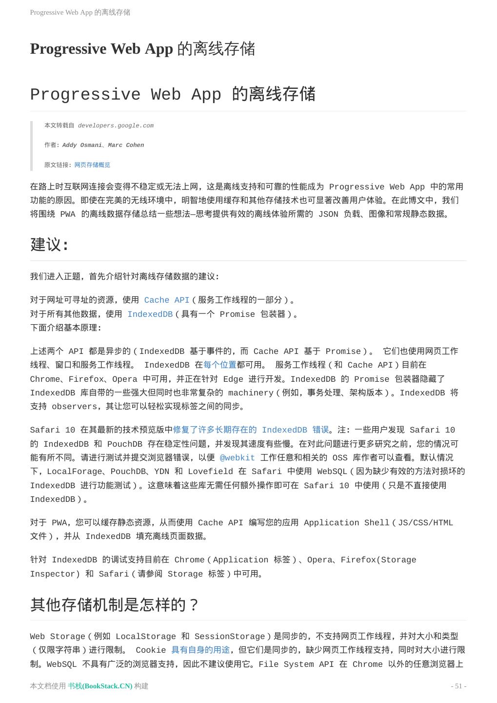 2 . 目 录 致谢 什么是 PWA 为什么是渐进式 离线和缓存 Service Worker Service Worker 简介 怎么使用 Service Worker Service Worker 生命周期 如何进行 Service Worker 调试 离线 UX 注意事项 Web存储 网页存储概览 Progressive Web App 的离线存储 利用 indexedDB 保持应用状态的最佳实践 吸引并留住用户 如何吸引并留住用户 将站点添加至首屏 manifest.json 简介 基本功能 改善应用体验 应用添加横幅 消息推送介绍 消息通知 通知 视觉部分 行为部分 常用实现 自动登录 介绍 传统“记住密码”功能实现 凭据管理 API 凭证管理 API 账号密码凭证管理 第三方登录凭证管理 网络安全 Web安全 本文档使用 书栈(BookStack.CN) 构建 - 2 -