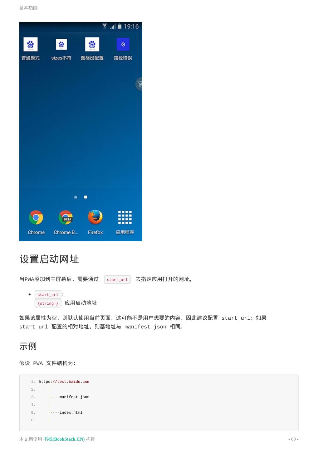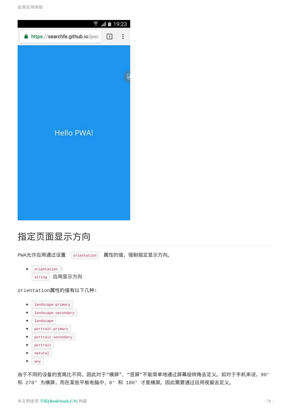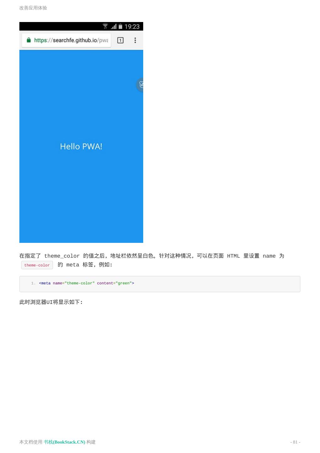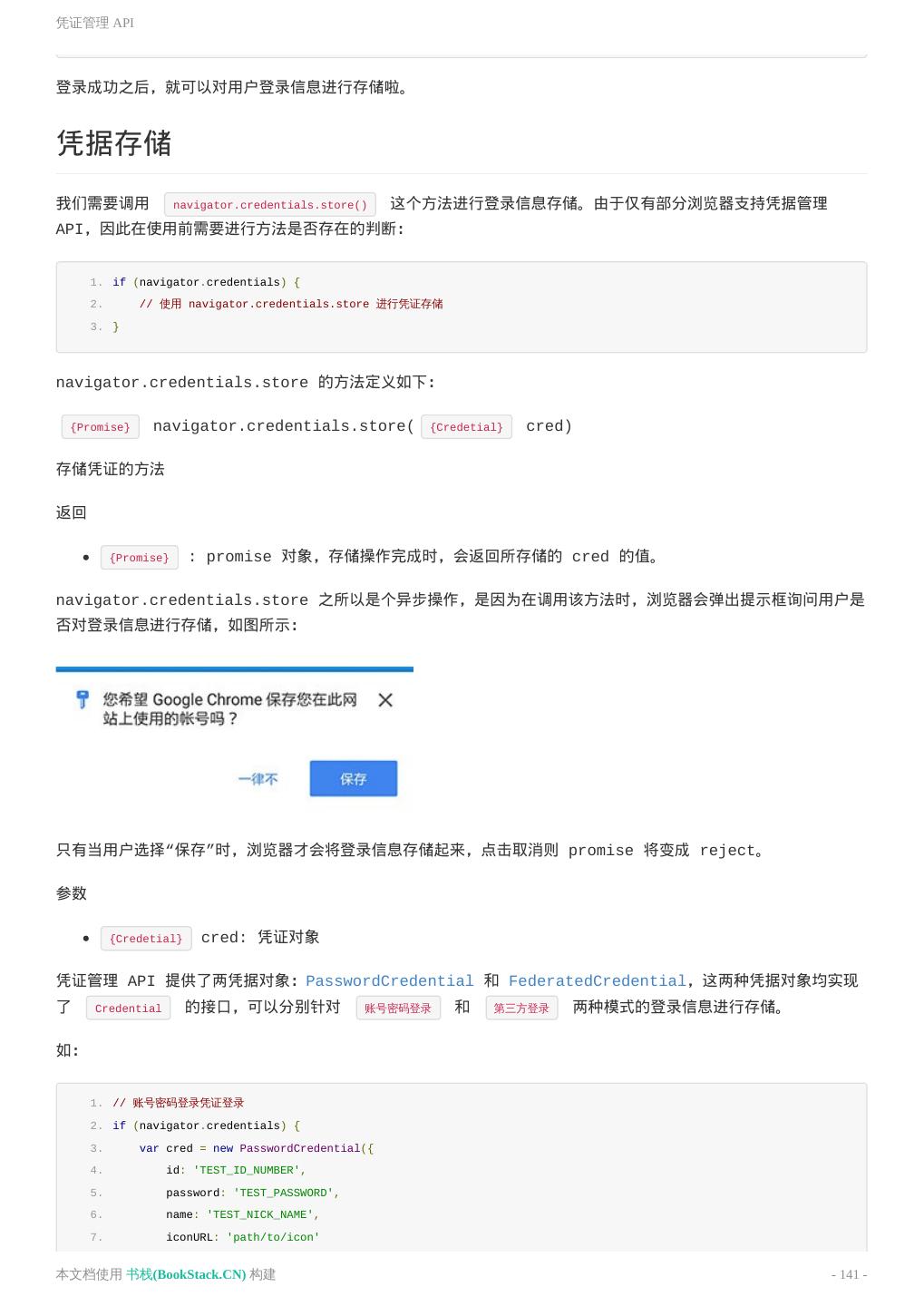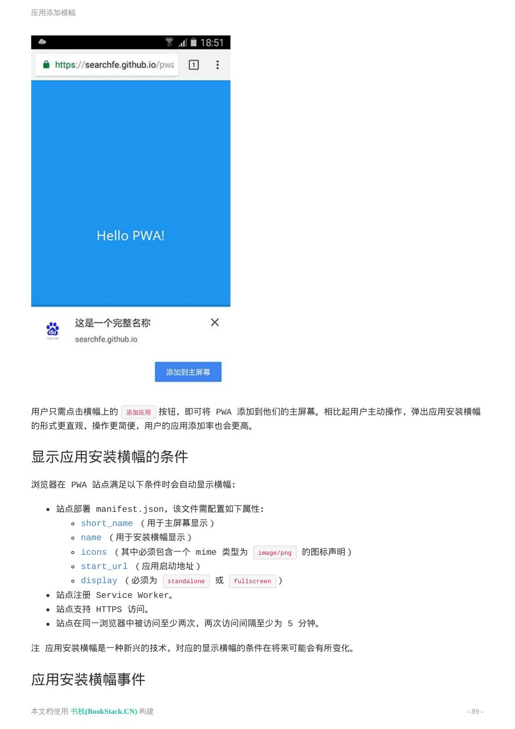 2 . 目 录 致谢 什么是 PWA 为什么是渐进式 离线和缓存 Service Worker Service Worker 简介 怎么使用 Service Worker Service Worker 生命周期 如何进行 Service Worker 调试 离线 UX 注意事项 Web存储 网页存储概览 Progressive Web App 的离线存储 利用 indexedDB 保持应用状态的最佳实践 吸引并留住用户 如何吸引并留住用户 将站点添加至首屏 manifest.json 简介 基本功能 改善应用体验 应用添加横幅 消息推送介绍 消息通知 通知 视觉部分 行为部分 常用实现 自动登录 介绍 传统“记住密码”功能实现 凭据管理 API 凭证管理 API 账号密码凭证管理 第三方登录凭证管理 网络安全 Web安全 本文档使用 书栈(BookStack.CN) 构建 - 2 -