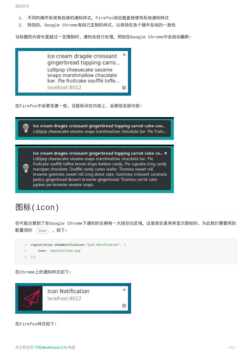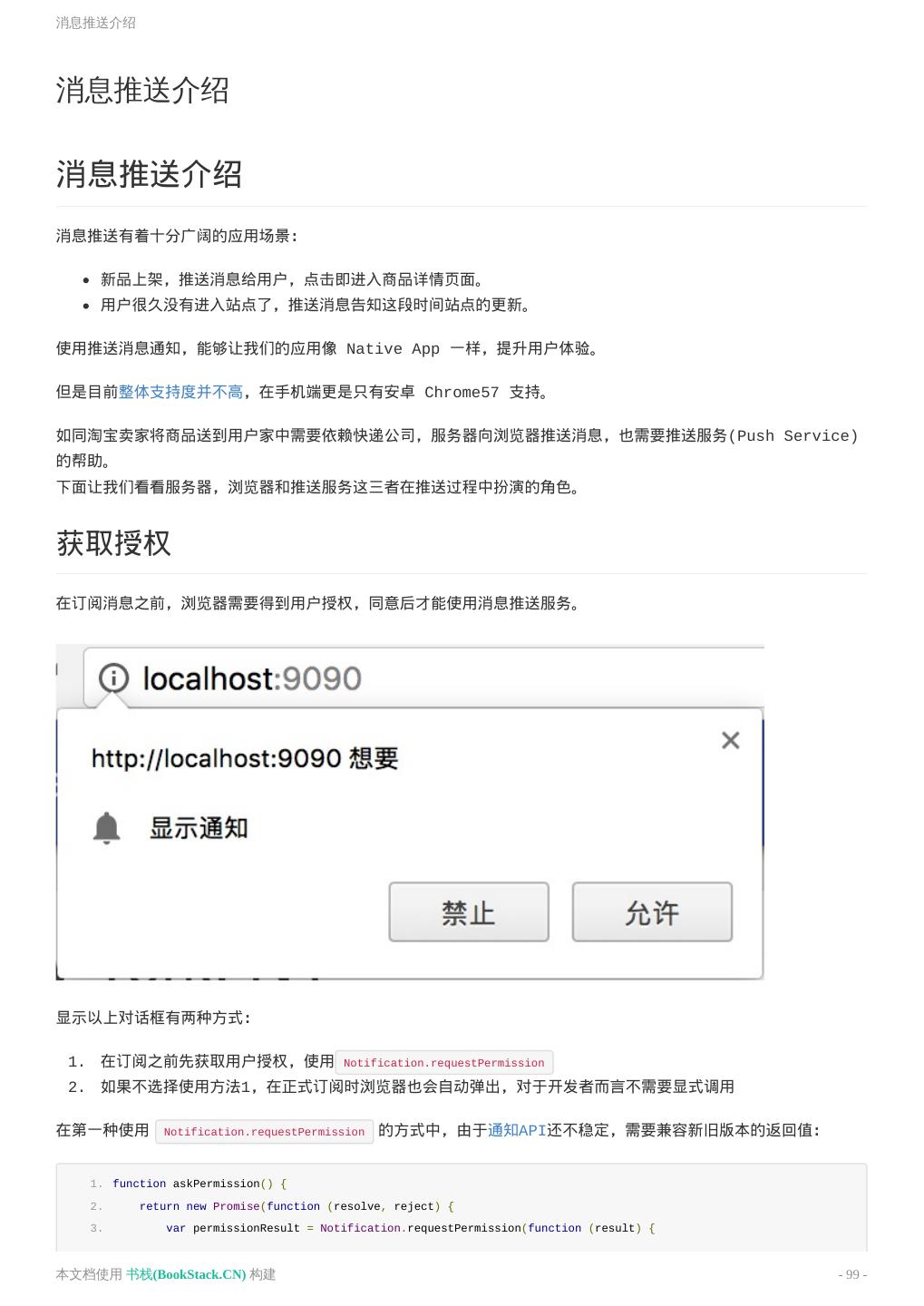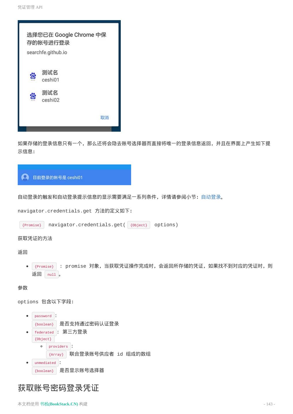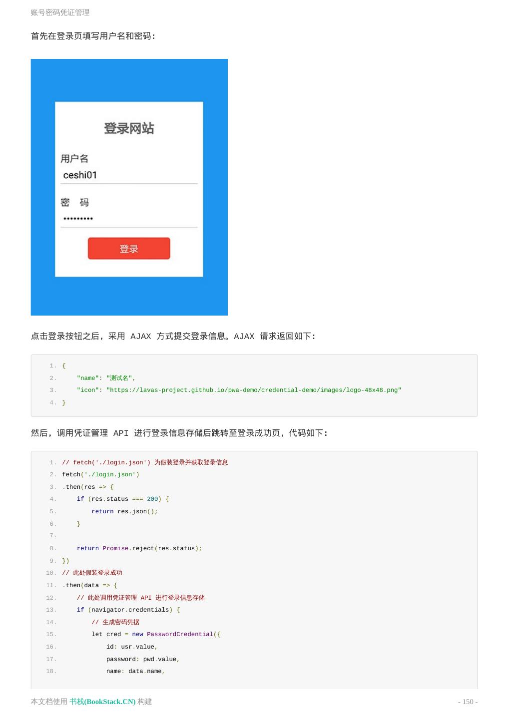 2 . 目 录 致谢 什么是 PWA 为什么是渐进式 离线和缓存 Service Worker Service Worker 简介 怎么使用 Service Worker Service Worker 生命周期 如何进行 Service Worker 调试 离线 UX 注意事项 Web存储 网页存储概览 Progressive Web App 的离线存储 利用 indexedDB 保持应用状态的最佳实践 吸引并留住用户 如何吸引并留住用户 将站点添加至首屏 manifest.json 简介 基本功能 改善应用体验 应用添加横幅 消息推送介绍 消息通知 通知 视觉部分 行为部分 常用实现 自动登录 介绍 传统“记住密码”功能实现 凭据管理 API 凭证管理 API 账号密码凭证管理 第三方登录凭证管理 网络安全 Web安全 本文档使用 书栈(BookStack.CN) 构建 - 2 -