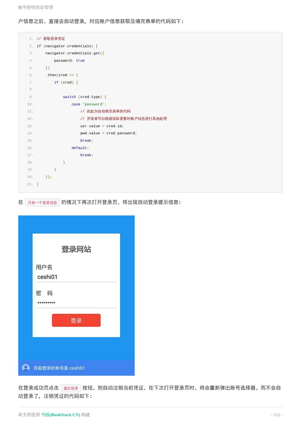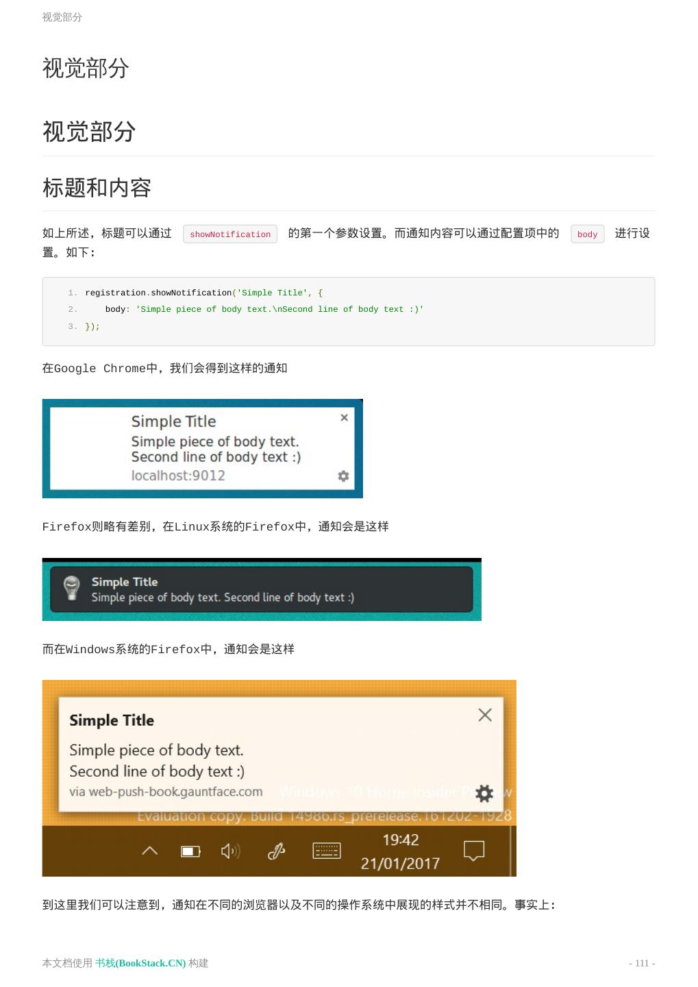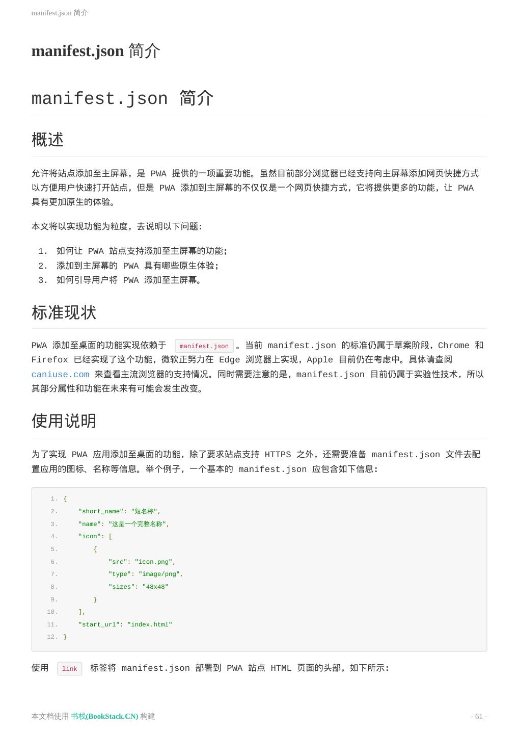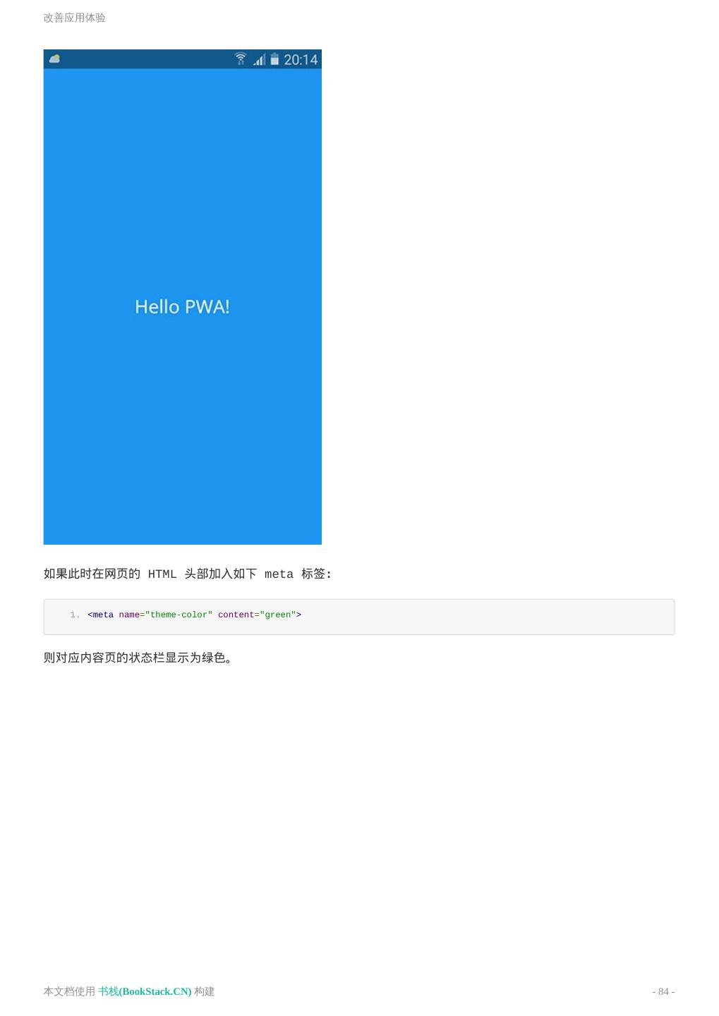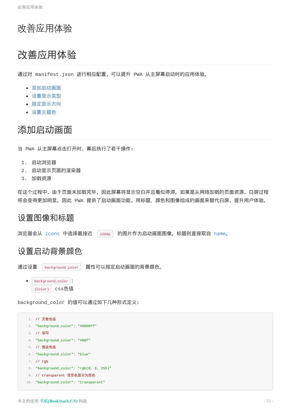 2 . 目 录 致谢 什么是 PWA 为什么是渐进式 离线和缓存 Service Worker Service Worker 简介 怎么使用 Service Worker Service Worker 生命周期 如何进行 Service Worker 调试 离线 UX 注意事项 Web存储 网页存储概览 Progressive Web App 的离线存储 利用 indexedDB 保持应用状态的最佳实践 吸引并留住用户 如何吸引并留住用户 将站点添加至首屏 manifest.json 简介 基本功能 改善应用体验 应用添加横幅 消息推送介绍 消息通知 通知 视觉部分 行为部分 常用实现 自动登录 介绍 传统“记住密码”功能实现 凭据管理 API 凭证管理 API 账号密码凭证管理 第三方登录凭证管理 网络安全 Web安全 本文档使用 书栈(BookStack.CN) 构建 - 2 -