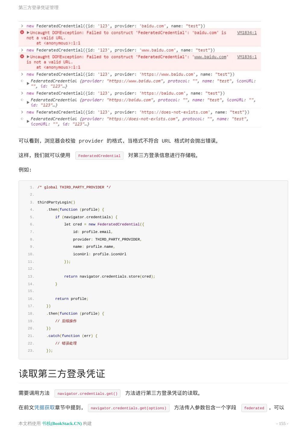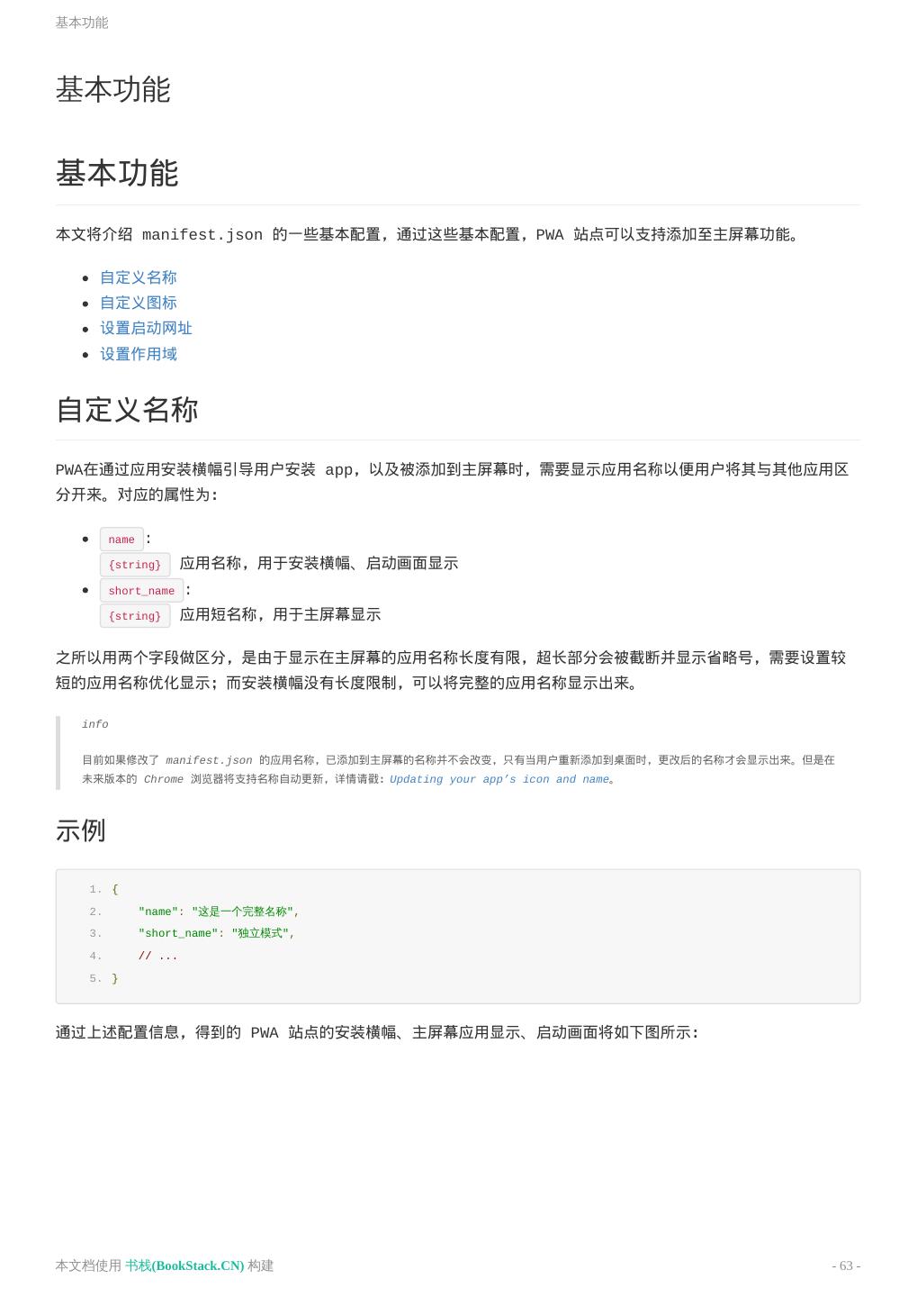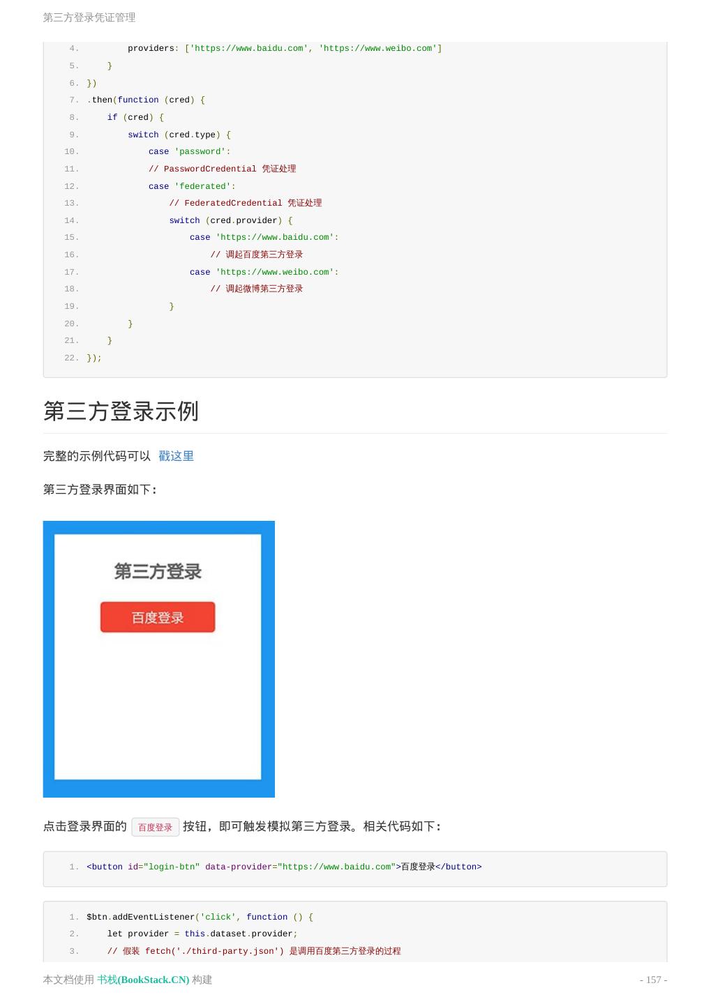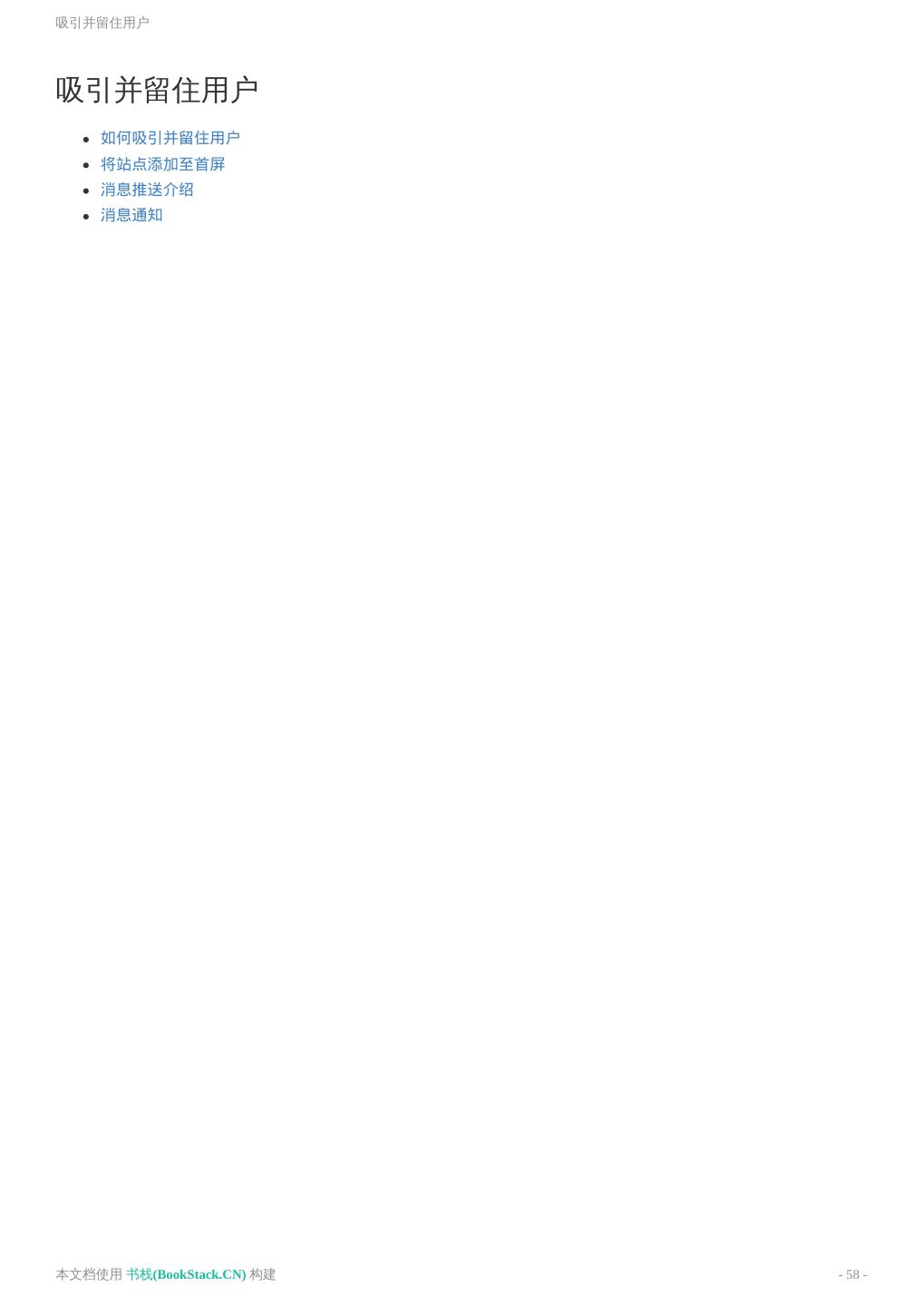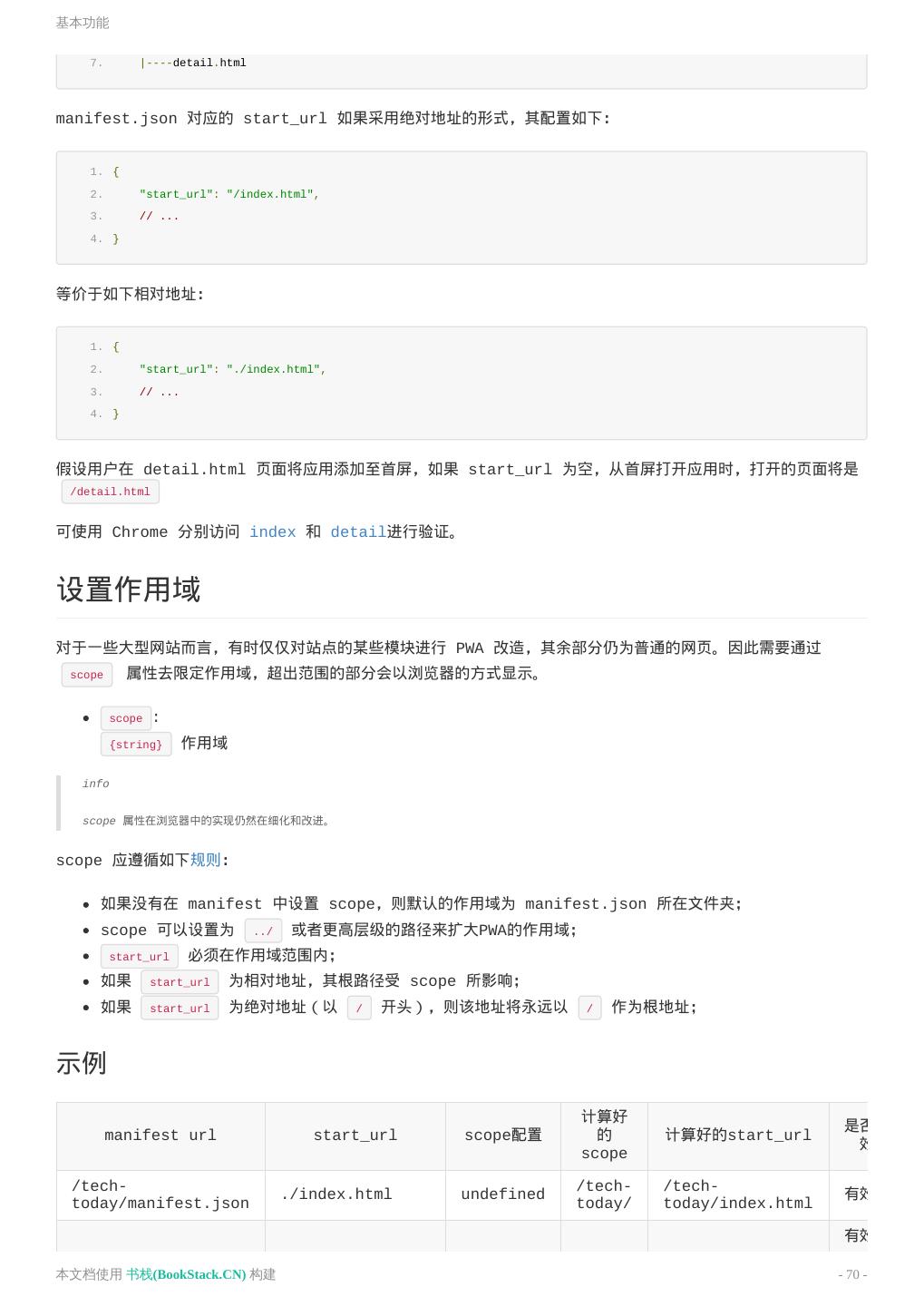 2 . 目 录 致谢 什么是 PWA 为什么是渐进式 离线和缓存 Service Worker Service Worker 简介 怎么使用 Service Worker Service Worker 生命周期 如何进行 Service Worker 调试 离线 UX 注意事项 Web存储 网页存储概览 Progressive Web App 的离线存储 利用 indexedDB 保持应用状态的最佳实践 吸引并留住用户 如何吸引并留住用户 将站点添加至首屏 manifest.json 简介 基本功能 改善应用体验 应用添加横幅 消息推送介绍 消息通知 通知 视觉部分 行为部分 常用实现 自动登录 介绍 传统“记住密码”功能实现 凭据管理 API 凭证管理 API 账号密码凭证管理 第三方登录凭证管理 网络安全 Web安全 本文档使用 书栈(BookStack.CN) 构建 - 2 -