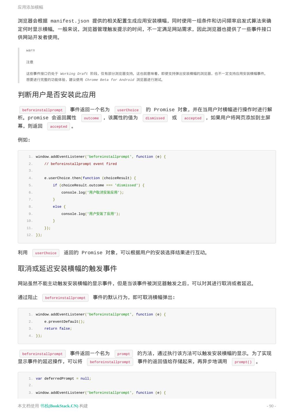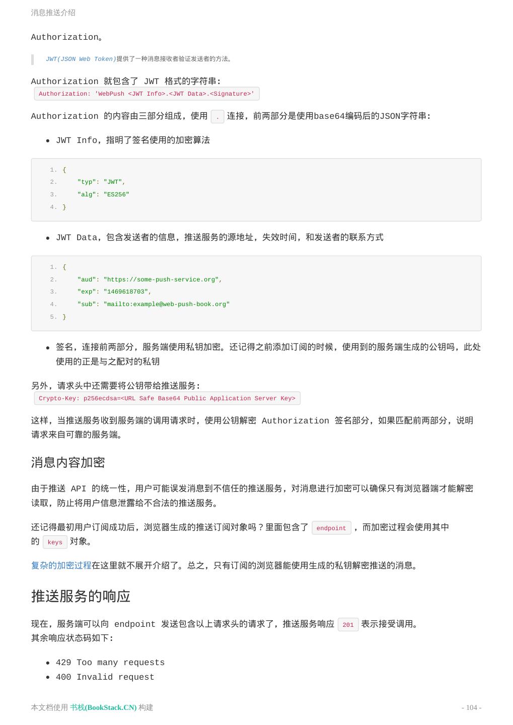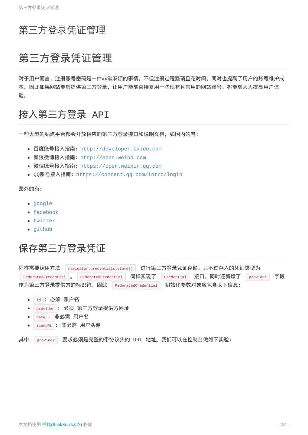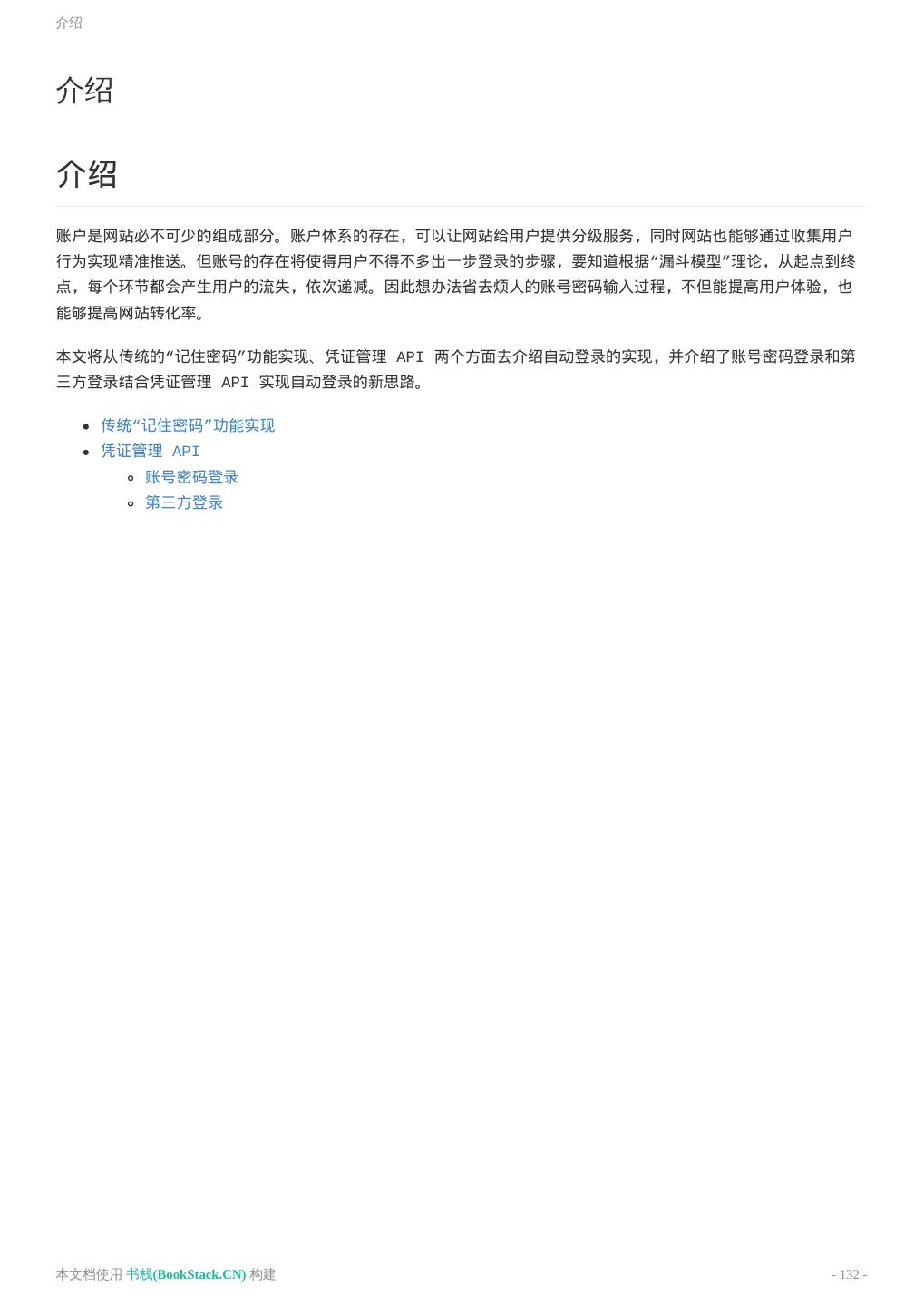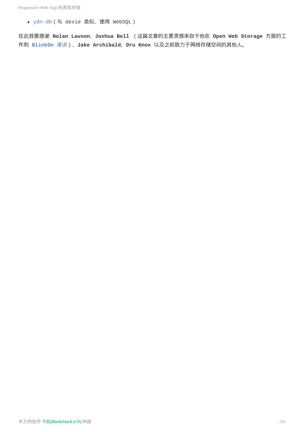 2 . 目 录 致谢 什么是 PWA 为什么是渐进式 离线和缓存 Service Worker Service Worker 简介 怎么使用 Service Worker Service Worker 生命周期 如何进行 Service Worker 调试 离线 UX 注意事项 Web存储 网页存储概览 Progressive Web App 的离线存储 利用 indexedDB 保持应用状态的最佳实践 吸引并留住用户 如何吸引并留住用户 将站点添加至首屏 manifest.json 简介 基本功能 改善应用体验 应用添加横幅 消息推送介绍 消息通知 通知 视觉部分 行为部分 常用实现 自动登录 介绍 传统“记住密码”功能实现 凭据管理 API 凭证管理 API 账号密码凭证管理 第三方登录凭证管理 网络安全 Web安全 本文档使用 书栈(BookStack.CN) 构建 - 2 -