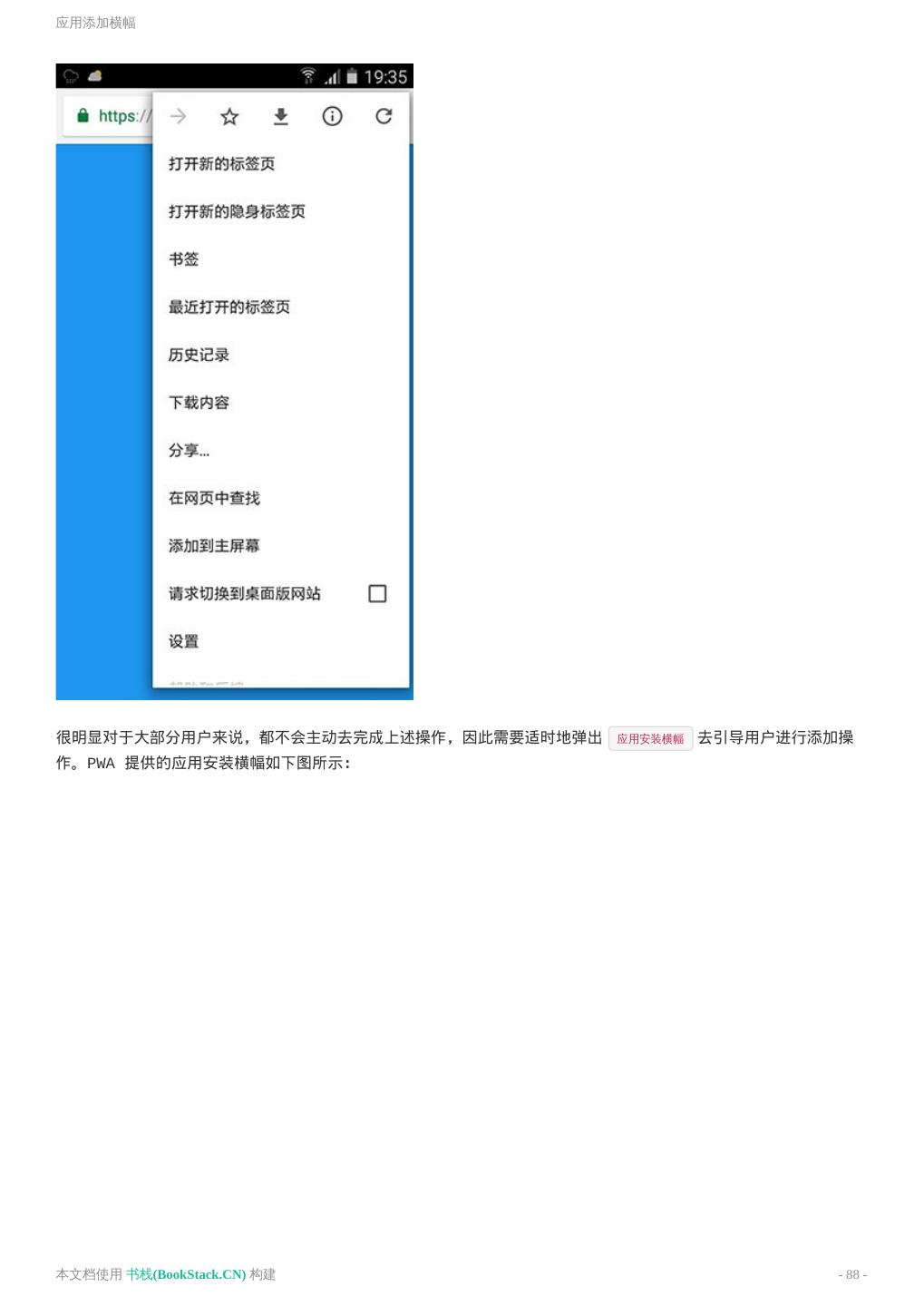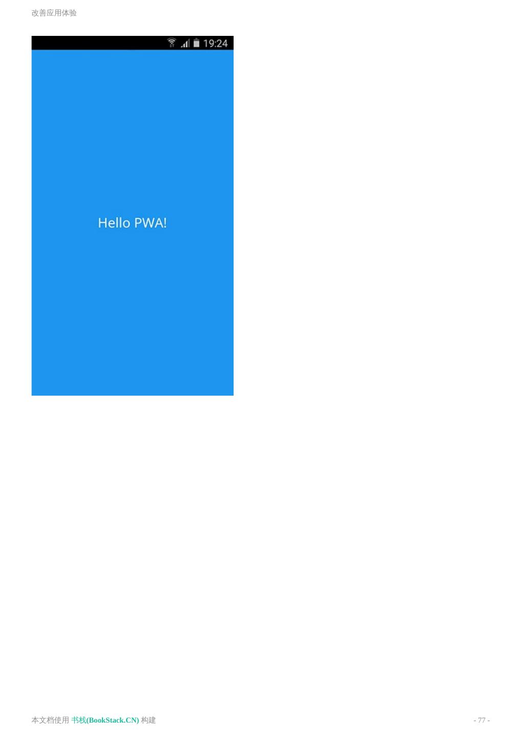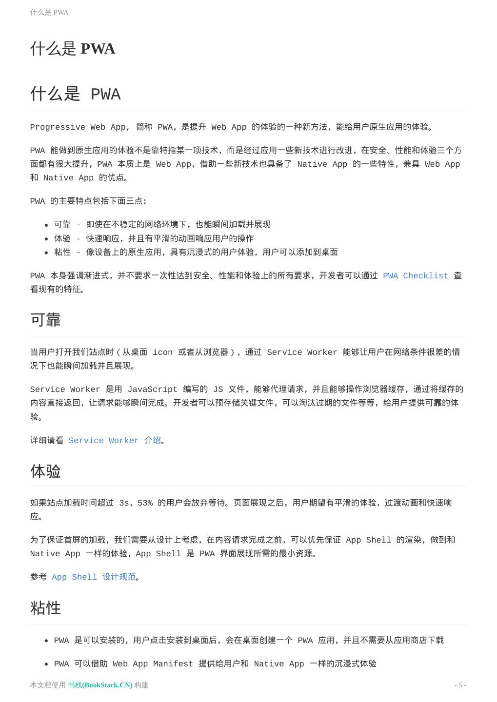 5 .什么是 PWA 什么是 PWA 什么是 PWA Progressive Web App, 简称 PWA,是提升 Web App 的体验的一种新方法,能给用户原生应用的体验。 PWA 能做到原生应用的体验不是靠特指某一项技术,而是经过应用一些新技术进行改进,在安全、性能和体验三个方 面都有很大提升,PWA 本质上是 Web App,借助一些新技术也具备了 Native App 的一些特性,兼具 Web App 和 Native App 的优点。 PWA 的主要特点包括下面三点: 可靠 - 即使在不稳定的网络环境下,也能瞬间加载并展现 体验 - 快速响应,并且有平滑的动画响应用户的操作 粘性 - 像设备上的原生应用,具有沉浸式的用户体验,用户可以添加到桌面 PWA 本身强调渐进式,并不要求一次性达到安全、性能和体验上的所有要求,开发者可以通过 PWA Checklist 查 看现有的特征。 可靠 当用户打开我们站点时(从桌面 icon 或者从浏览器),通过 Service Worker 能够让用户在网络条件很差的情 况下也能瞬间加载并且展现。 Service Worker 是用 JavaScript 编写的 JS 文件,能够代理请求,并且能够操作浏览器缓存,通过将缓存的 内容直接返回,让请求能够瞬间完成。开发者可以预存储关键文件,可以淘汰过期的文件等等,给用户提供可靠的体 验。 详细请看 Service Worker 介绍。 体验 如果站点加载时间超过 3s,53% 的用户会放弃等待。页面展现之后,用户期望有平滑的体验,过渡动画和快速响 应。 为了保证首屏的加载,我们需要从设计上考虑,在内容请求完成之前,可以优先保证 App Shell 的渲染,做到和 Native App 一样的体验,App Shell 是 PWA 界面展现所需的最小资源。 参考 App Shell 设计规范。 粘性 PWA 是可以安装的,用户点击安装到桌面后,会在桌面创建一个 PWA 应用,并且不需要从应用商店下载 PWA 可以借助 Web App Manifest 提供给用户和 Native App 一样的沉浸式体验 本文档使用 书栈(BookStack.CN) 构建 - 5 -