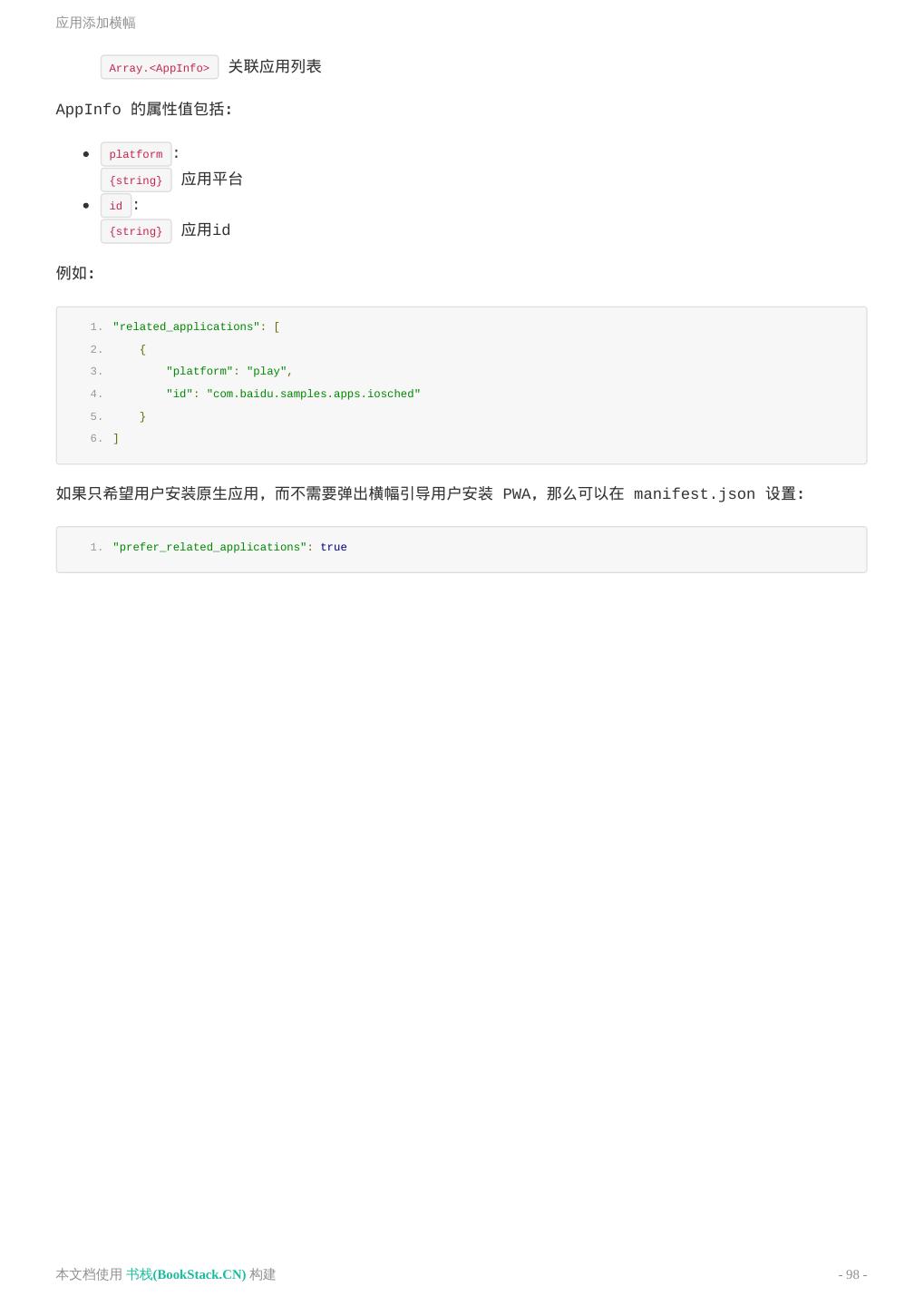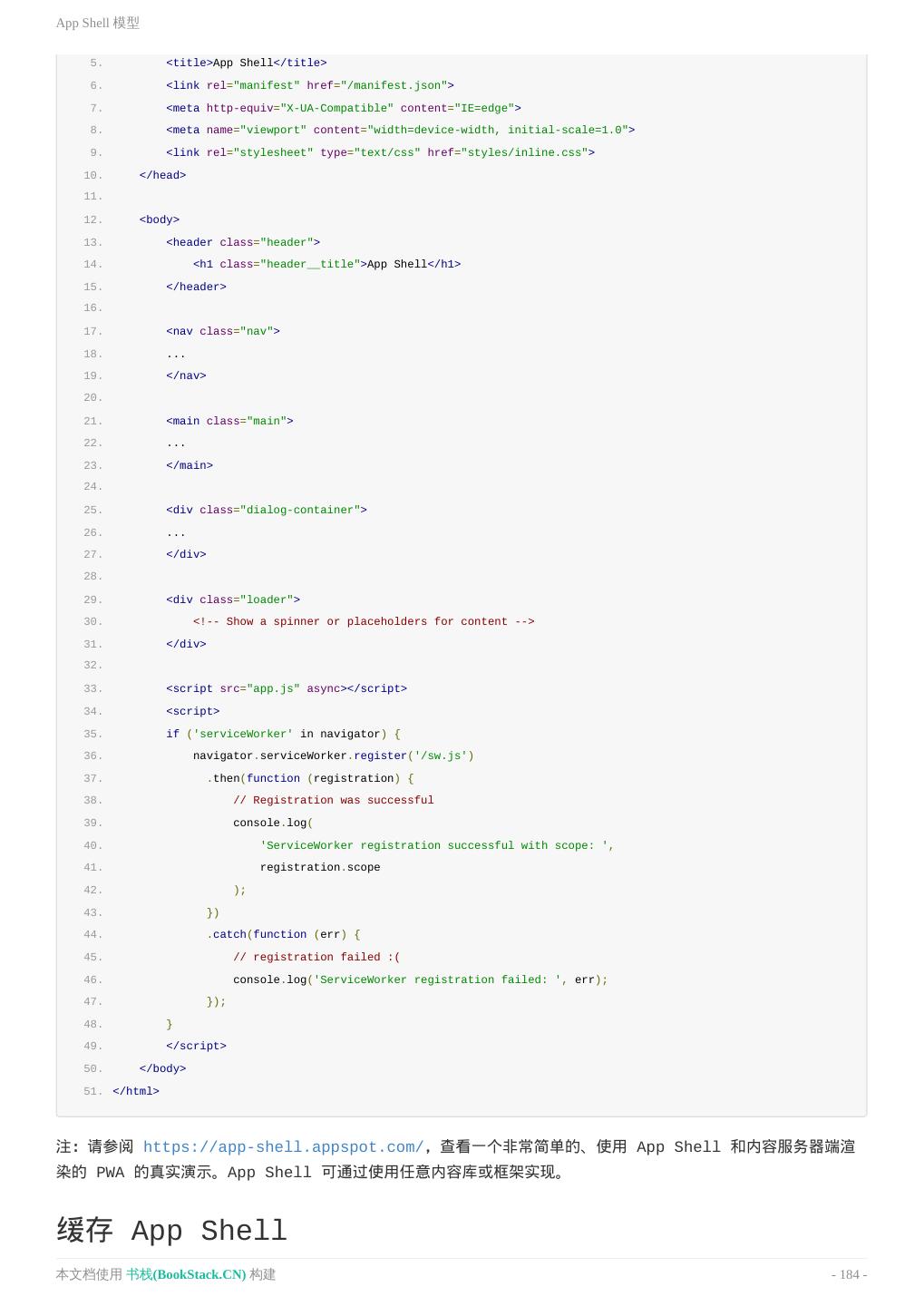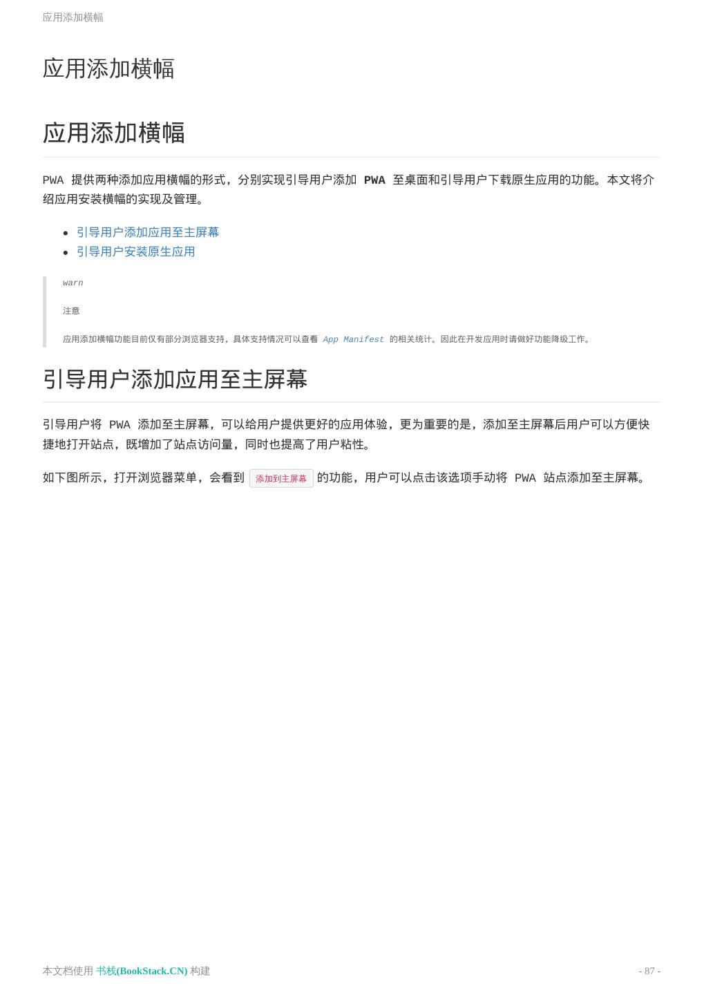 5 .什么是 PWA 什么是 PWA 什么是 PWA Progressive Web App, 简称 PWA,是提升 Web App 的体验的一种新方法,能给用户原生应用的体验。 PWA 能做到原生应用的体验不是靠特指某一项技术,而是经过应用一些新技术进行改进,在安全、性能和体验三个方 面都有很大提升,PWA 本质上是 Web App,借助一些新技术也具备了 Native App 的一些特性,兼具 Web App 和 Native App 的优点。 PWA 的主要特点包括下面三点: 可靠 - 即使在不稳定的网络环境下,也能瞬间加载并展现 体验 - 快速响应,并且有平滑的动画响应用户的操作 粘性 - 像设备上的原生应用,具有沉浸式的用户体验,用户可以添加到桌面 PWA 本身强调渐进式,并不要求一次性达到安全、性能和体验上的所有要求,开发者可以通过 PWA Checklist 查 看现有的特征。 可靠 当用户打开我们站点时(从桌面 icon 或者从浏览器),通过 Service Worker 能够让用户在网络条件很差的情 况下也能瞬间加载并且展现。 Service Worker 是用 JavaScript 编写的 JS 文件,能够代理请求,并且能够操作浏览器缓存,通过将缓存的 内容直接返回,让请求能够瞬间完成。开发者可以预存储关键文件,可以淘汰过期的文件等等,给用户提供可靠的体 验。 详细请看 Service Worker 介绍。 体验 如果站点加载时间超过 3s,53% 的用户会放弃等待。页面展现之后,用户期望有平滑的体验,过渡动画和快速响 应。 为了保证首屏的加载,我们需要从设计上考虑,在内容请求完成之前,可以优先保证 App Shell 的渲染,做到和 Native App 一样的体验,App Shell 是 PWA 界面展现所需的最小资源。 参考 App Shell 设计规范。 粘性 PWA 是可以安装的,用户点击安装到桌面后,会在桌面创建一个 PWA 应用,并且不需要从应用商店下载 PWA 可以借助 Web App Manifest 提供给用户和 Native App 一样的沉浸式体验 本文档使用 书栈(BookStack.CN) 构建 - 5 -