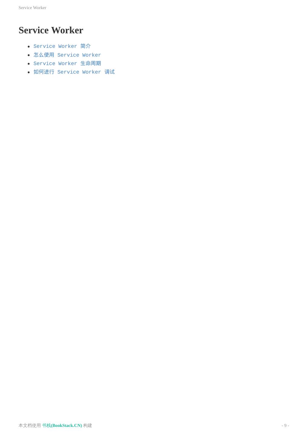 9 .Service Worker Service Worker Service Worker 简介 怎么使用 Service Worker Service Worker 生命周期 如何进行 Service Worker 调试 本文档使用 书栈(BookStack.CN) 构建 - 9 -