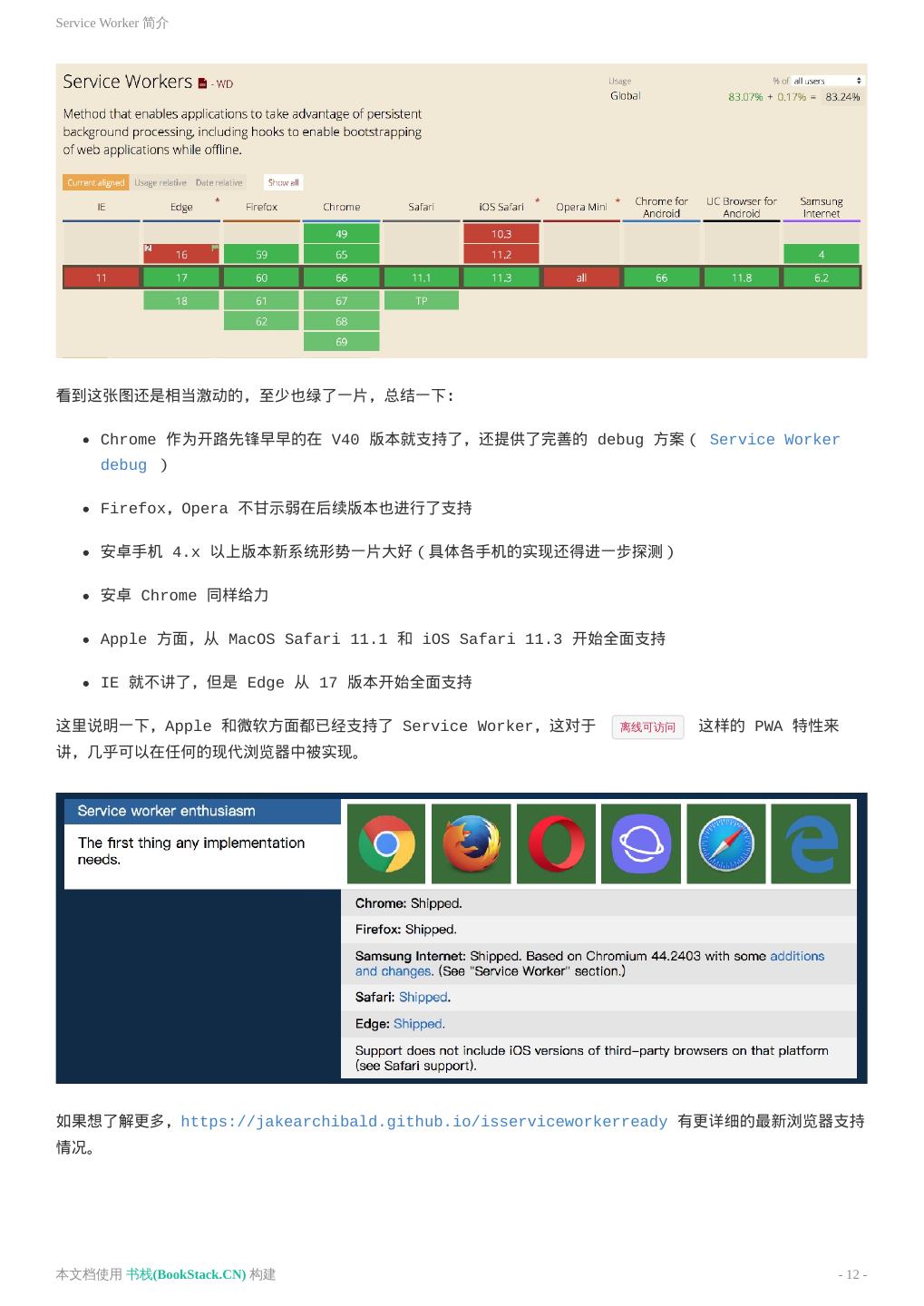 12 .Service Worker 简介 看到这张图还是相当激动的,至少也绿了一片,总结一下: Chrome 作为开路先锋早早的在 V40 版本就支持了,还提供了完善的 debug 方案( Service Worker debug ) Firefox,Opera 不甘示弱在后续版本也进行了支持 安卓手机 4.x 以上版本新系统形势一片大好(具体各手机的实现还得进一步探测) 安卓 Chrome 同样给力 Apple 方面,从 MacOS Safari 11.1 和 iOS Safari 11.3 开始全面支持 IE 就不讲了,但是 Edge 从 17 版本开始全面支持 这里说明一下,Apple 和微软方面都已经支持了 Service Worker,这对于 离线可访问 这样的 PWA 特性来 讲,几乎可以在任何的现代浏览器中被实现。 如果想了解更多,https://jakearchibald.github.io/isserviceworkerready 有更详细的最新浏览器支持 情况。 本文档使用 书栈(BookStack.CN) 构建 - 12 -