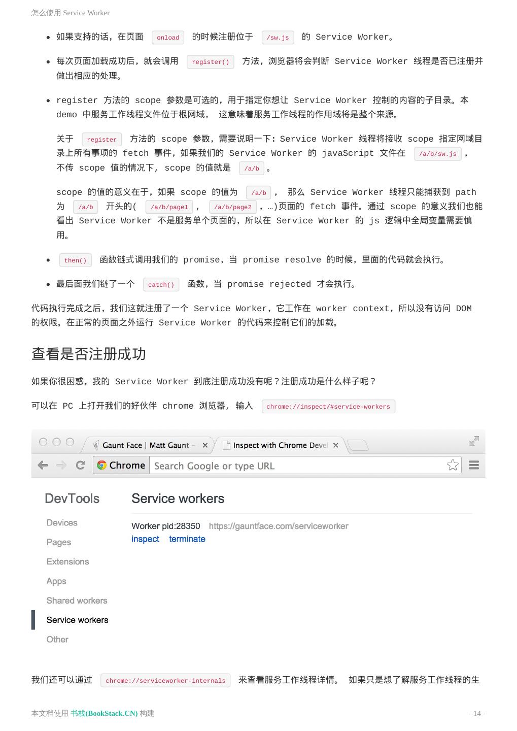 14 .怎么使用 Service Worker 如果支持的话,在页面 onload 的时候注册位于 /sw.js 的 Service Worker。 每次页面加载成功后,就会调用 register() 方法,浏览器将会判断 Service Worker 线程是否已注册并 做出相应的处理。 register 方法的 scope 参数是可选的,用于指定你想让 Service Worker 控制的内容的子目录。本 demo 中服务工作线程文件位于根网域, 这意味着服务工作线程的作用域将是整个来源。 关于 register 方法的 scope 参数,需要说明一下:Service Worker 线程将接收 scope 指定网域目 录上所有事项的 fetch 事件,如果我们的 Service Worker 的 javaScript 文件在 /a/b/sw.js , 不传 scope 值的情况下, scope 的值就是 /a/b 。 scope 的值的意义在于,如果 scope 的值为 /a/b , 那么 Service Worker 线程只能捕获到 path 为 /a/b 开头的( /a/b/page1 , /a/b/page2 ,…)页面的 fetch 事件。通过 scope 的意义我们也能 看出 Service Worker 不是服务单个页面的,所以在 Service Worker 的 js 逻辑中全局变量需要慎 用。 then() 函数链式调用我们的 promise,当 promise resolve 的时候,里面的代码就会执行。 最后面我们链了一个 catch() 函数,当 promise rejected 才会执行。 代码执行完成之后,我们这就注册了一个 Service Worker,它工作在 worker context,所以没有访问 DOM 的权限。在正常的页面之外运行 Service Worker 的代码来控制它们的加载。 查看是否注册成功 如果你很困惑,我的 Service Worker 到底注册成功没有呢?注册成功是什么样子呢? 可以在 PC 上打开我们的好伙伴 chrome 浏览器, 输入 chrome://inspect/#service-workers 我们还可以通过 chrome://serviceworker-internals 来查看服务工作线程详情。 如果只是想了解服务工作线程的生 本文档使用 书栈(BookStack.CN) 构建 - 14 -